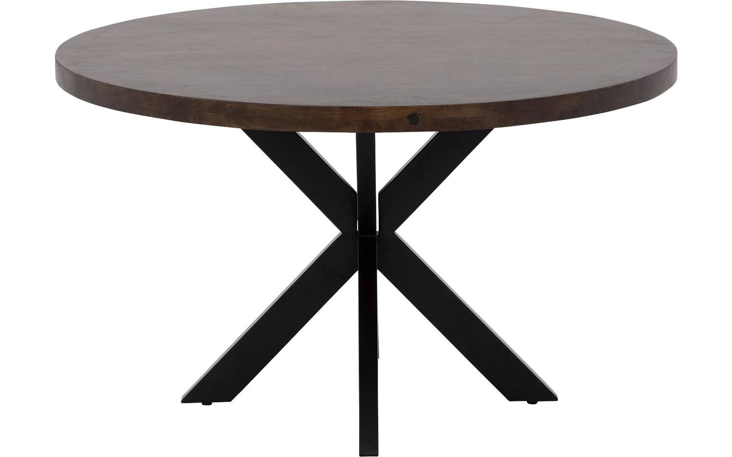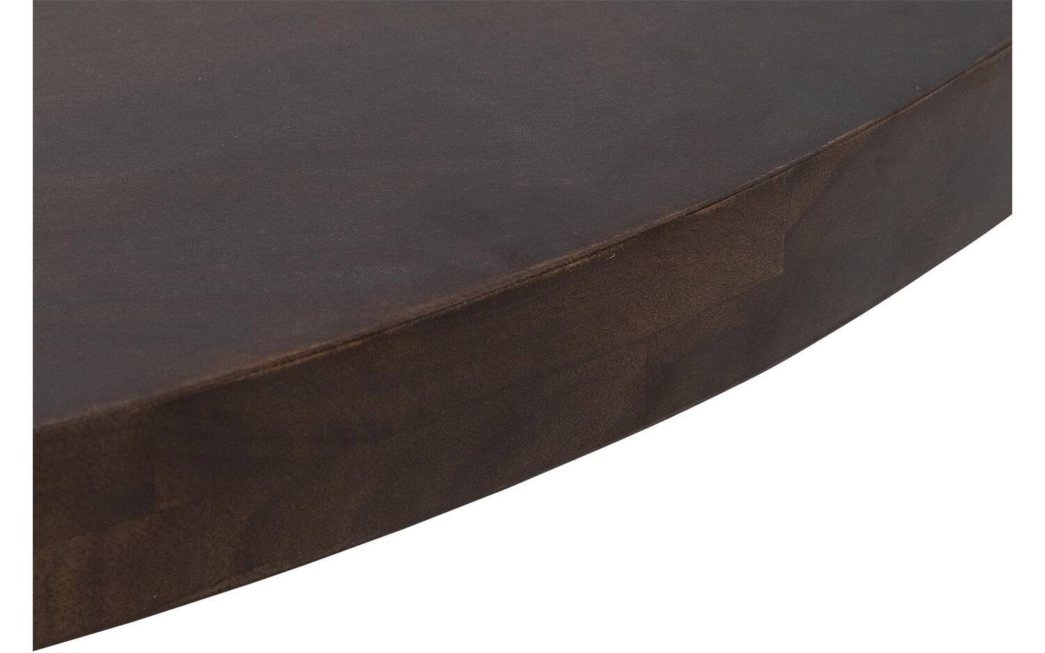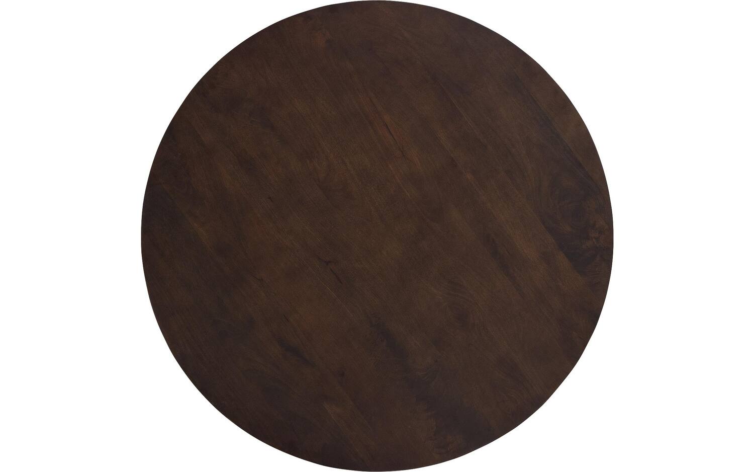 Het ronde tafelblad is gemaakt van duurzaam mangohout met een gelakte afwerking. Deze laklaag beschermt tegen vlekken en zorgt ervoor dat de natuurlijke tekening van het hout mooi uitkomt. Het mangohout heeft een warme notenkleur die sfeer brengt in elke eetkamer.