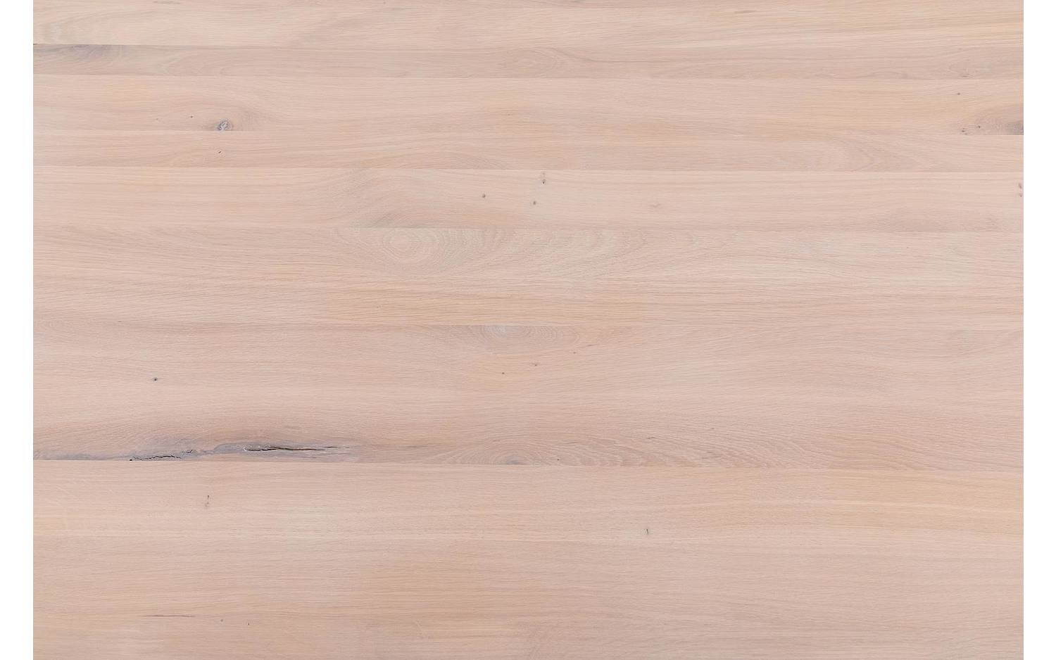 Het eikenhouten blad heeft een natuurlijke geborstelde structuur en is afgewerkt met een gelakte laag. Deze bescherming maakt de kans op vlekken klein zonder de natuurlijke uitstraling van het hout aan te tasten. Het eiken is zeer sterk, waardoor je jarenlang plezier hebt van je aankoop.