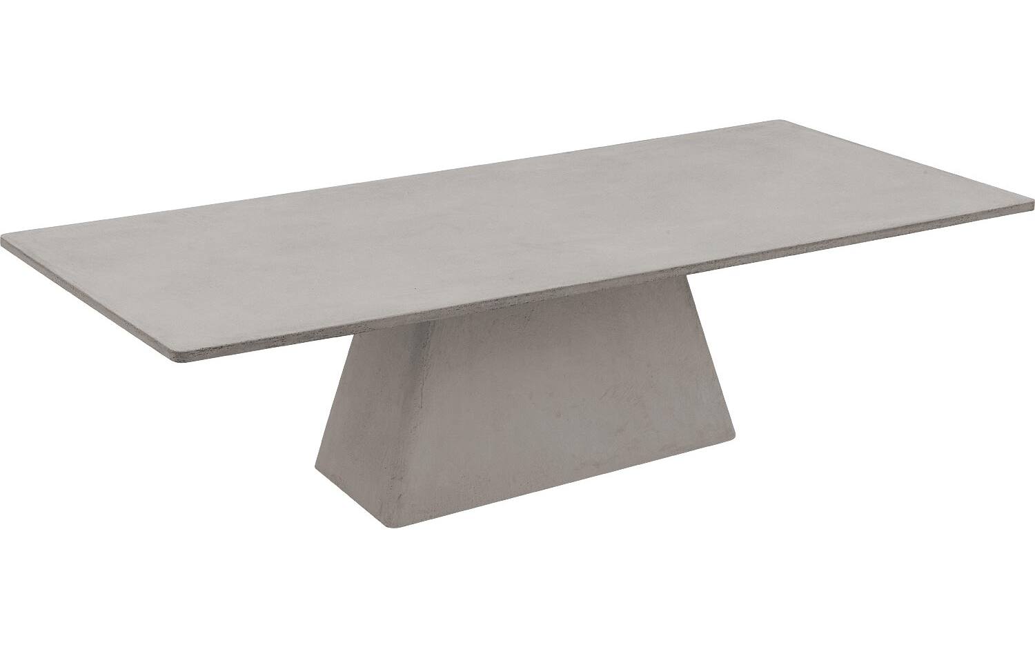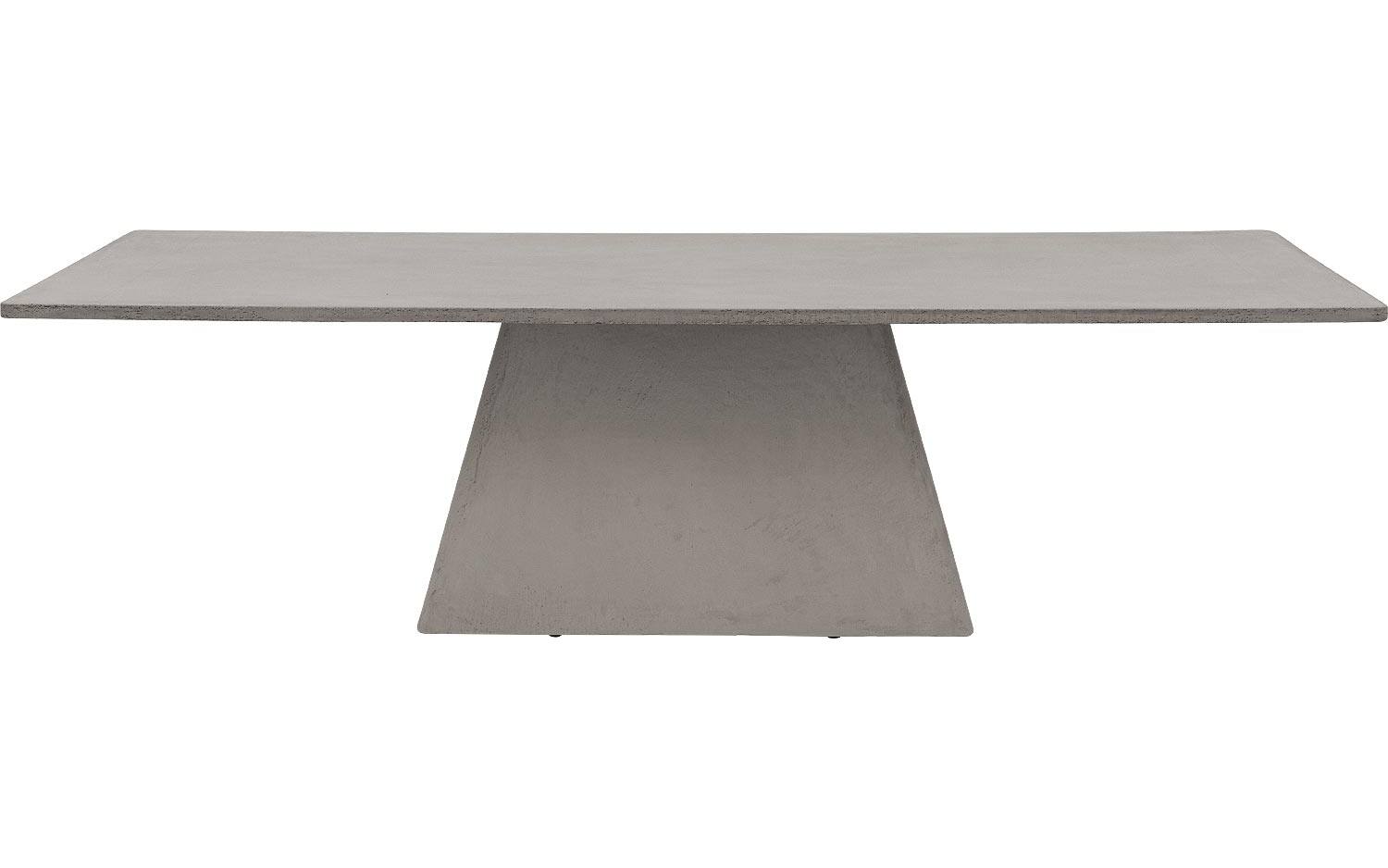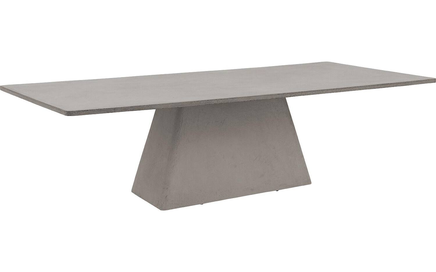 De rechthoekige poten van 110 x 45 cm zijn uitgevoerd in dezelfde betonkleur als het blad. De rechte randafwerking geeft het geheel een strakke, moderne look die past bij het industriële karakter.