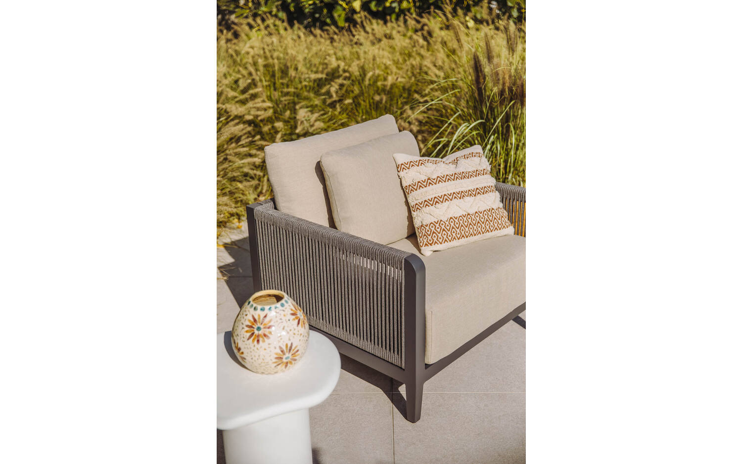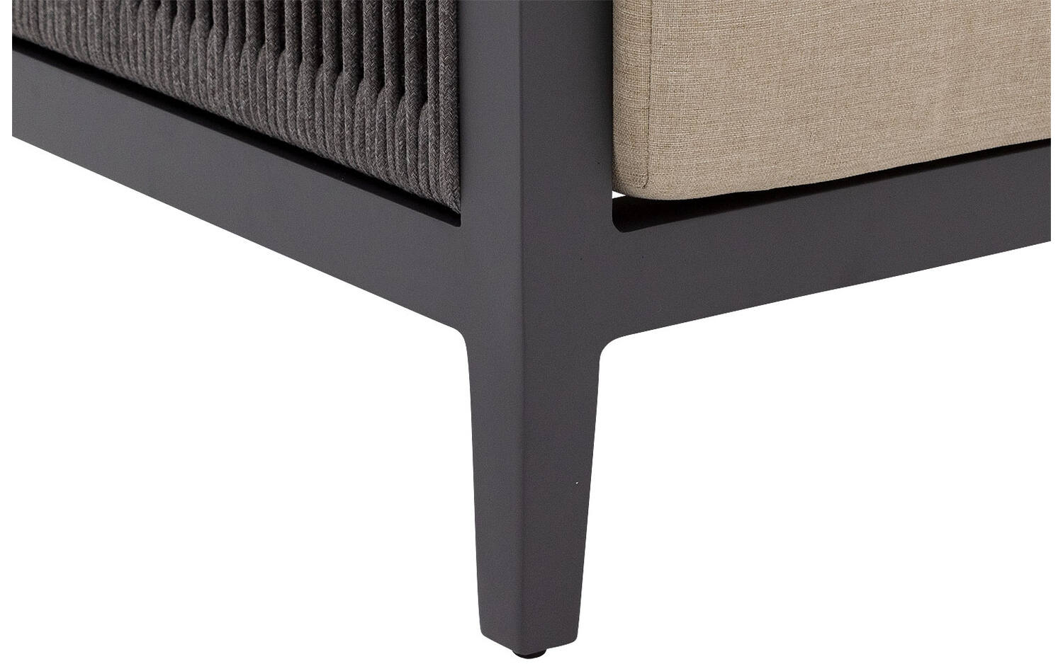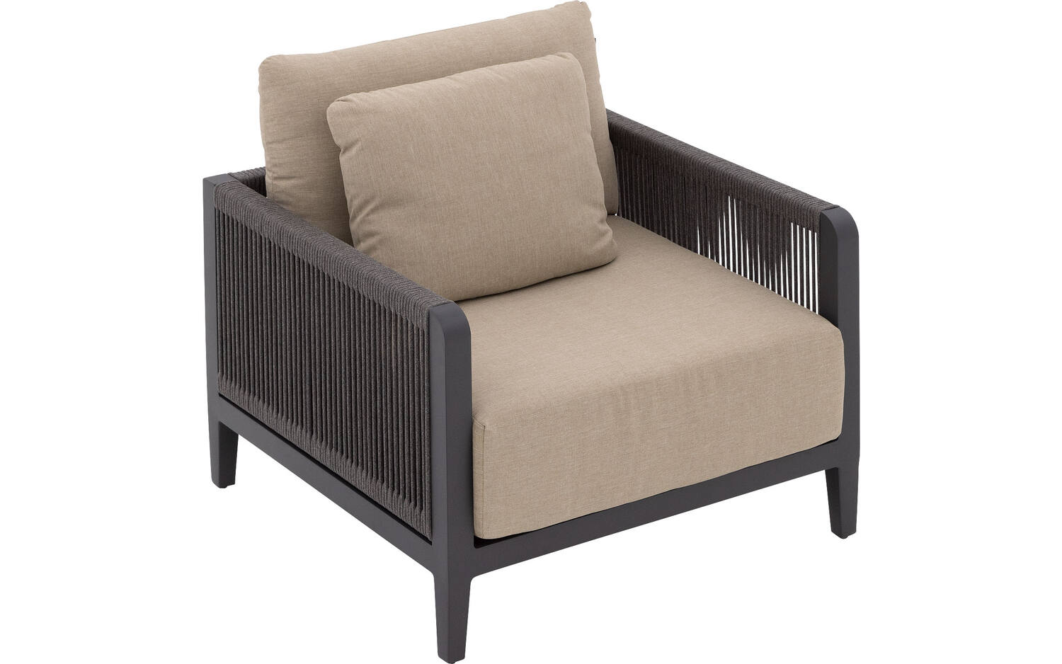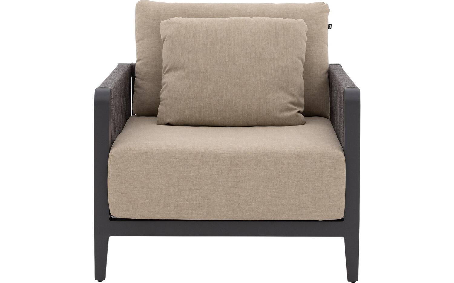 Tuinfauteuil Yngvar valt op door het stijlvolle contrast tussen het antracietkleurige aluminium frame en de warme zandkleurige kussens. De zij- en achterkant zijn sfeervol afgewerkt met donker touw, wat voor een speels accent zorgt. De afgeronde hoeken geven de stoel een zachte, uitnodigende uitstraling.