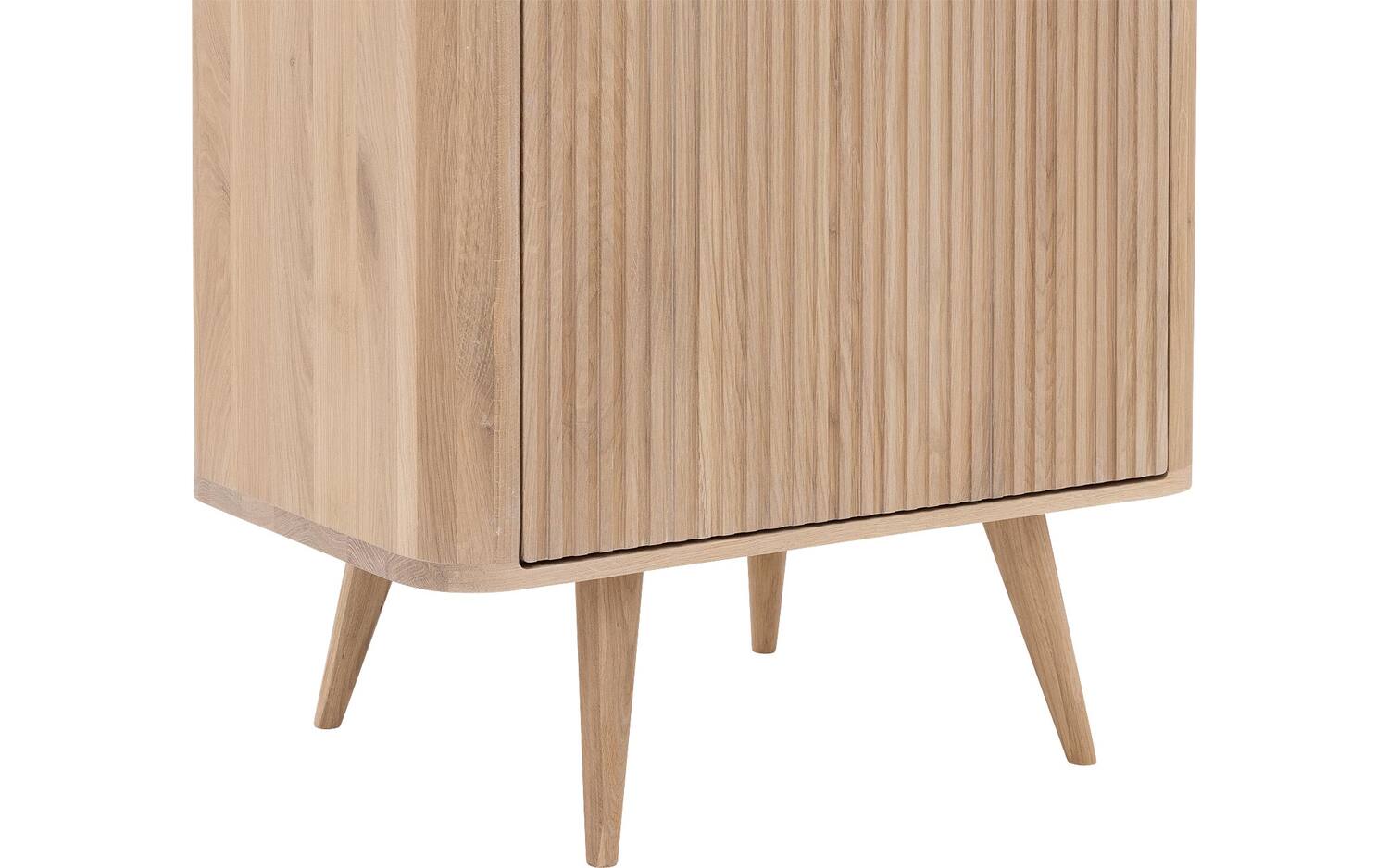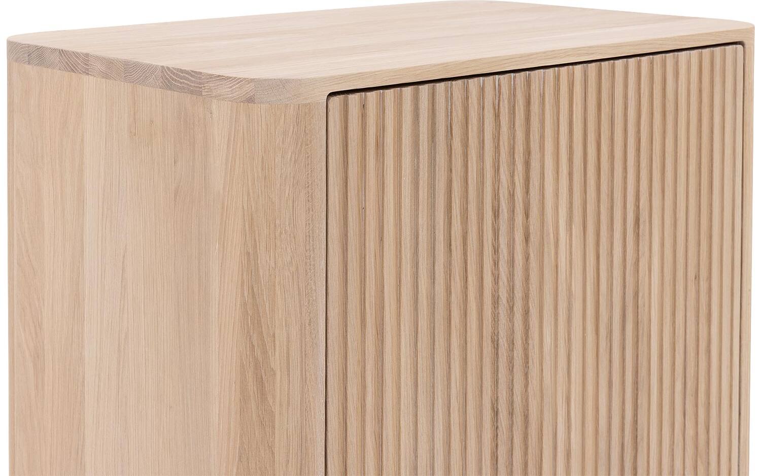 De warme eiken afwerking met witte olie geeft deze opbergkast een natuurlijke, rustgevende uitstraling. Het retro design met ronde vormen voegt speelsheid toe aan je interieur, zonder druk te worden. Perfect staand geplaatst in woonkamer, slaapkamer of studeerkamer.