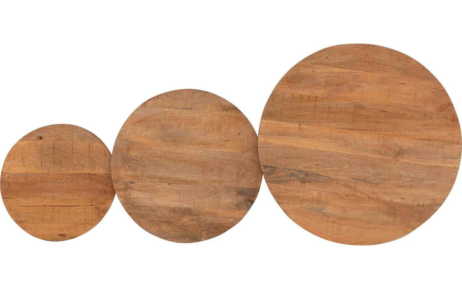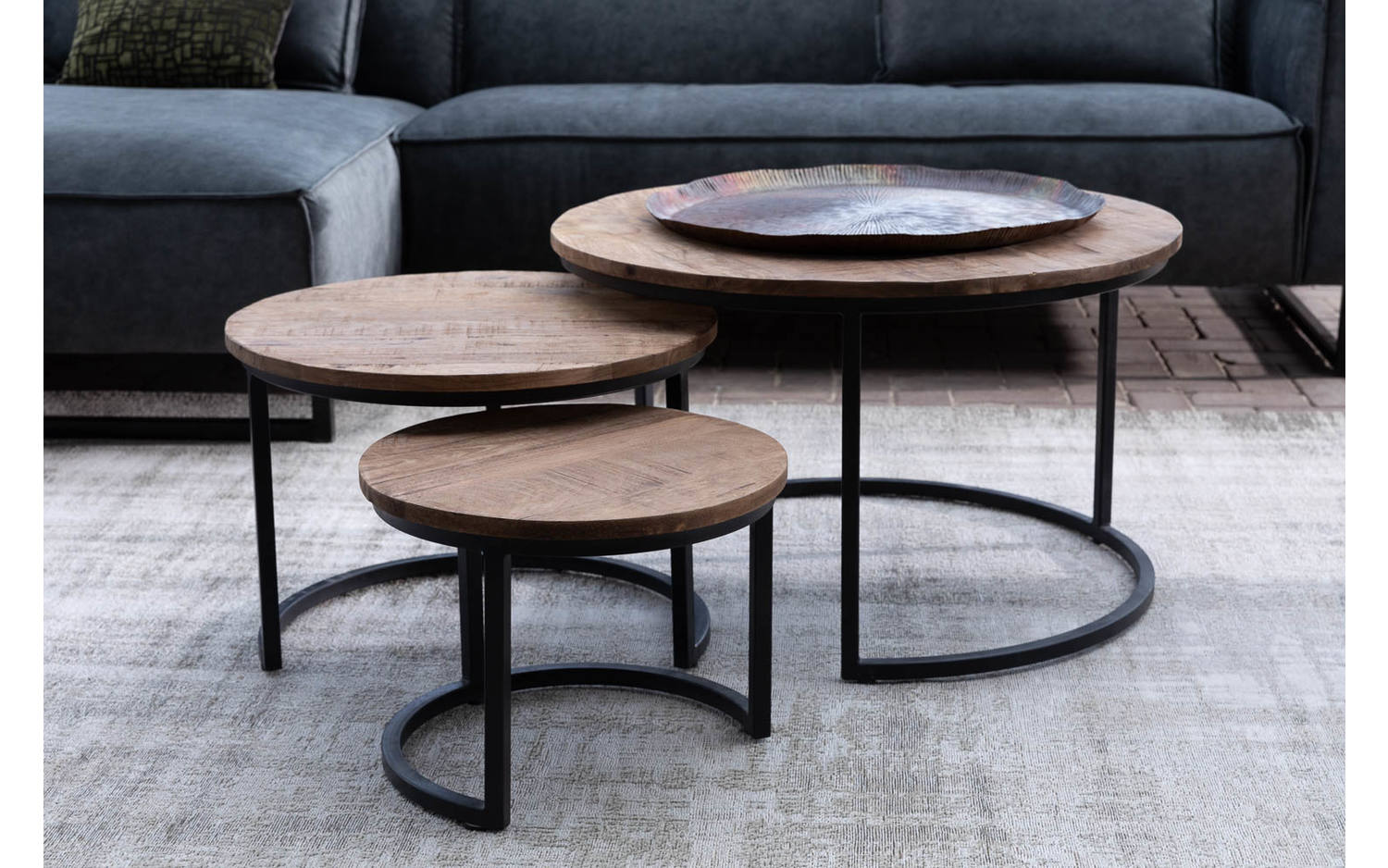 Salontafels Jelle XL brengen flexibiliteit en stijl samen in jouw woonkamer. Deze set van drie ronde mangohouten salontafels met zwarte stalen poten laat je spelen met verschillende opstellingen...