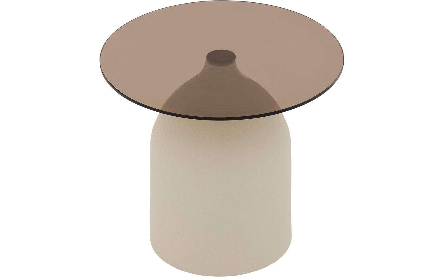 Salontafel Niva heeft een ronde vorm die zorgt voor een zachte, toegankelijke uitstraling. Het rookglazen blad geeft de tafel een subtiele elegantie, terwijl de ronde beige poten voor een warme basis zorgen. Door het transparante karakter van het glas blijft je ruimte optisch open en licht.
