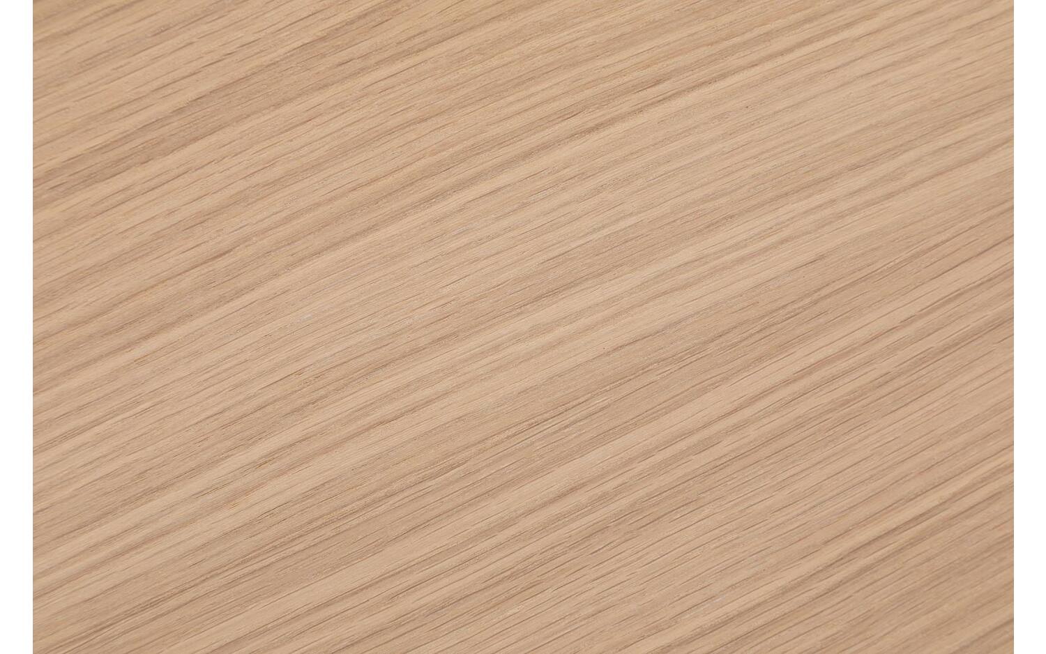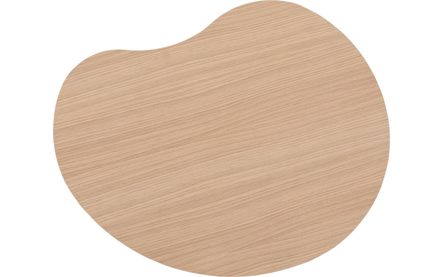 Het tafelblad is gemaakt van eikenfineer met een witte olie-afwerking. Deze behandeling beschermt het hout tegen vlekken en kringen, terwijl de natuurlijke houtstructuur zichtbaar blijft. De organische randafwerking geeft Saya zijn unieke, speelse karakter.