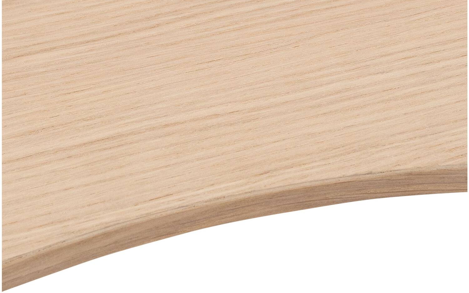 Het tafelblad is gemaakt van eikenfineer en heeft een witte olie-afwerking. Deze behandeling zorgt ervoor dat het hout zijn natuurlijke karakter behoudt, maar wel beschermd is tegen vlekken en kringen. De organische randen geven het blad een zachte, bijna sculptuurlijke uitstraling.