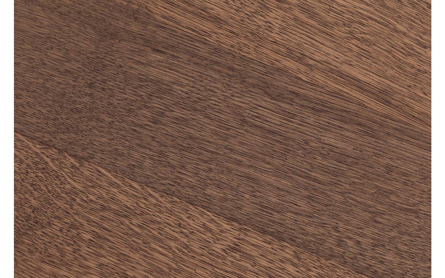 Het eikenhouten tafelblad is afgewerkt met soft touch lak in notenkleur. Deze laklaag houdt de natuurlijke matte uitstraling van het hout intact en zorgt voor minder kans op kringen en krasjes. De houtnerfstructuur blijft mooi zichtbaar en voelbaar.