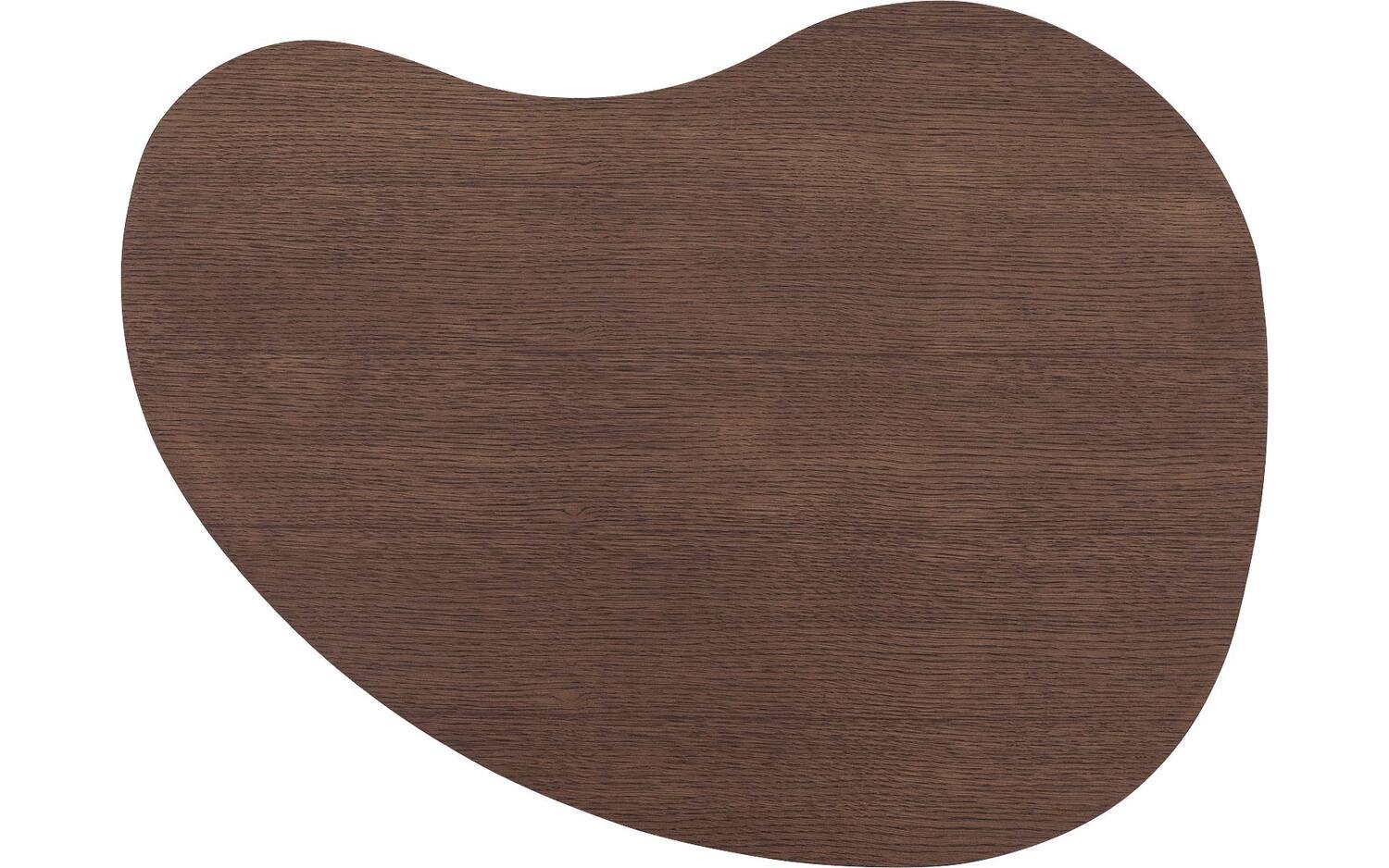 Het tafelblad van eikenfineer heeft een warme notenkleur en is afgewerkt met soft touch lak. Deze beschermlaag houdt de natuurlijke matte uitstraling intact terwijl de houtnerf zichtbaar en voelbaar blijft. De lak vermindert de kans op kringen en krasjes aanzienlijk.
