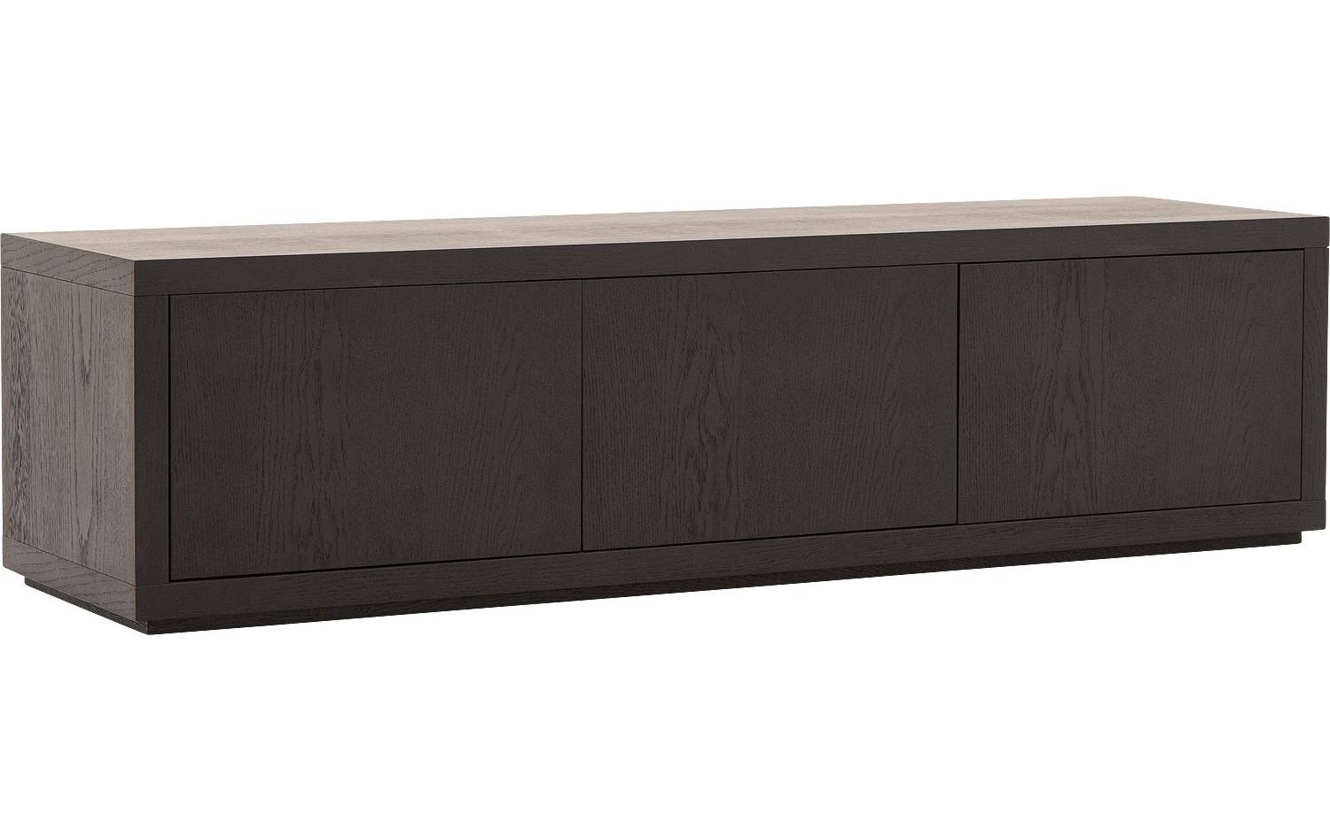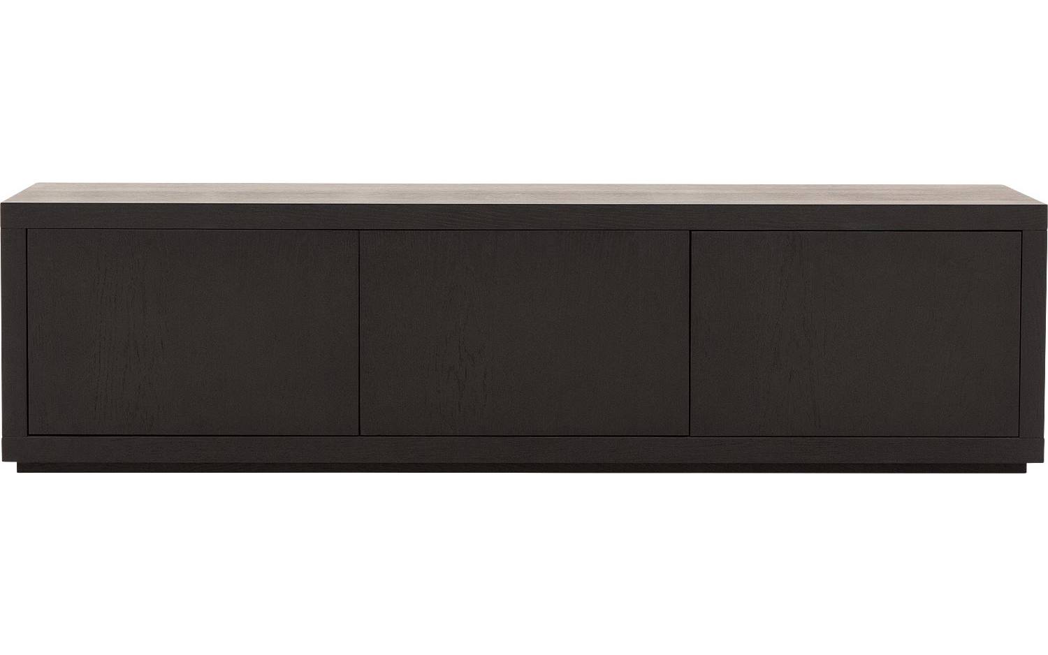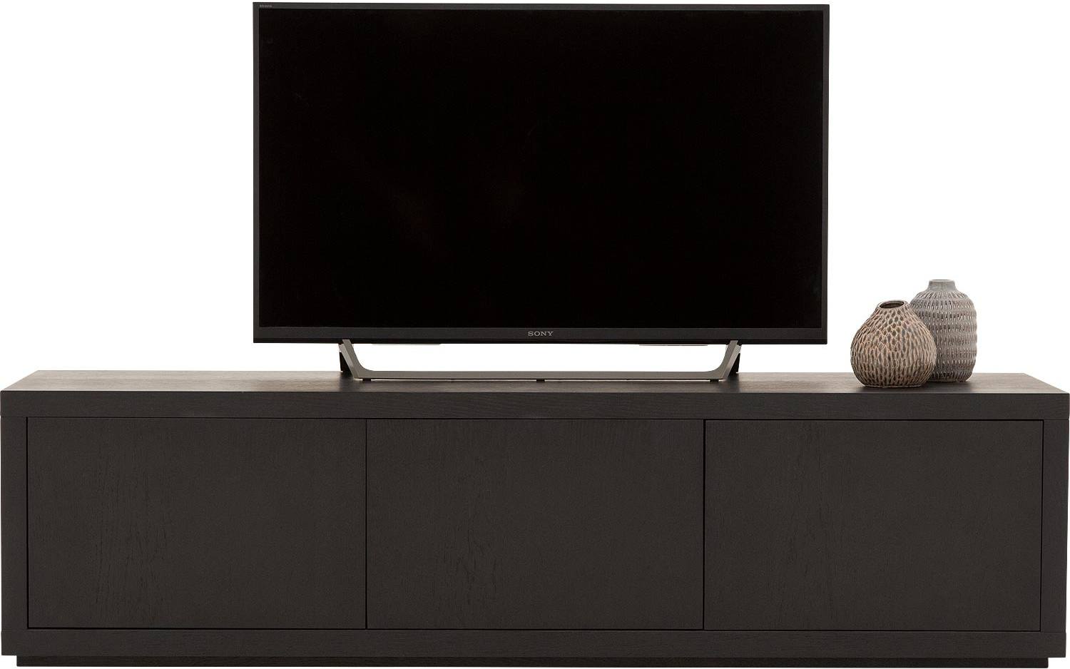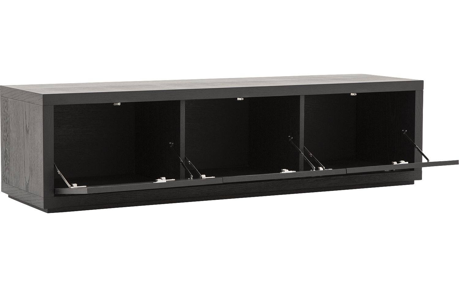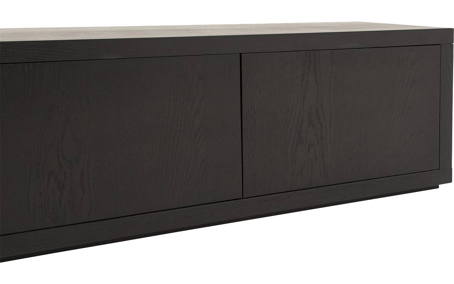 TV meubel Barcelona biedt stoere elegantie met een natuurlijke houtnerfstructuur in zwart gelakt eiken. De drie greeploze kleppen met push to open systeem zorgen voor een strakke uitstraling, terwijl je alle apparatuur netjes uit het zicht kunt bergen. Een echte eyecatcher die zowel staand als hangend perfect tot zijn recht komt in jouw woonkamer.