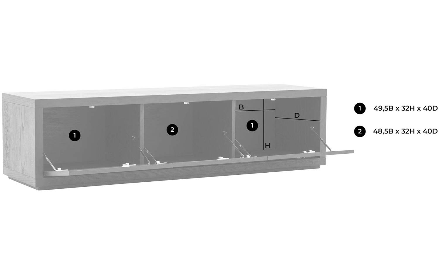 Met zijn formaat van 160 x 40 x 45 cm biedt Barcelona volop ruimte voor je tv-apparatuur, spelconsoles en andere accessoires. Door de mogelijkheid om het meubel zowel staand als hangend te plaatsen, past het perfect in elk interieur en bij elke ruimte-indeling.