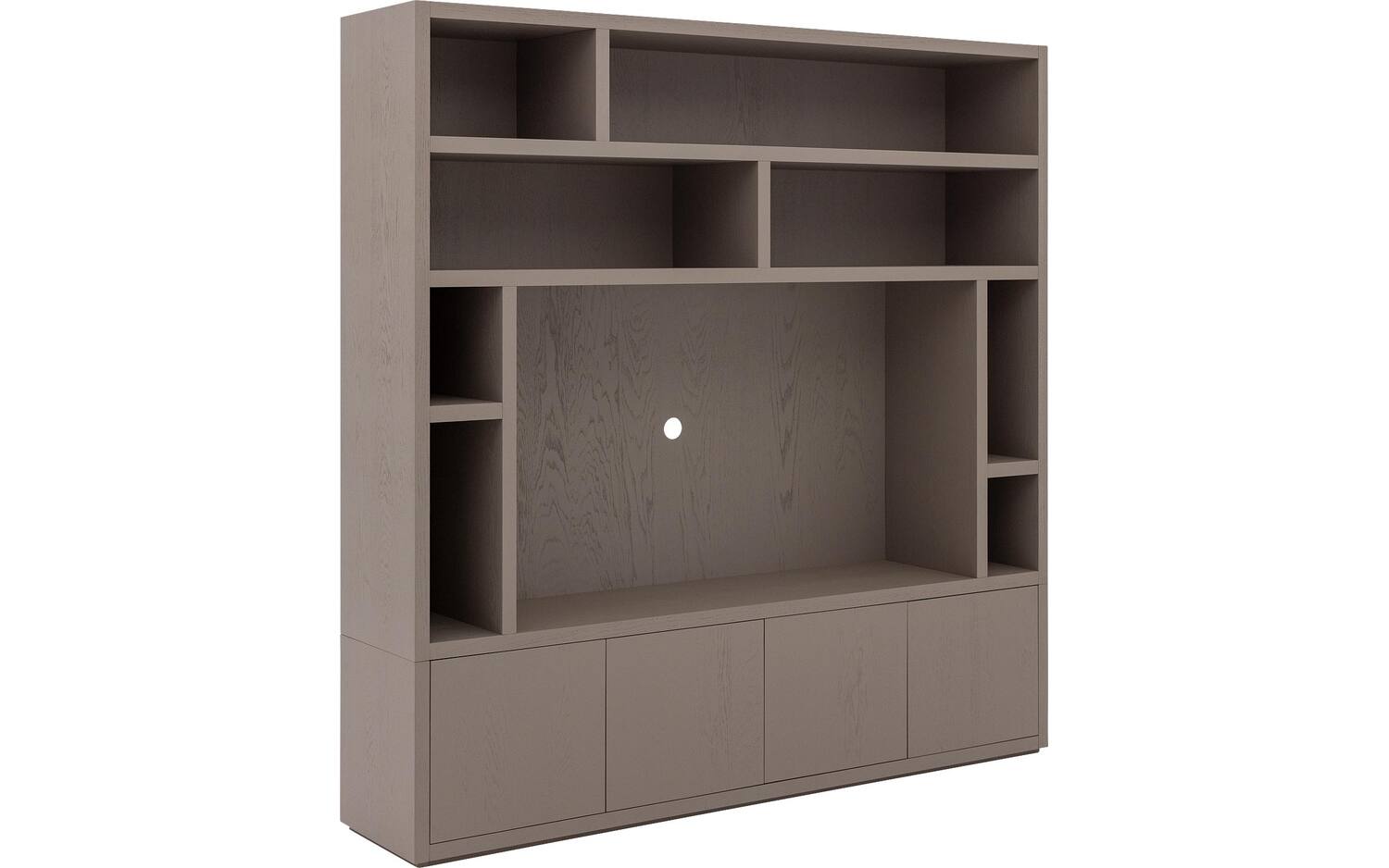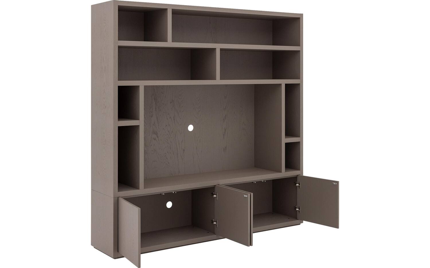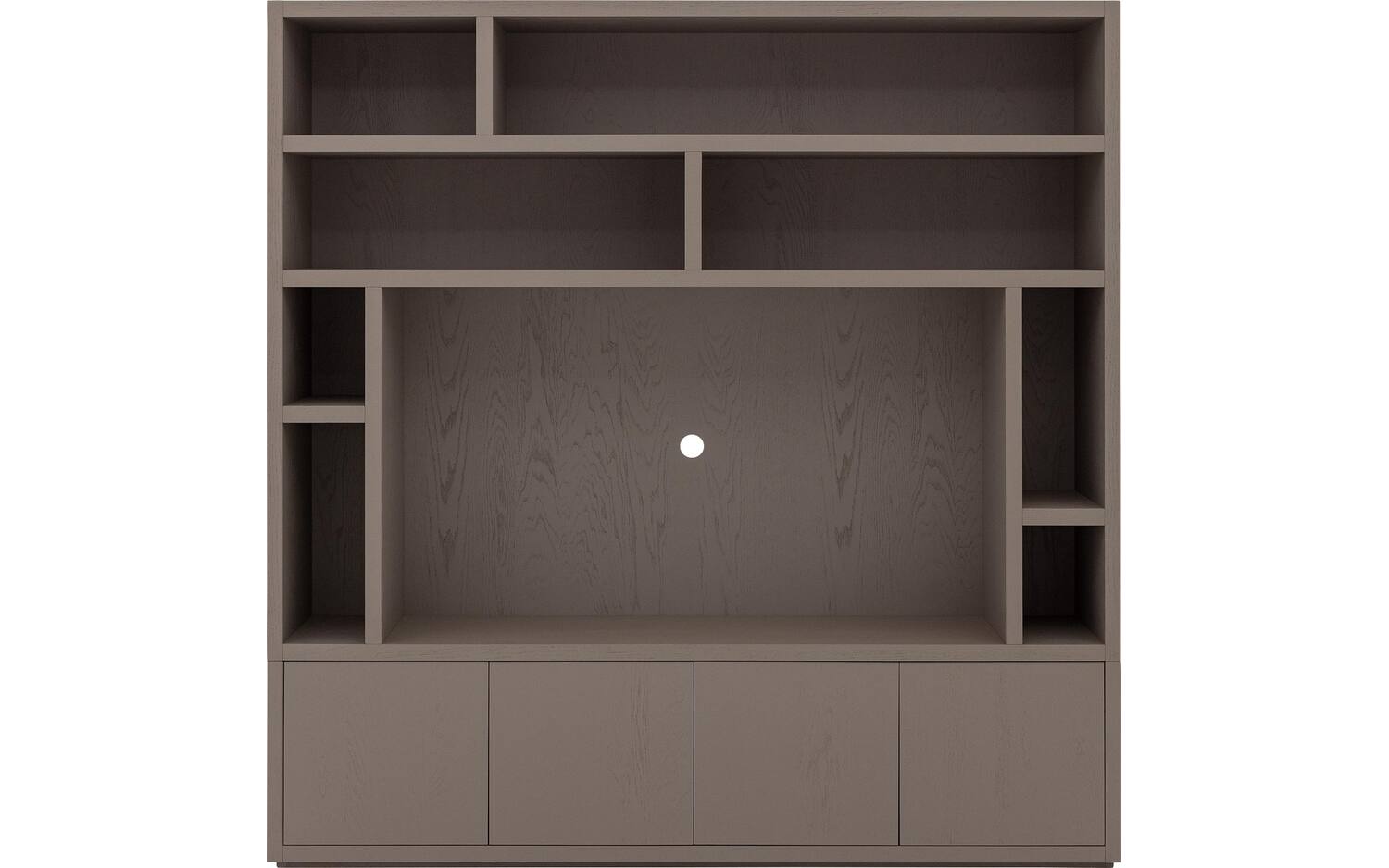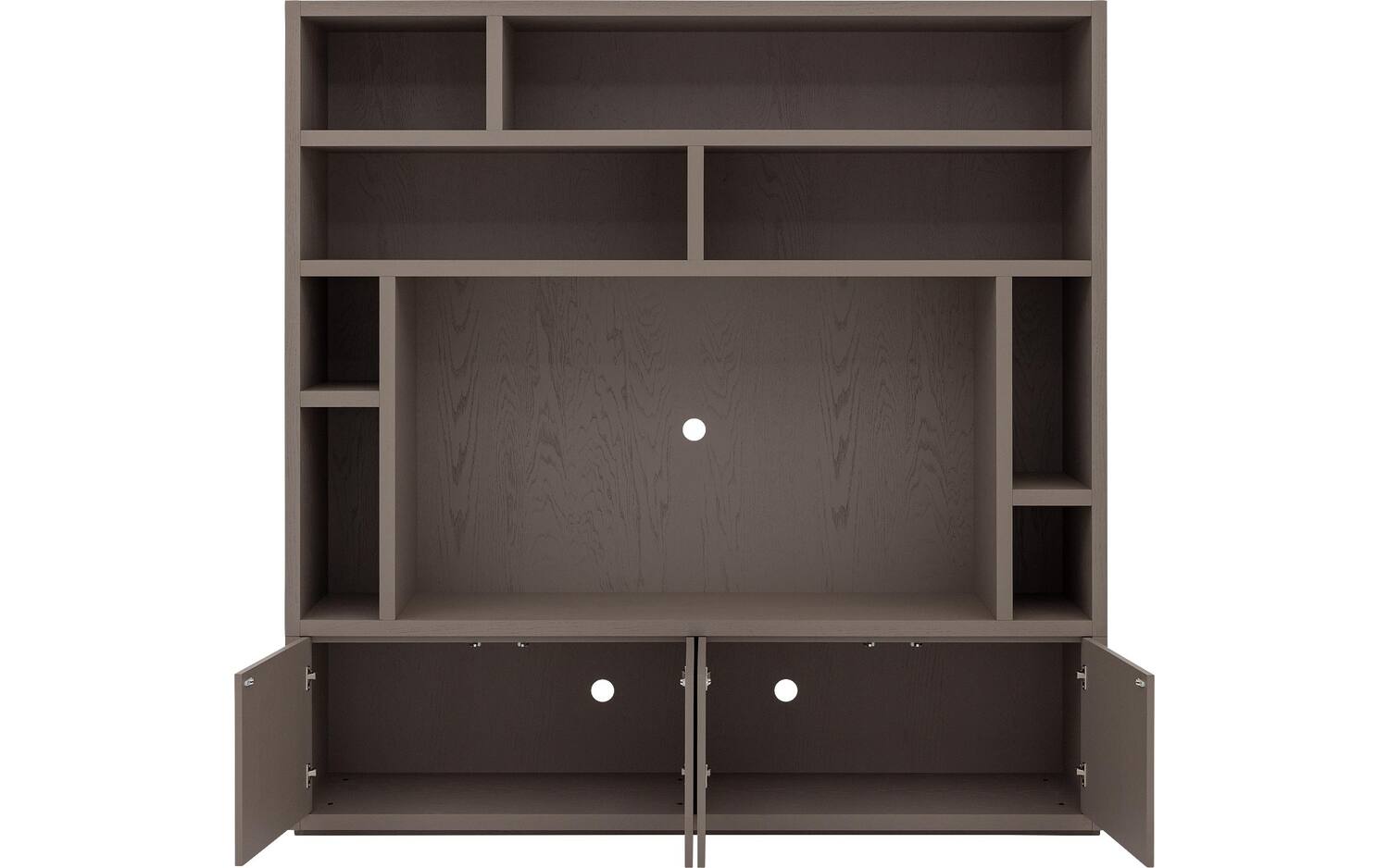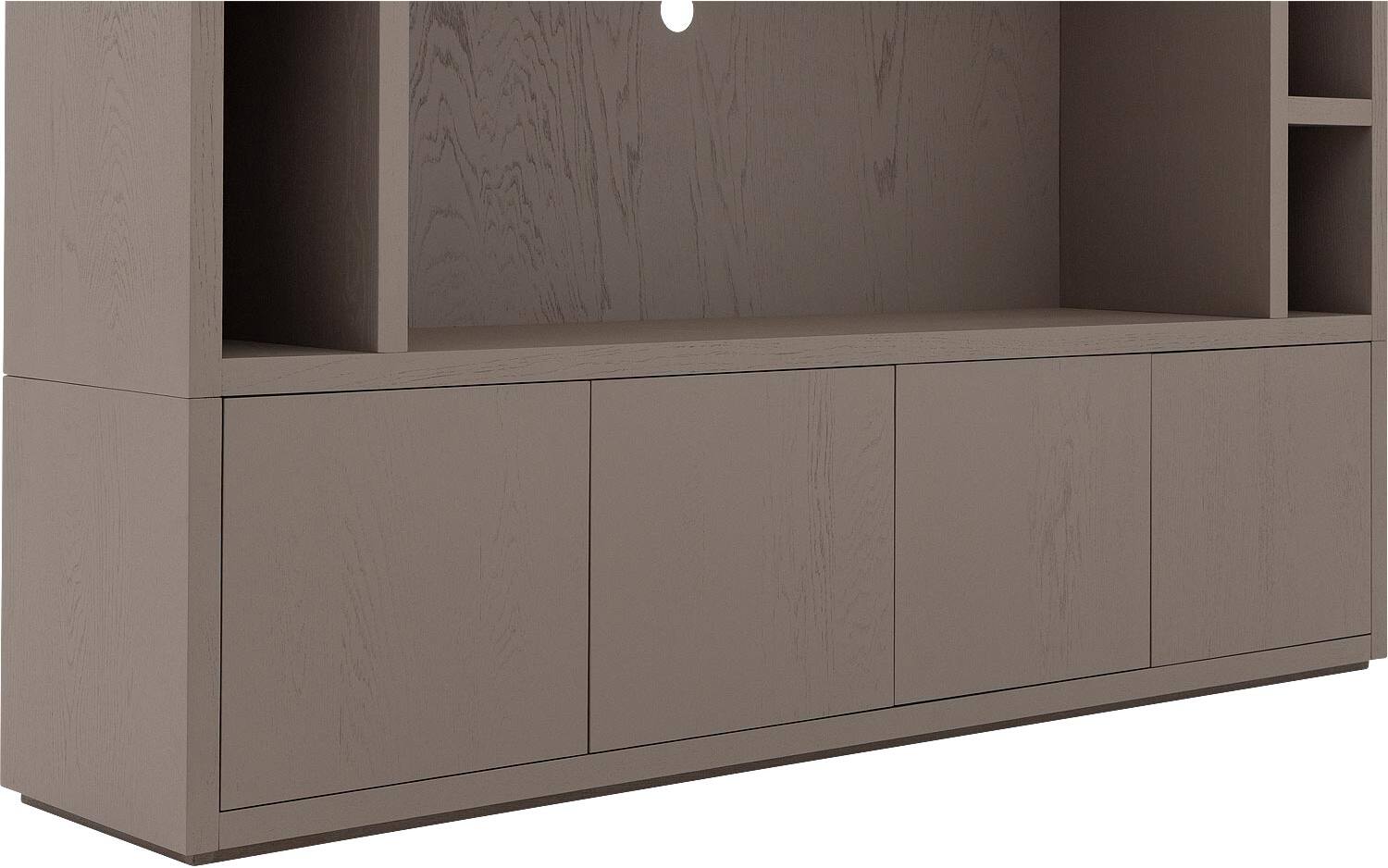 TV meubel Barcelona geeft je interieur direct een warme, landelijke sfeer. De taupe kleur van het eiken fineer straalt rust uit en past mooi bij verschillende woonstijlen. De combinatie van acht open vakken en gesloten opbergruimte zorgt voor een opgeruimd én gezellig geheel.