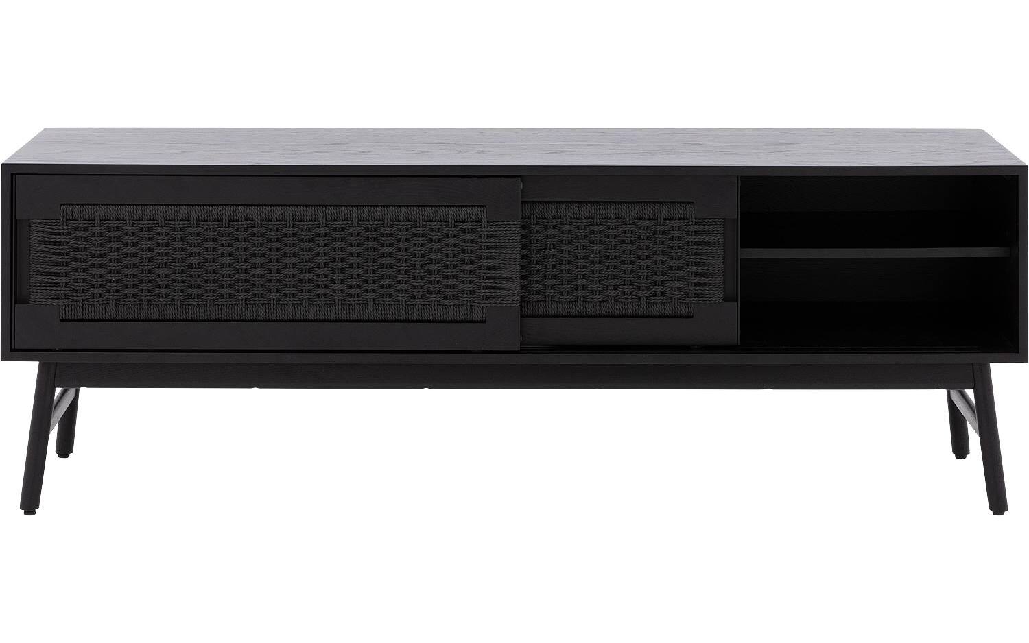 Achter de schuifdeuren vind je voldoende ruimte voor je tv-ontvanger, spelcomputer en andere apparatuur. De gevlochten houtstructuur blijft ook aan de binnenkant zichtbaar, wat zorgt voor een mooie, afgewerkte uitstraling zelfs met open deuren.