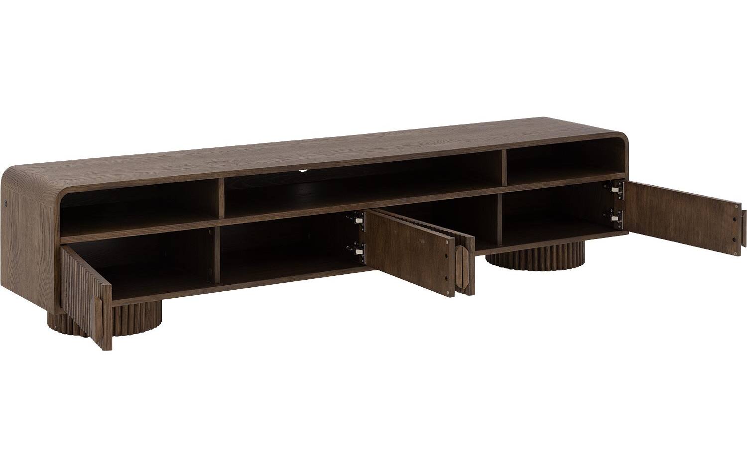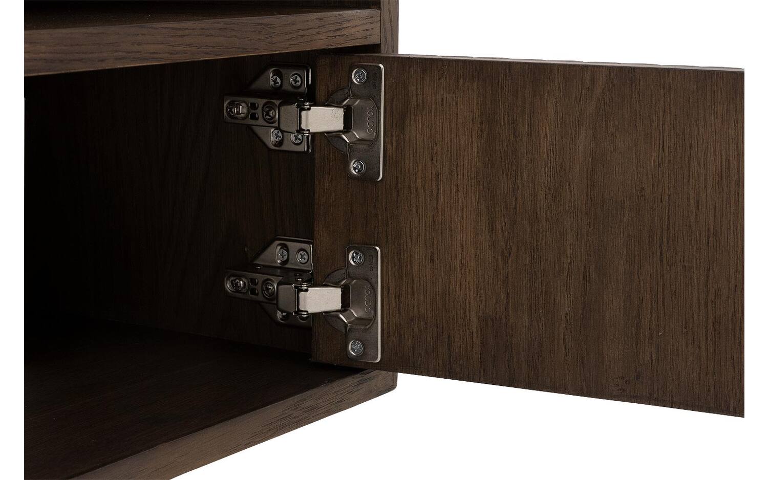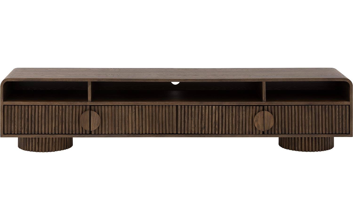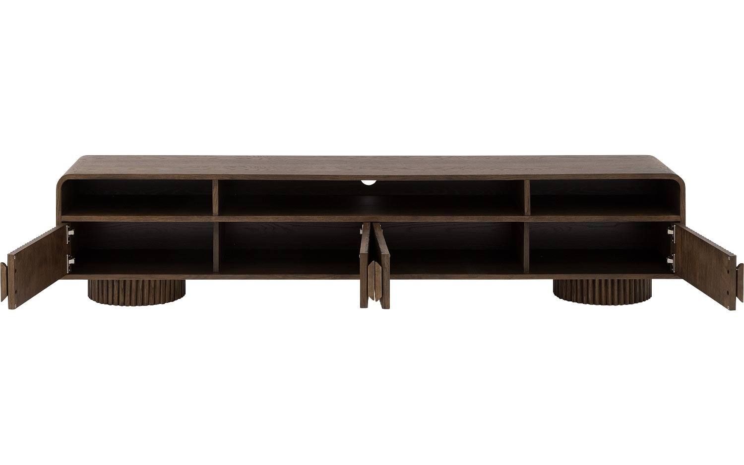 De eiken soft touch lak behoudt de natuurlijke matte uitstraling van het hout, terwijl de beschermende laag zorgt voor minder kringen en krasjes. De handige indeling met vier gesloten vakken en drie open compartimenten geeft je alle mogelijkheden om apparatuur netjes weg te bergen of juist mooi te tonen.