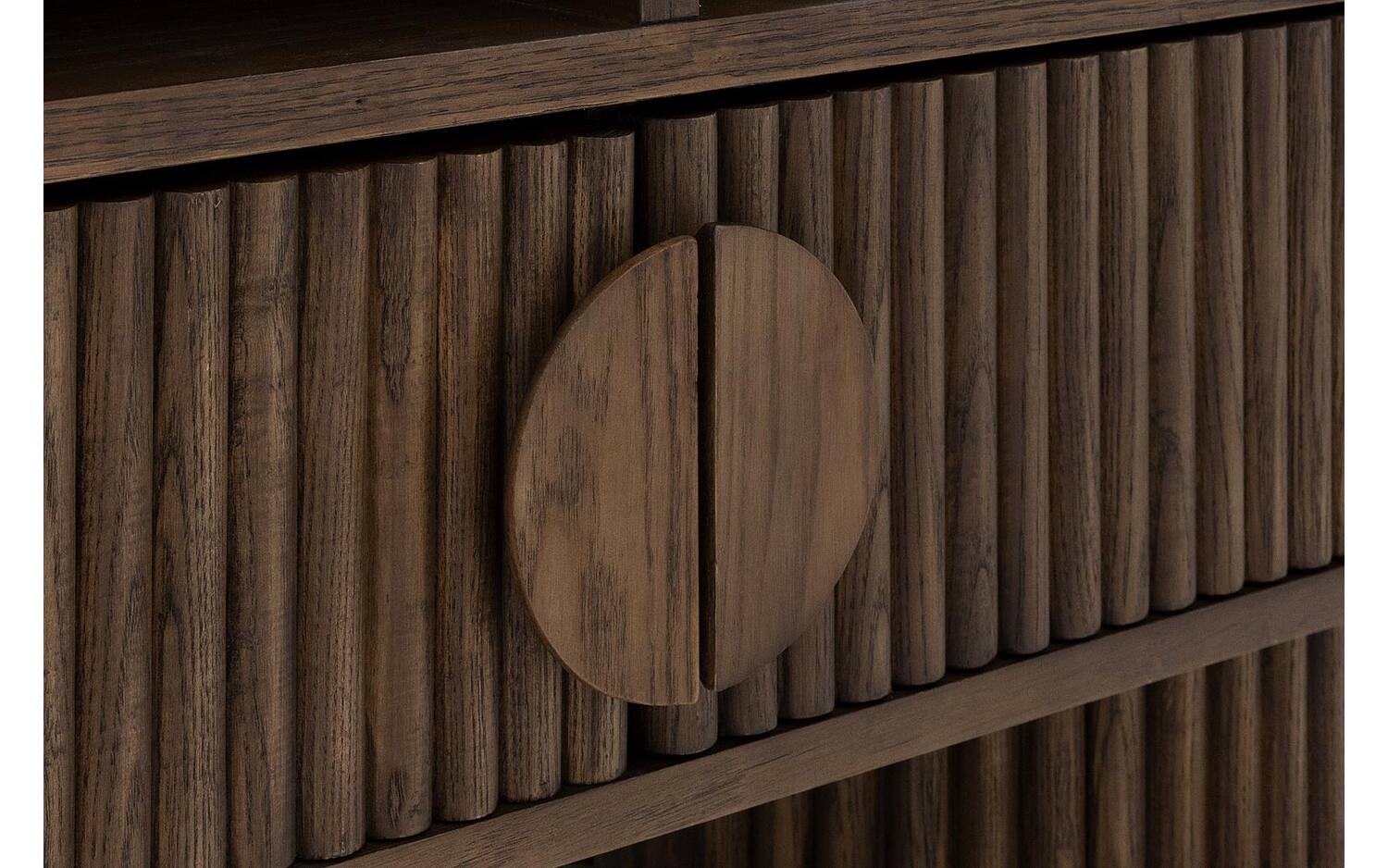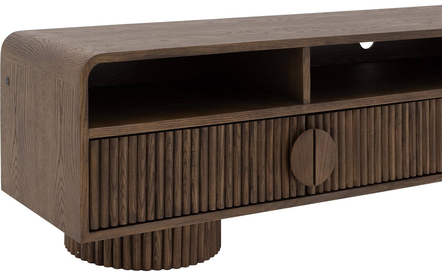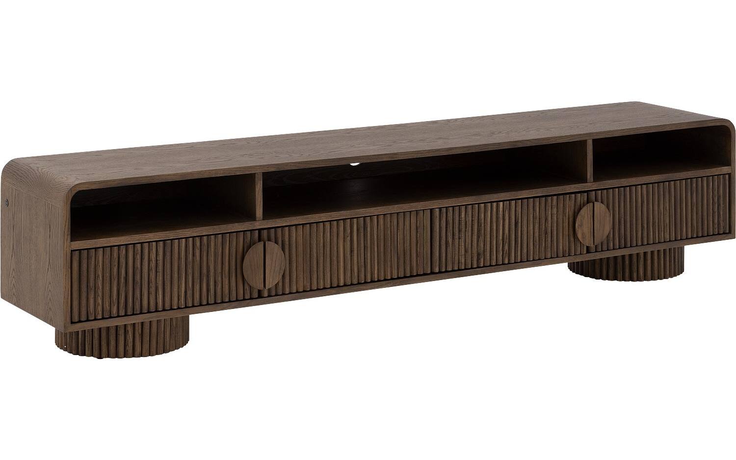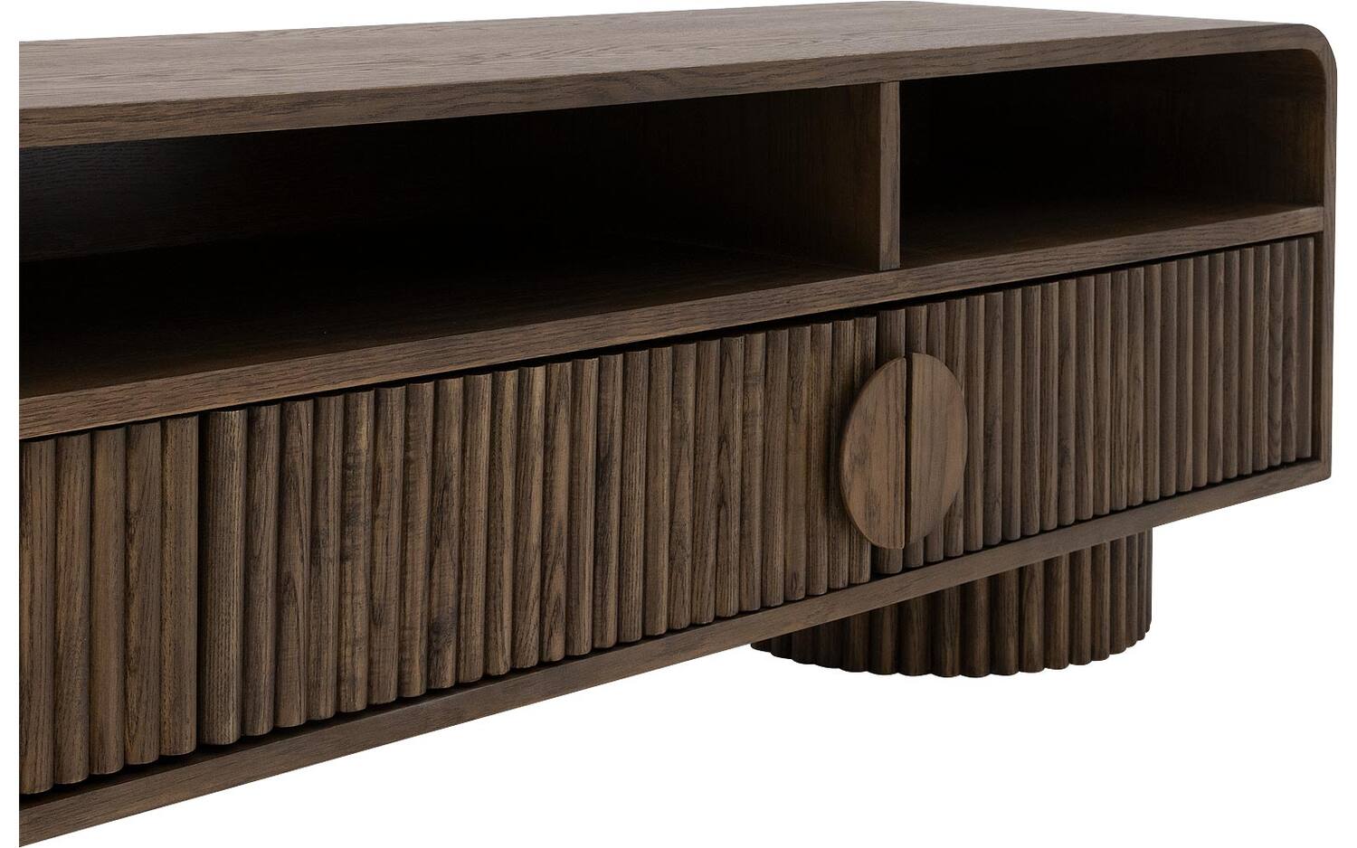 TV meubel Melani straalt warmte en gezelligheid uit met zijn bruine eiken afwerking en zachte, afgeronde lijnen. De grote ronde poten en bijpassende handgrepen geven dit meubel een harmonieus karakter. Door de natuurlijke houtnerf blijft de warme houtlook mooi zichtbaar en voelbaar.