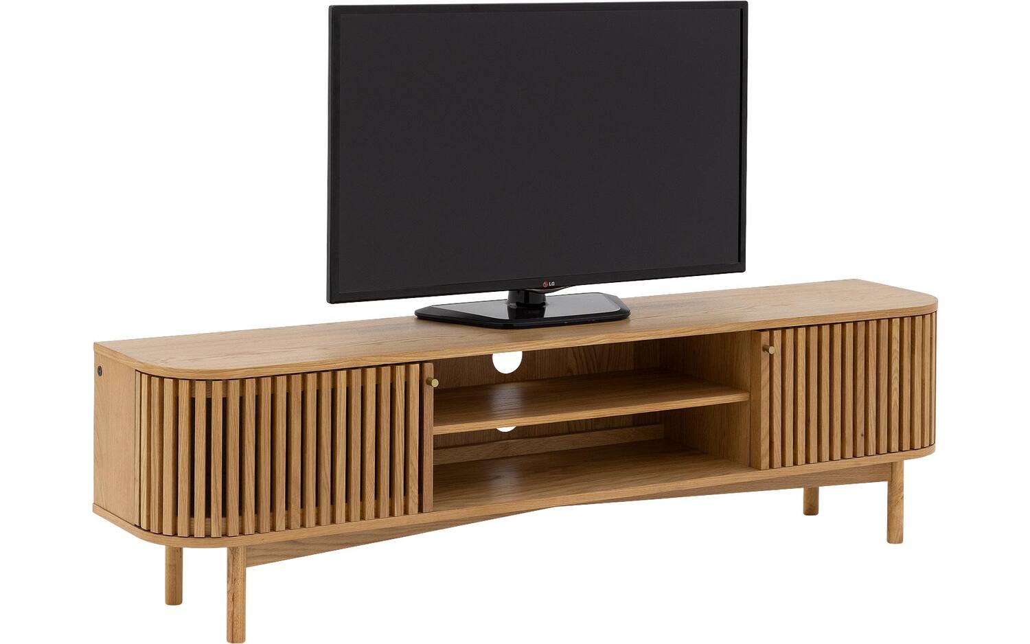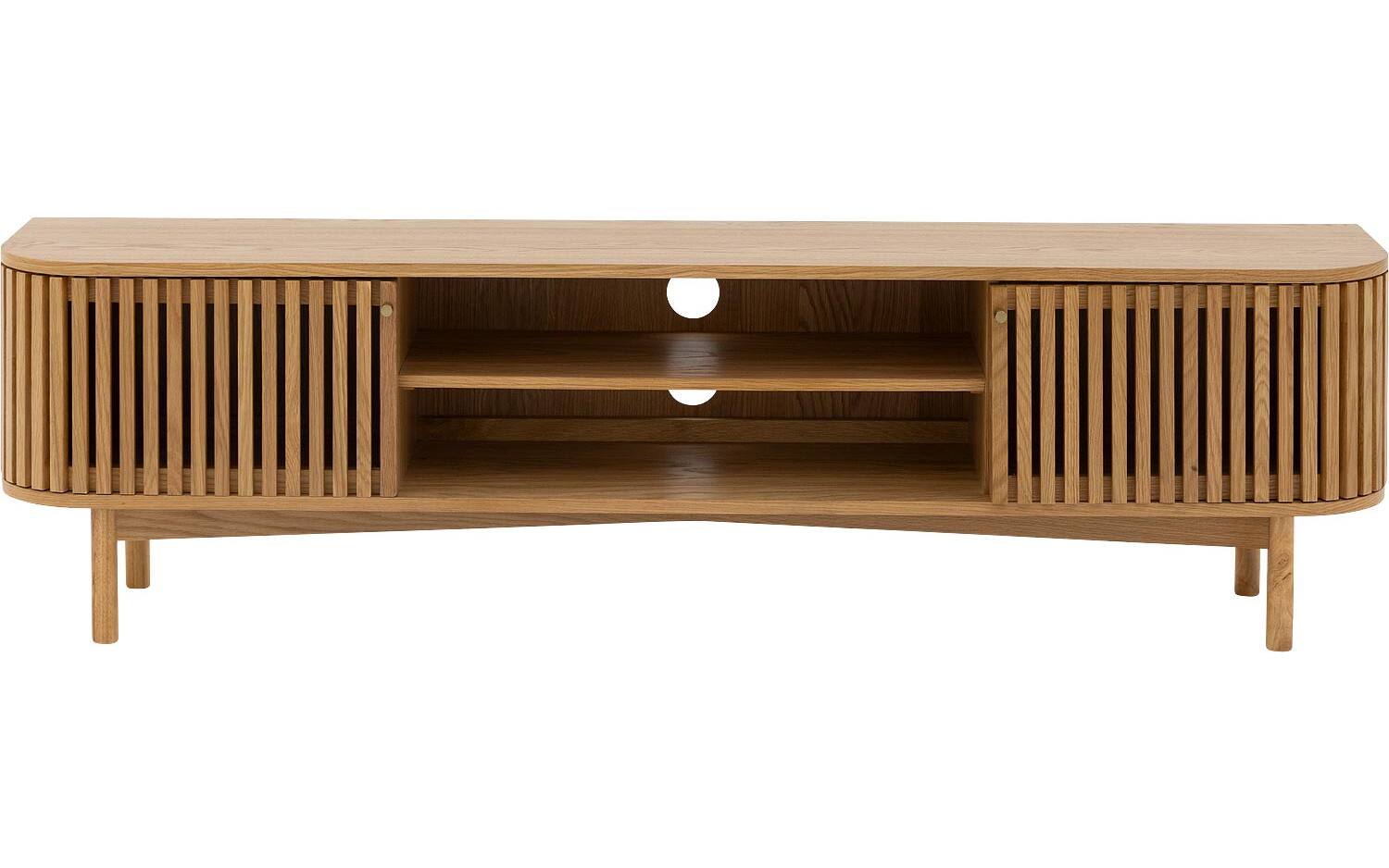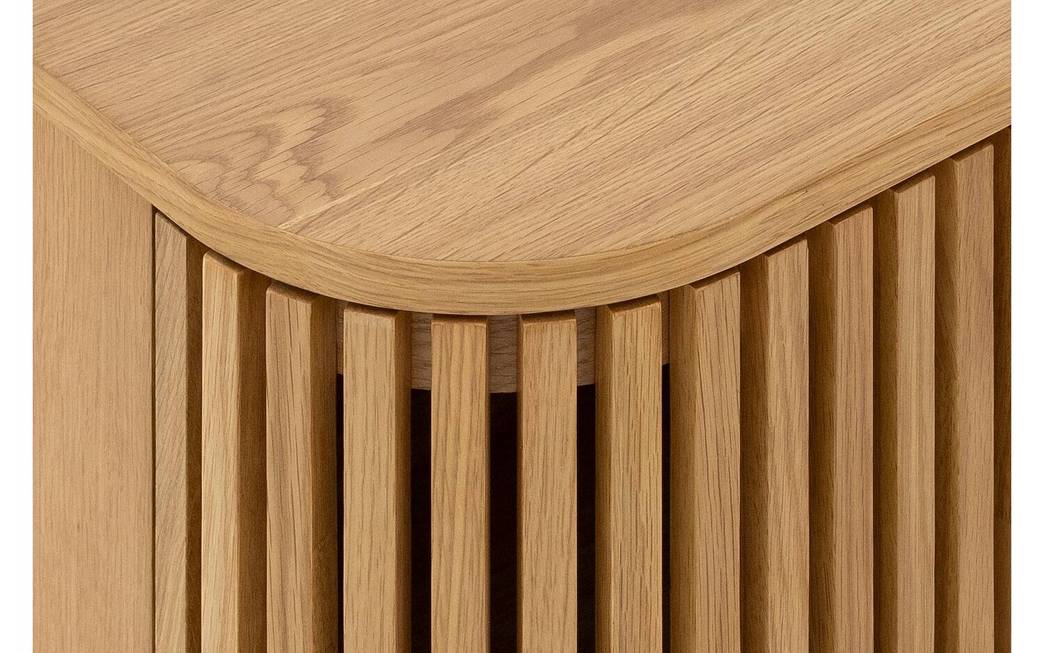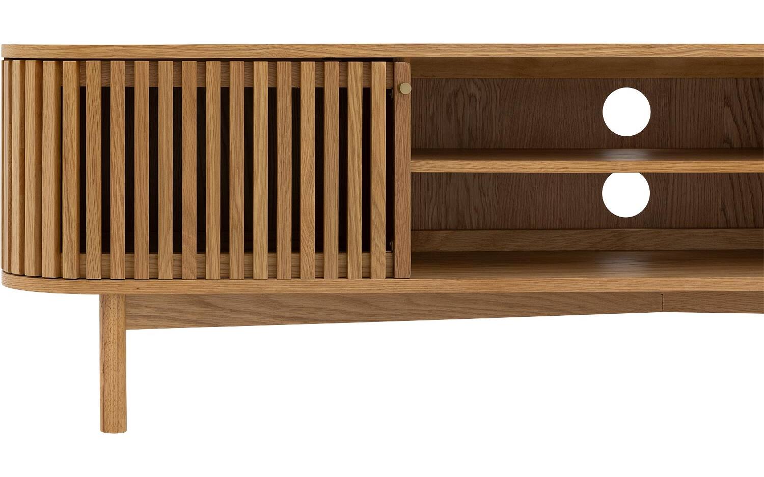 TV meubel Soho straalt warmte uit dankzij het blanke eiken fineer met natuurlijke houtstructuur. De retro-geïnspireerde latjesdeuren zorgen voor een speelse en karaktervolle uitstraling. Perfect staand geplaatst als eyecatcher in je woonkamer.