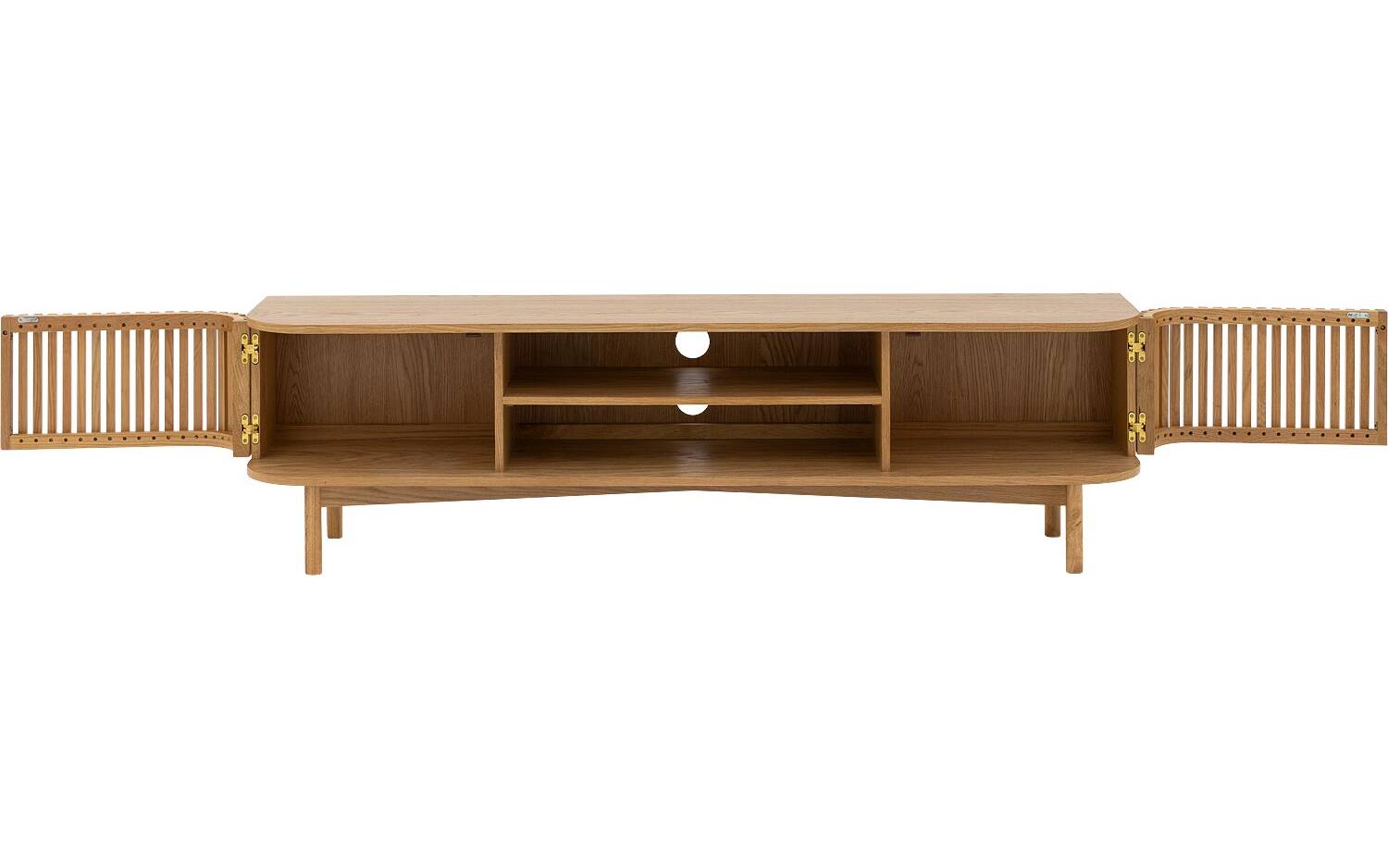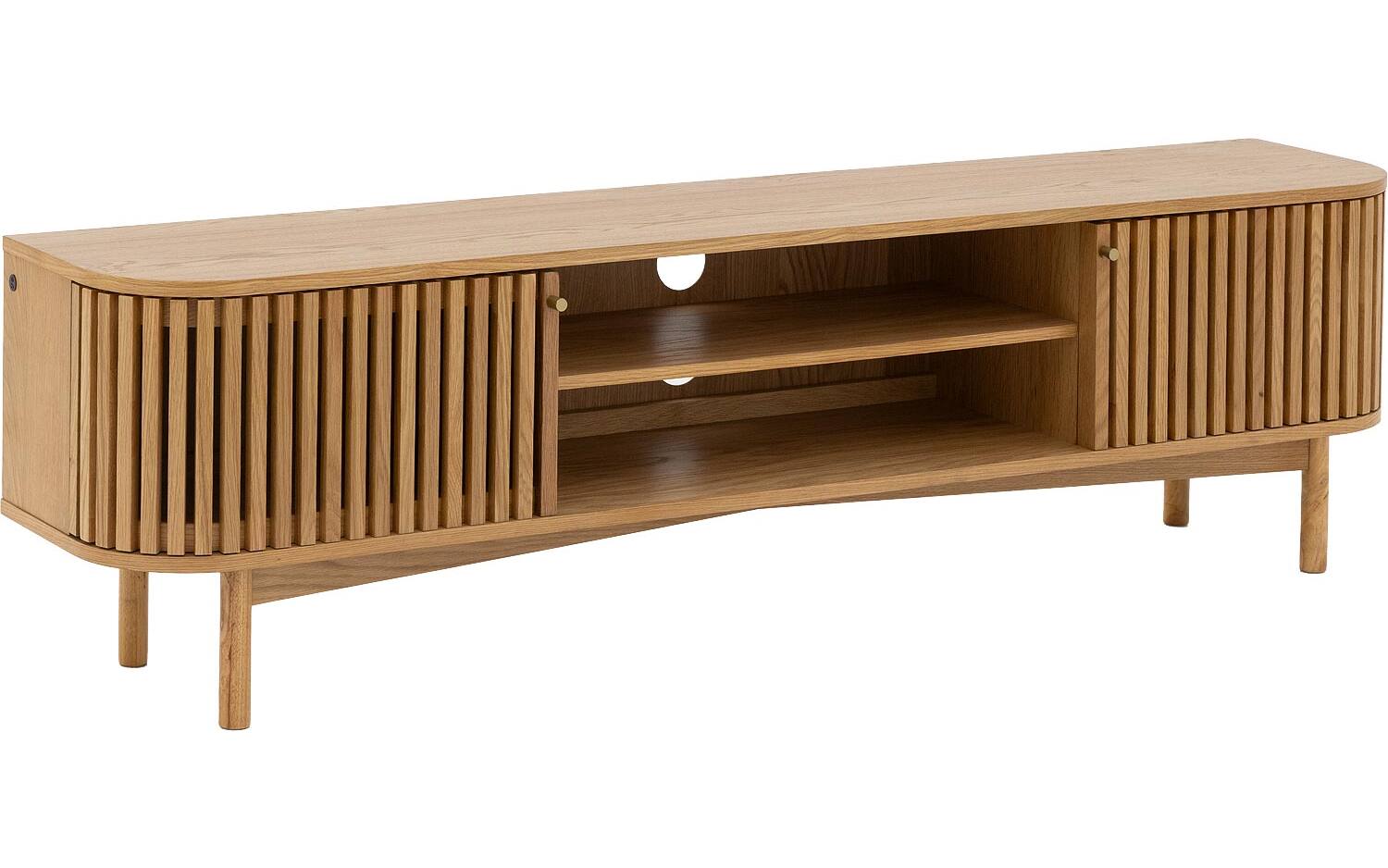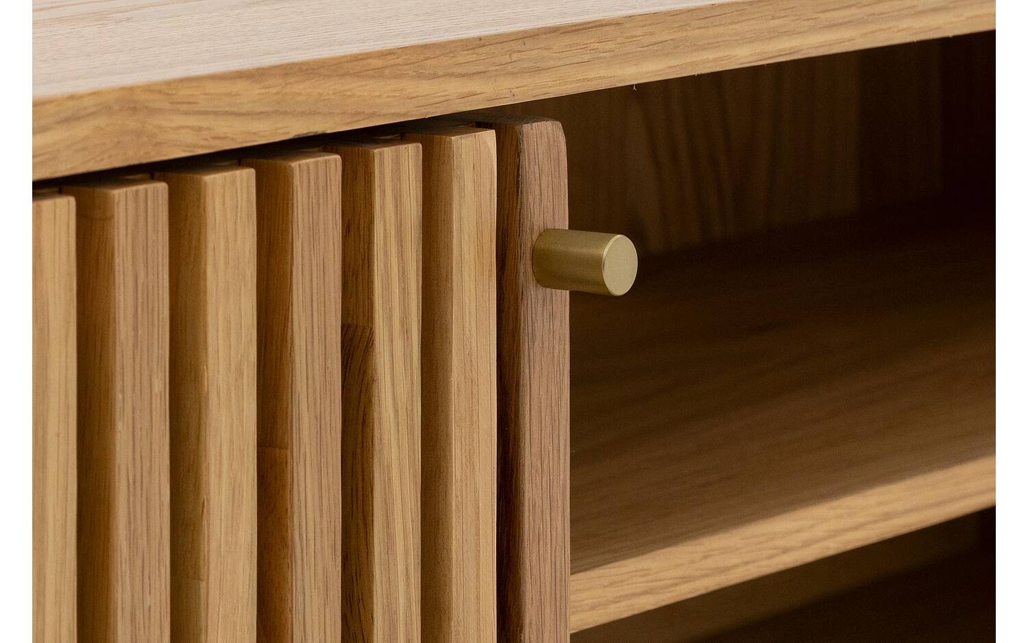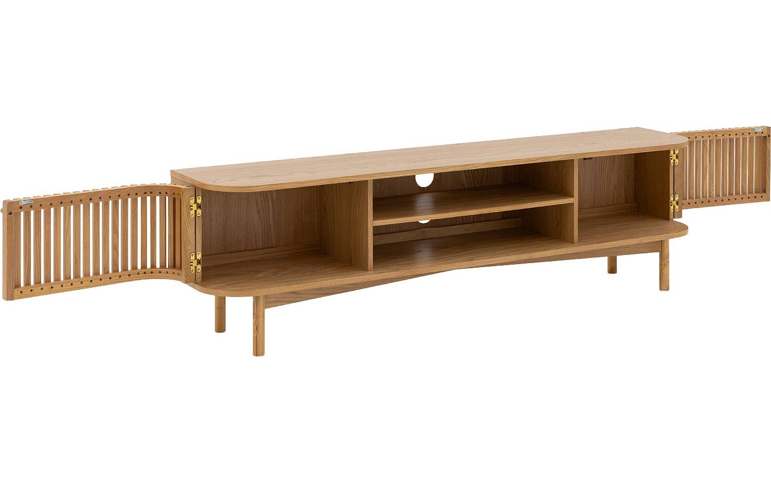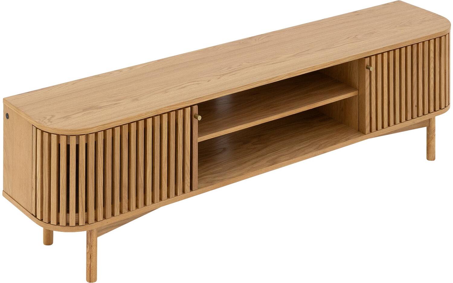 TV meubel Soho straalt warmte uit dankzij het blanke eiken fineer met natuurlijke houtstructuur. De retro-geïnspireerde latjesdeuren zorgen voor een speelse en karaktervolle uitstraling. Perfect staand geplaatst als eyecatcher in je woonkamer.