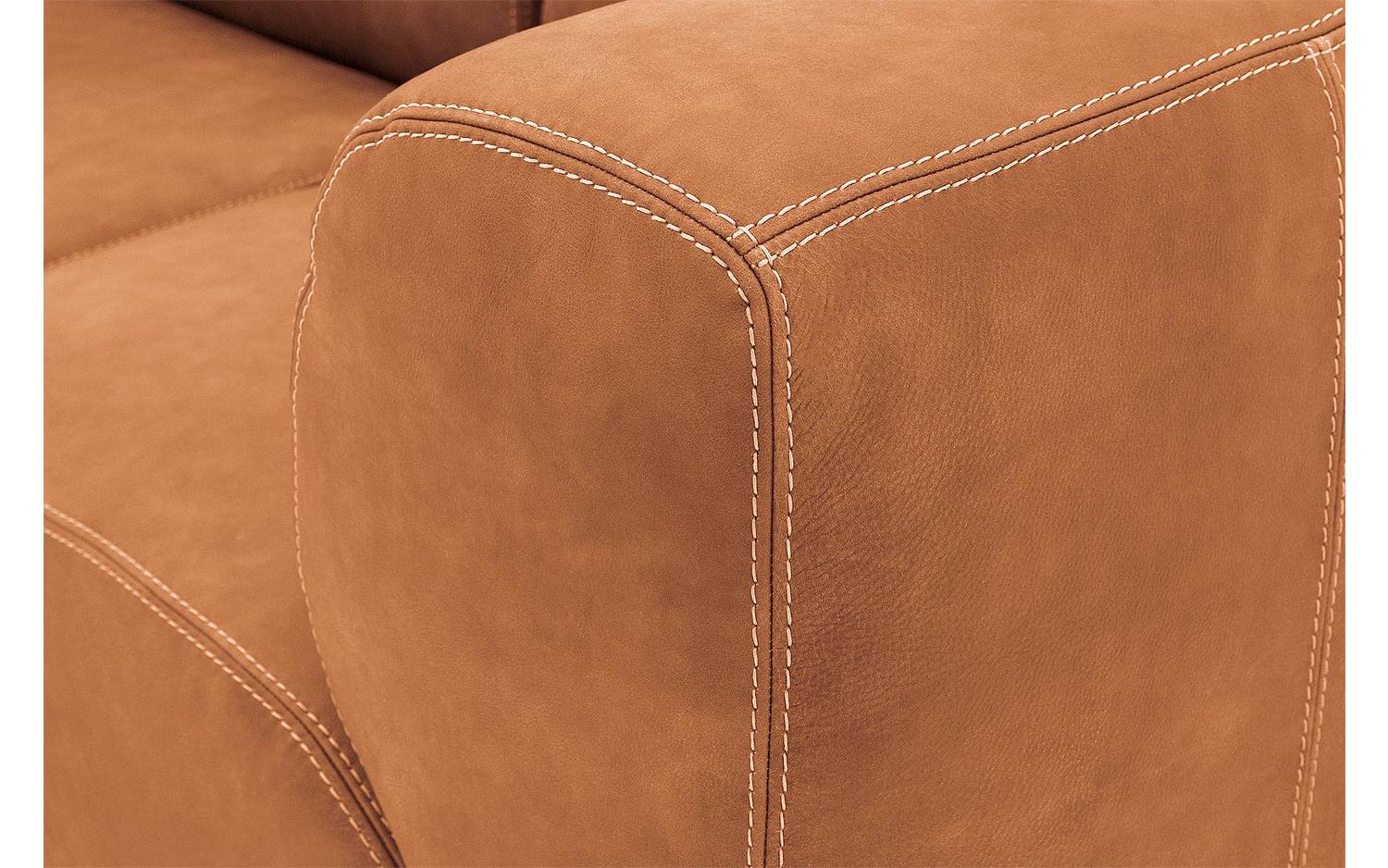 Het buffalo leer is licht opgeschuurd en heeft een suède-achtige uitstraling. Dit leertype krijgt een mooie patina en unieke uitstraling door gebruik. De grove stiknaden en metalen poten met zwarte matte afwerking versterken het stoere, urban industriële karakter van Marshall.