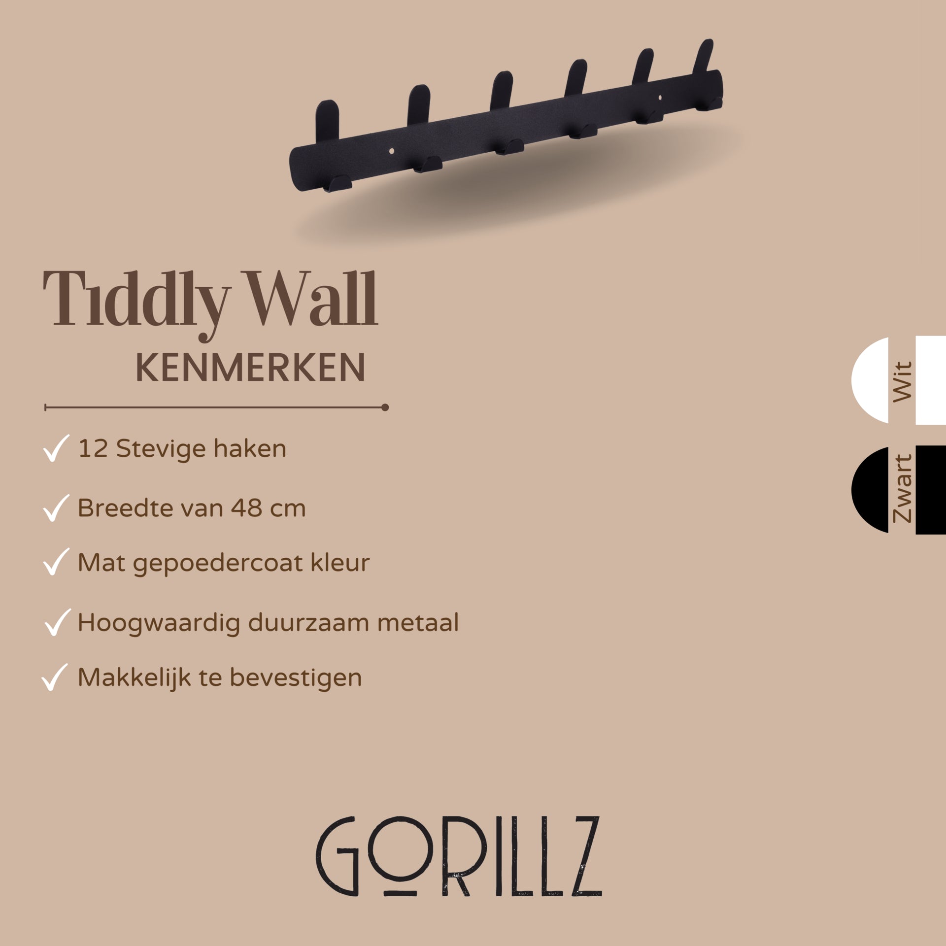De Gorillz Tiddly Wandkapstok bespaart ruimte in iedere kamer. Het moderne ontwerp beschikt over 12 Kapstok haken waar bijvoorbeeld jassen aan kunnen worden gehangen. De wandkapstok is compact en heeft een lengte van 48 centimeter. Dankzij de meegeleverde set schroeven is de kapstok in no-time bevestigd aan de wand. Het hoogwaardige en duurzame metaal staat garant voor een lange levensduur. Kies voor een zwarte of witte variant en verrijk je kamer met deze mooie kapstok.