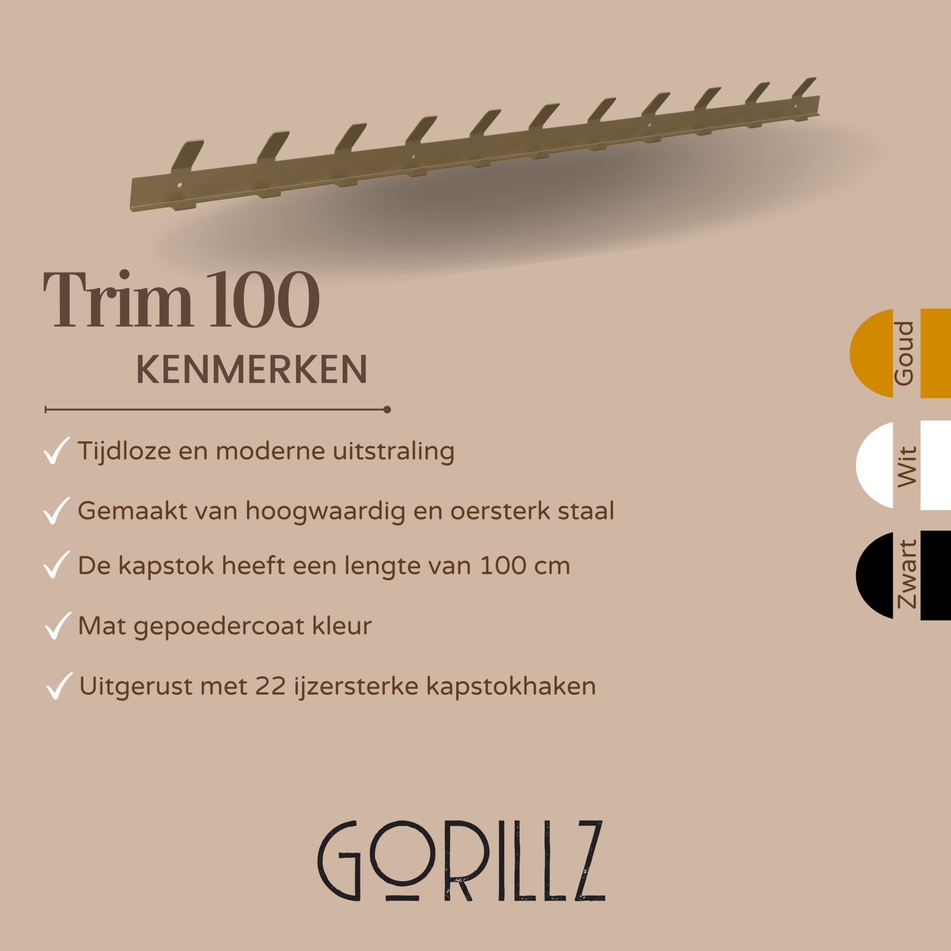 Gorillz Trim 100 - Kapstok van 1 meter - 22 Haken - Metaal - Mat Goud