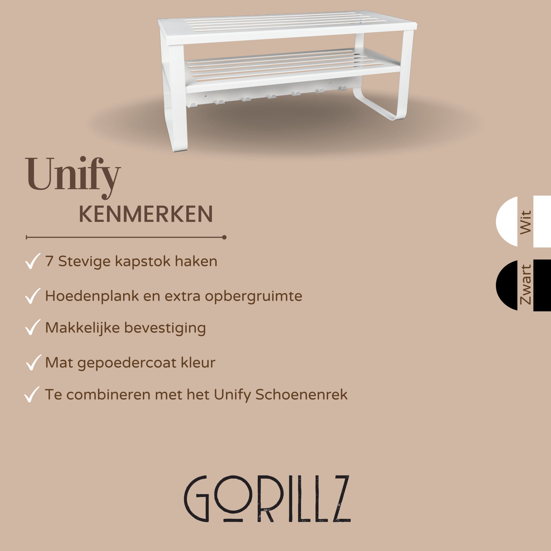 De Gorillz Unify Wandkapstok met hoedenplank is een echte eyecatcher. Maak gebruik van de 7 stevige haken om jassen op te hangen. Naast jassen, biedt de wandkapstok plek voor hoeden op de hoedenplank. Er is zelfs een extra plank aanwezig voor overige spullen. Het hoogwaardige metaal is enorm duurzaam en makkelijk te bevestigen aan de muur. Kies uit een witte of zwarte kapstok en combineer hem met het Unify Schoenenrek voor een compleet garderoberek.