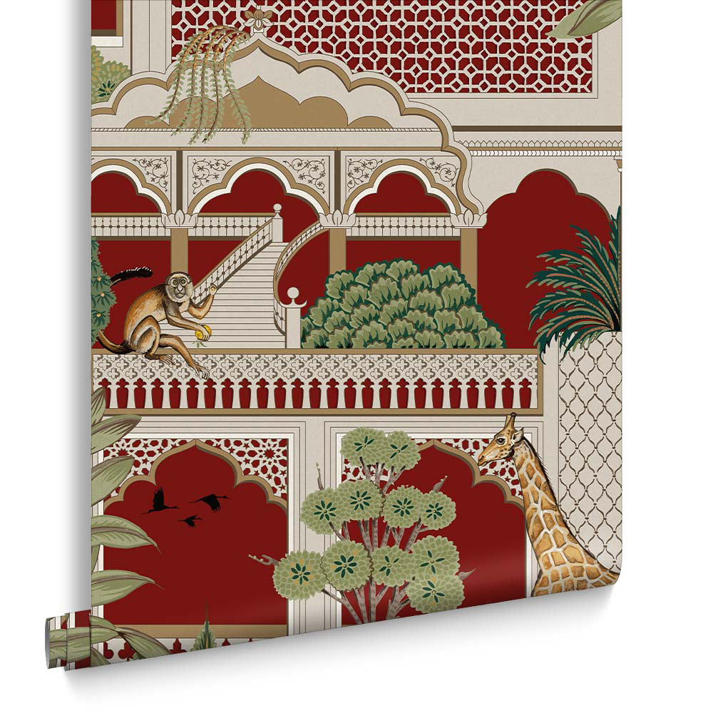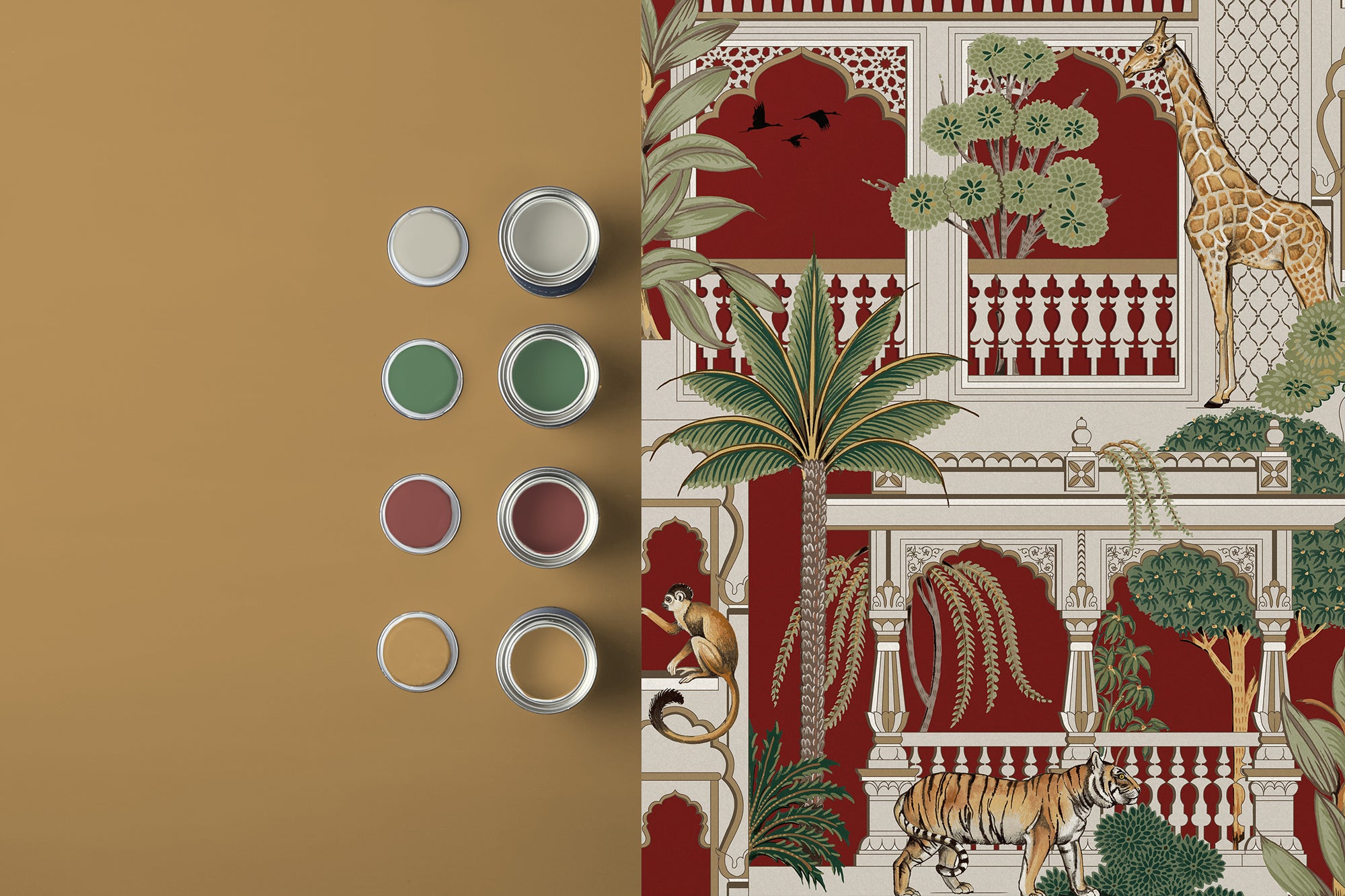 Deze ivoren tempel, geïnspireerd door India, steekt af tegen een rijke rode achtergrond. Compleet met klimmende apen en tijgers die de ingang bewaken, is Animahal Alizarin een meesterwerk dat gegarandeerd de wow-factor in je huis brengt. Combineer dit ontwerp met de perfect bijpassende verfkleuren.