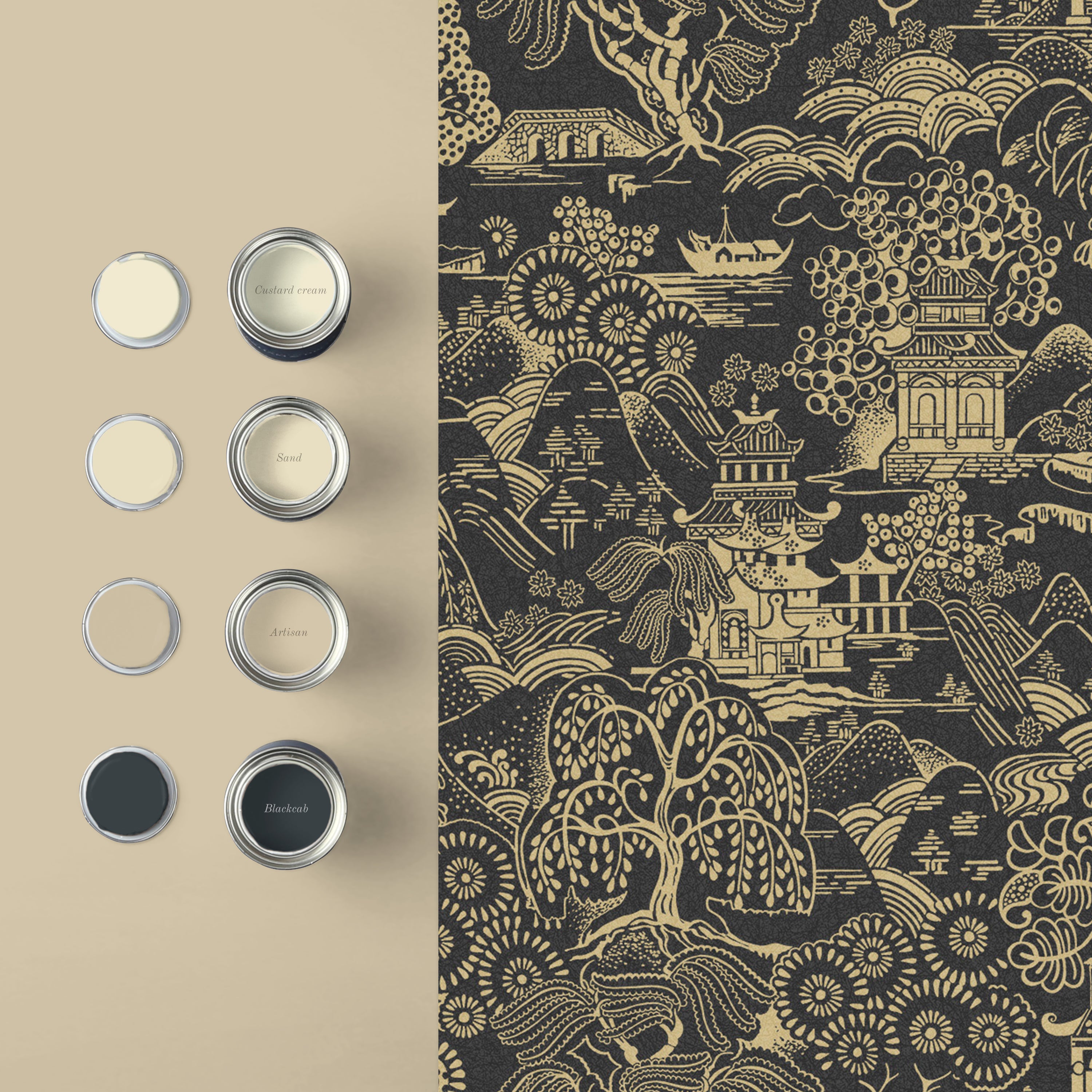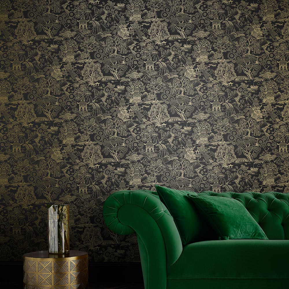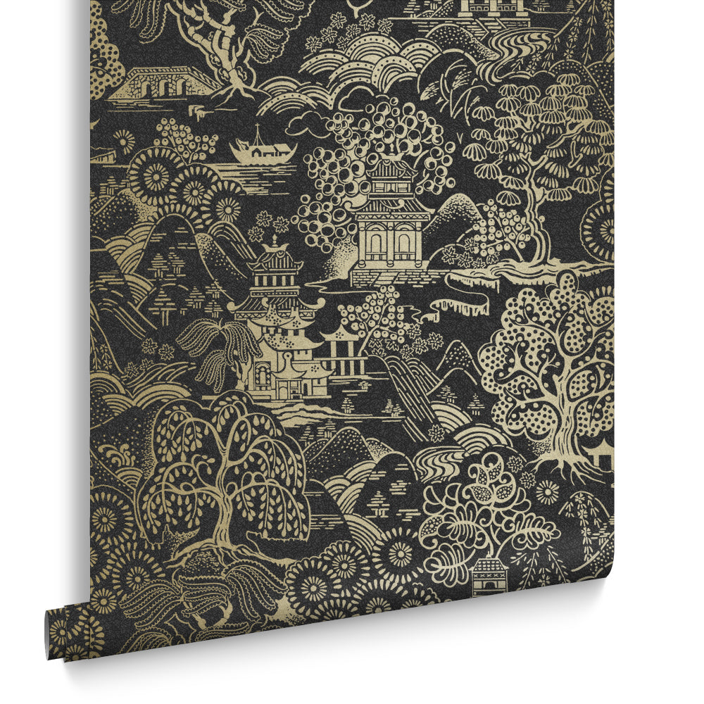Basuto Black Gold behang is een eerbetoon aan het Japanse landschap, met afbeeldingen van prachtige gebouwen en bomen onder het genot van exploderend vuurwerk. Dit behang is oorspronkelijk een Graham & Brown archiefstuk, dat nieuw leven is ingeblazen. Basuto betekent 'barsten' in het Japans. Het is gemaakt van luxueus, zwart, vezelig papier met subtiele, gouden details.