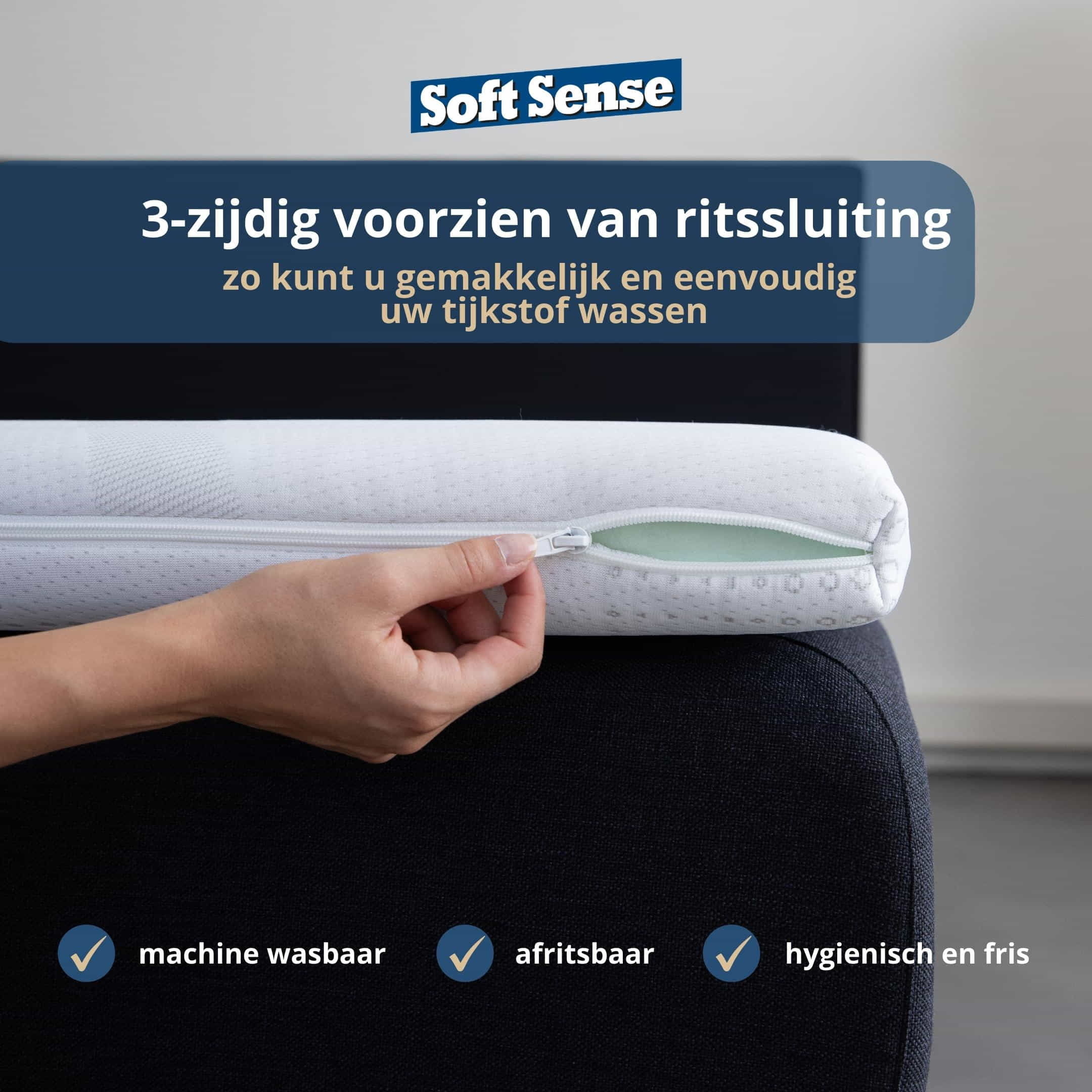 De HD Soft Sense® topper is bekleed met een speciale CoolTouch dubbeldoeks jersey tijkstof. CoolTouch is temperatuur regulerend en stimuleerd de ventilatie. Dit maakt de Soft Sense in elk seizoen een heerlijke topper. Men ondervindt door de Cooltouch technologie in de tijkstof 'n aangenaam en zachter slaapklimaat. De speciale tijkstof is voorzien van een ritssluiting aan 3 zijden, waardoor deze gemakkelijk afneembaar en wasbaar is.