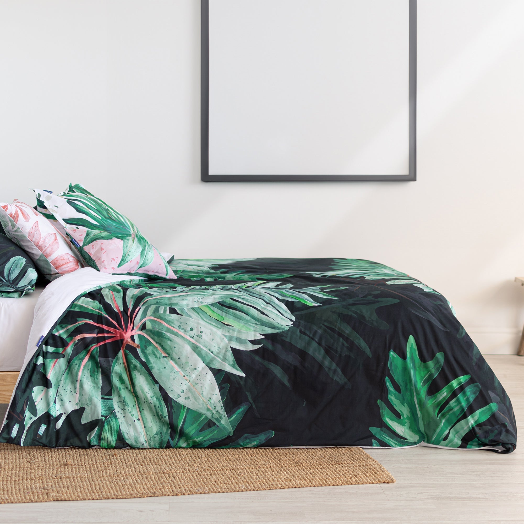 De aquarel varens en palmbladeren die het elegante dekbedovertrek Ebony uit de Happyfriday collectie sieren, kleden je kamer aan in de weelderige en verfrissende tinten van het regenwoud. Ervaar uitzonderlijk comfort en zachtheid onder dit 150 thread count 100% katoenen dekbedovertrek met een gladde afwerking. Comfortabel en gemakkelijk te verwisselen dankzij de gemakkelijke sluiting met verborgen knopen. Kussensloop en hoeslaken niet inbegrepen.