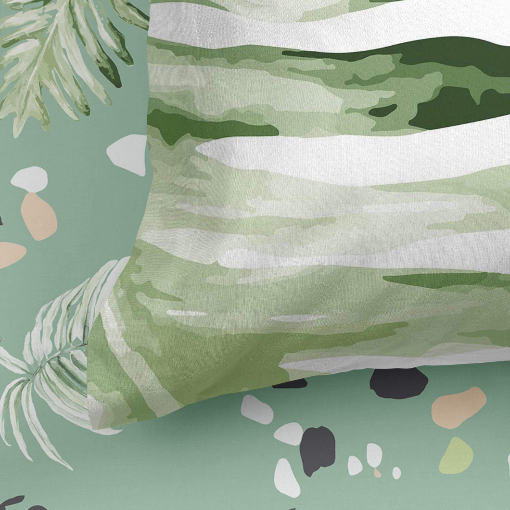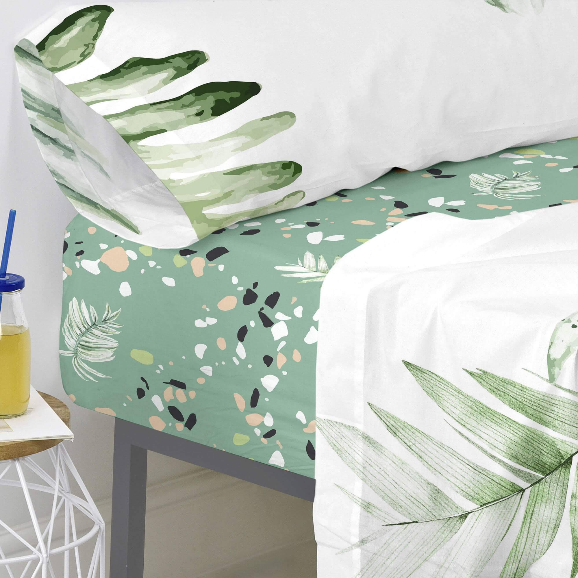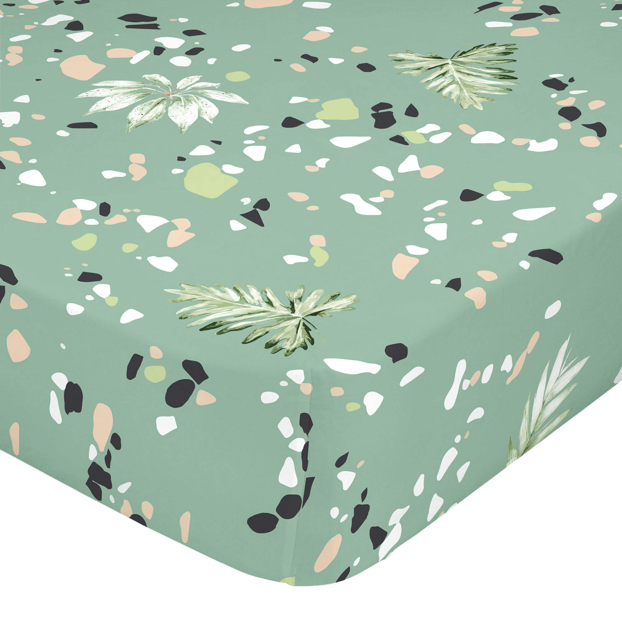 100% katoenen hoeslaken, 150 thread count. De hoeken zijn verstelbaar met elastiek.