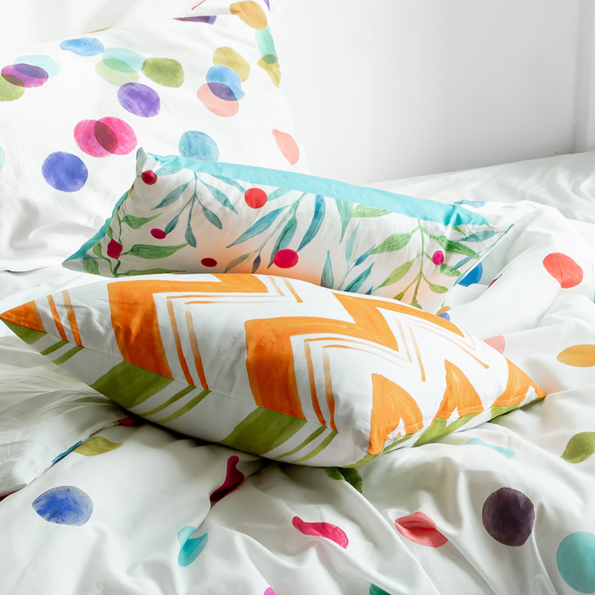 Mix en match de felgekleurde zigzag- en bladprints van de Confetti kussenovertrekset van Happyfriday om wat kleur en plezier aan je bed toe te voegen. Je kunt ook de groenblauwe kant van de kleinere hoes gebruiken voor een nettere, meer verfijnde look. Het heldere kleurenpalet van deze 100% katoenen kussenhoezen is gemaakt door middel van high definition digitaal printen. Met liefde gemaakt in Spanje. Vullingen zijn niet inbegrepen.