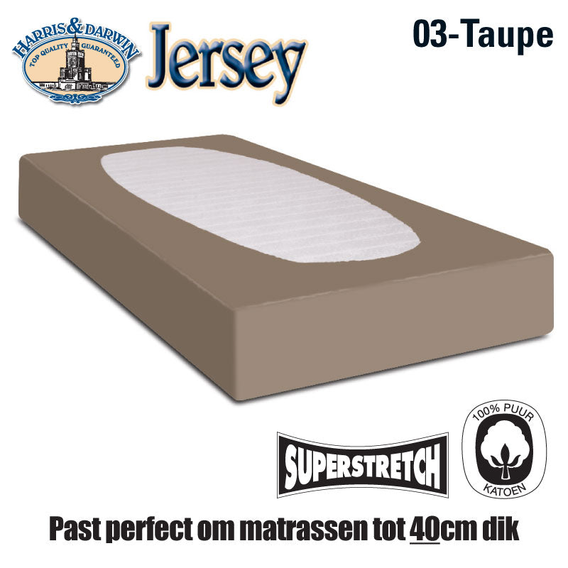 Hét sublieme Jersey-hoeslaken van tópmerk Harris&Darwin© voor optimale bescherming van uw kostbare matras . Vervaardigd van 100% puur natuurlijk jersey katoen, dus heerlijk fris, ademend en huidvriendelijk. 100% Natuurzuiver met Ecotex©-keurmerk. Deze hoeslakens hebben een royale hoekhoogte van 40cm en zijn voorzien van rondom elastiek voor een perfecte pasvorm. Bovendien is Jersey volledig kreukvrij en hoeft dus niet gestreken te worden. Deze hoeslakens voelen heerlijk zacht en comfortabel aan. Tijdelijk hartstikke lekker voordelig, met grote korting! Harris&Darwin© Jersey matras hoeslaken in Taupe!