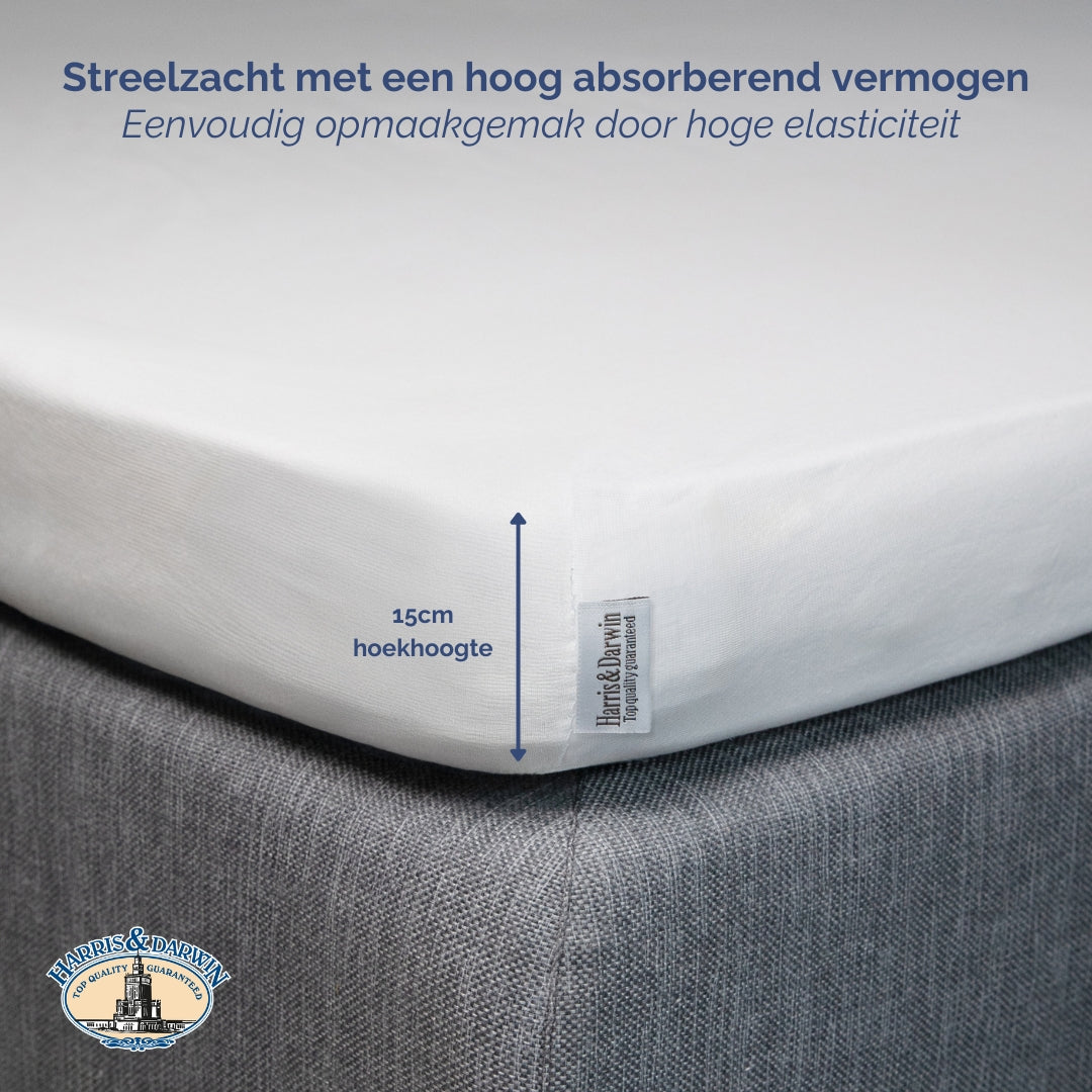 Het Harris&Darwin Jersey hoeslaken combineert kwaliteit met comfort, ideaal voor iedereen die waarde hecht aan een goede nachtrust. De hoogwaardige jersey-stof voelt heerlijk zacht aan op de huid, terwijl de toevoeging van lycra zorgt voor een elastische pasvorm die goed blijft zitten, nacht na nacht. De stof ademt goed, zodat je bed koel en fris blijft, zelfs tijdens warmere nachten.