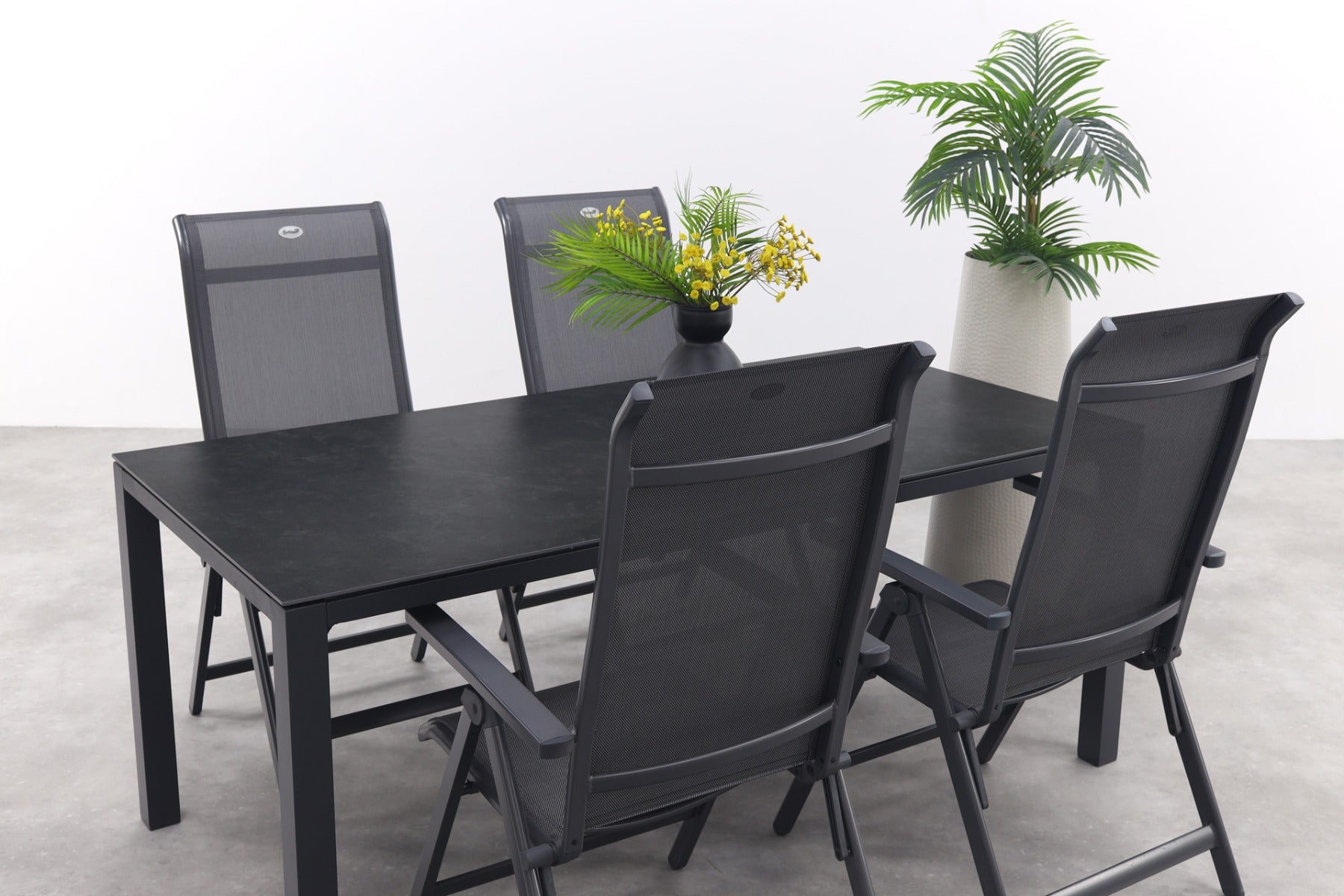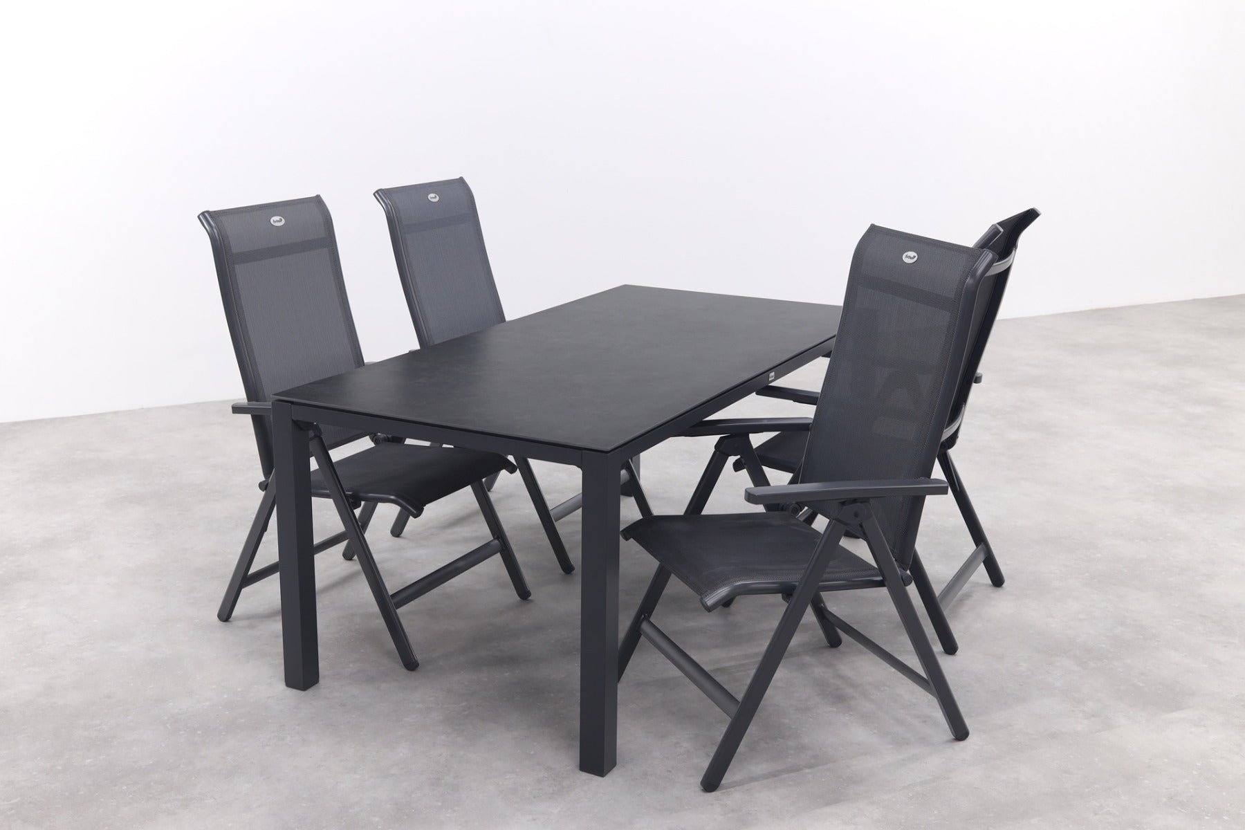 Deze tijdloze en verstelbare tuinset met een keramisch tafelblad, past perfect in elke buitenruimte! In combinatie met de comfortabele verstelbare tuinstoelen is het een ware eyecatcher voor jouw terras.