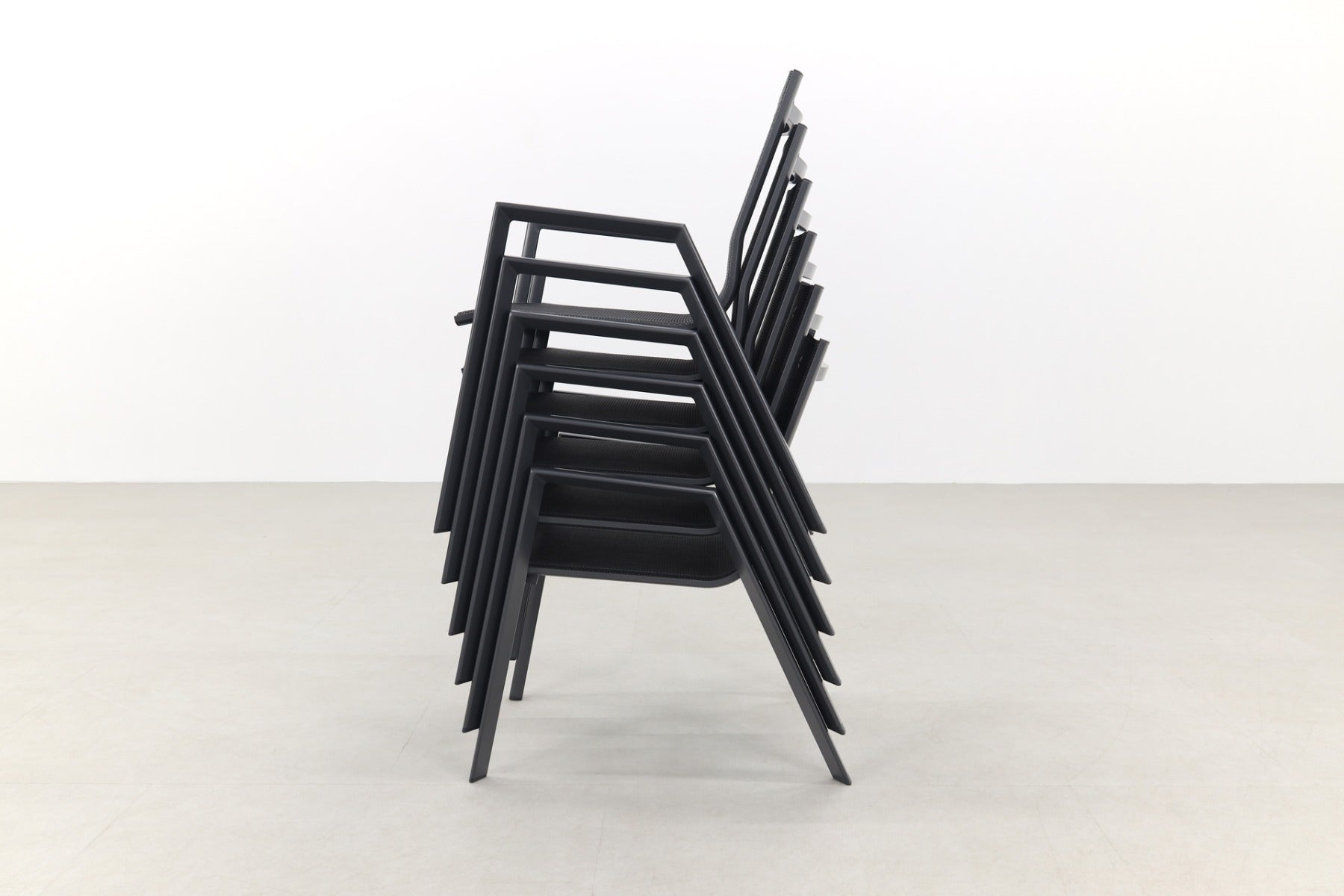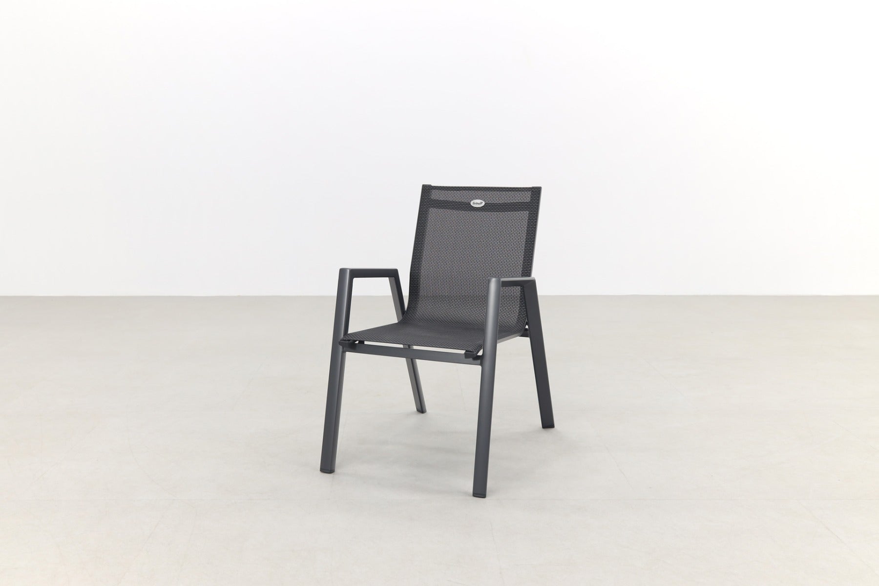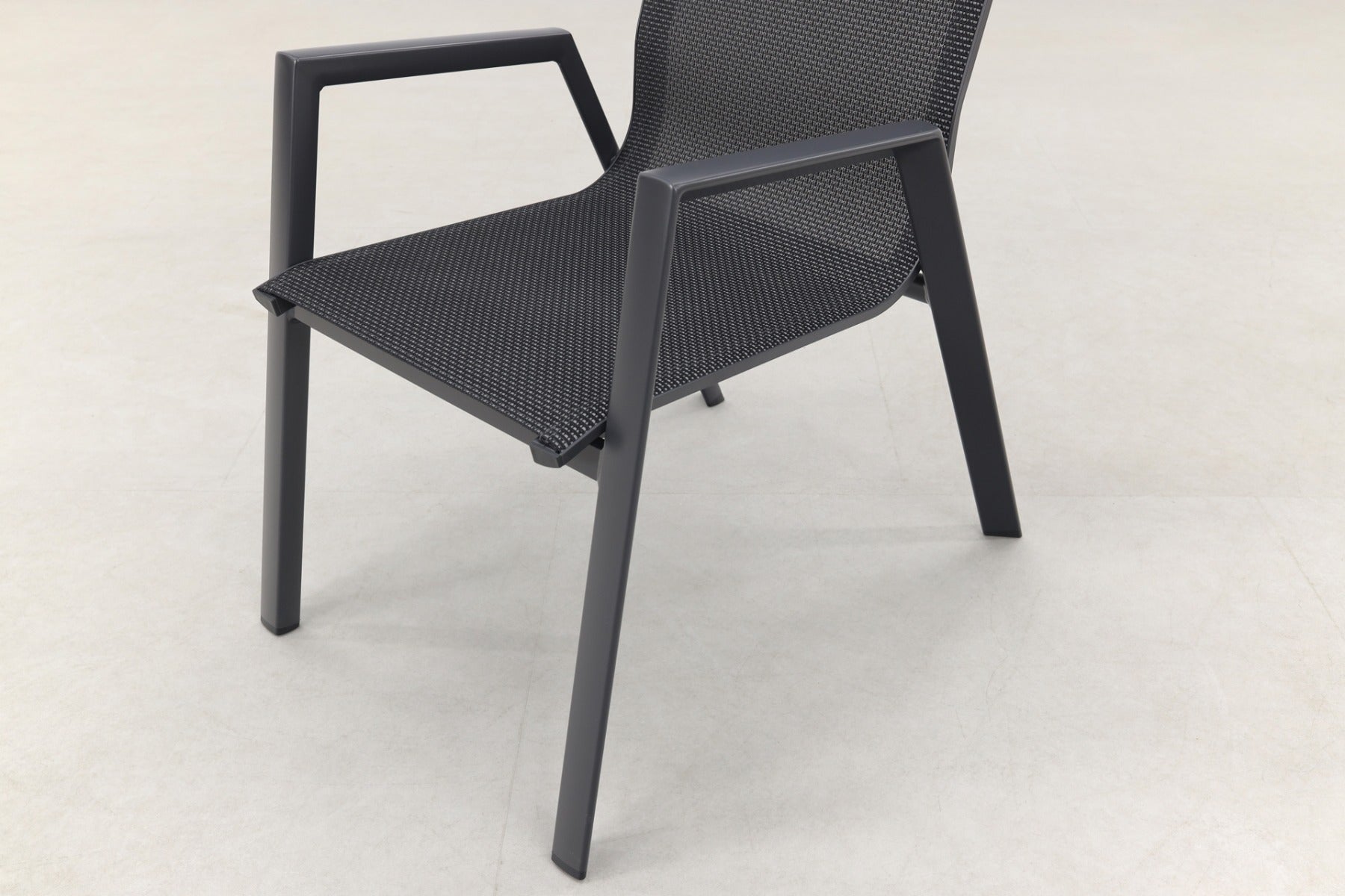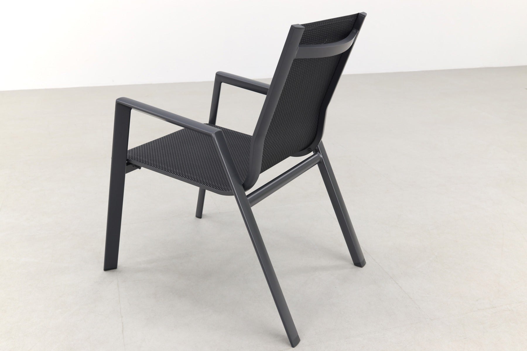 De Napoli diningstoel wordt gekenmerkt door zijn unieke design met strakke vormen. Hierdoor heeft de stoel een mooie moderne uitstraling die in elke tuin past! Het frame van deze stoel is gemaakt van aluminium. Dit is lekker licht van gewicht en onderhoudsvrij. Het aluminium heeft een coating in de kleur Xerix. Door deze coating krijgt het zijn kleuring, maar wordt het frame ook kras- en stootvast. Aluminium heeft als voordeel dat het een lange levensduur heeft, zo kan jij lang genieten van je tuinstoelen! Tussen het aluminium frame in is een doek van textileen gespannen. Door dit textileen heb je geen kussens nodig om comfortabel te zitten!