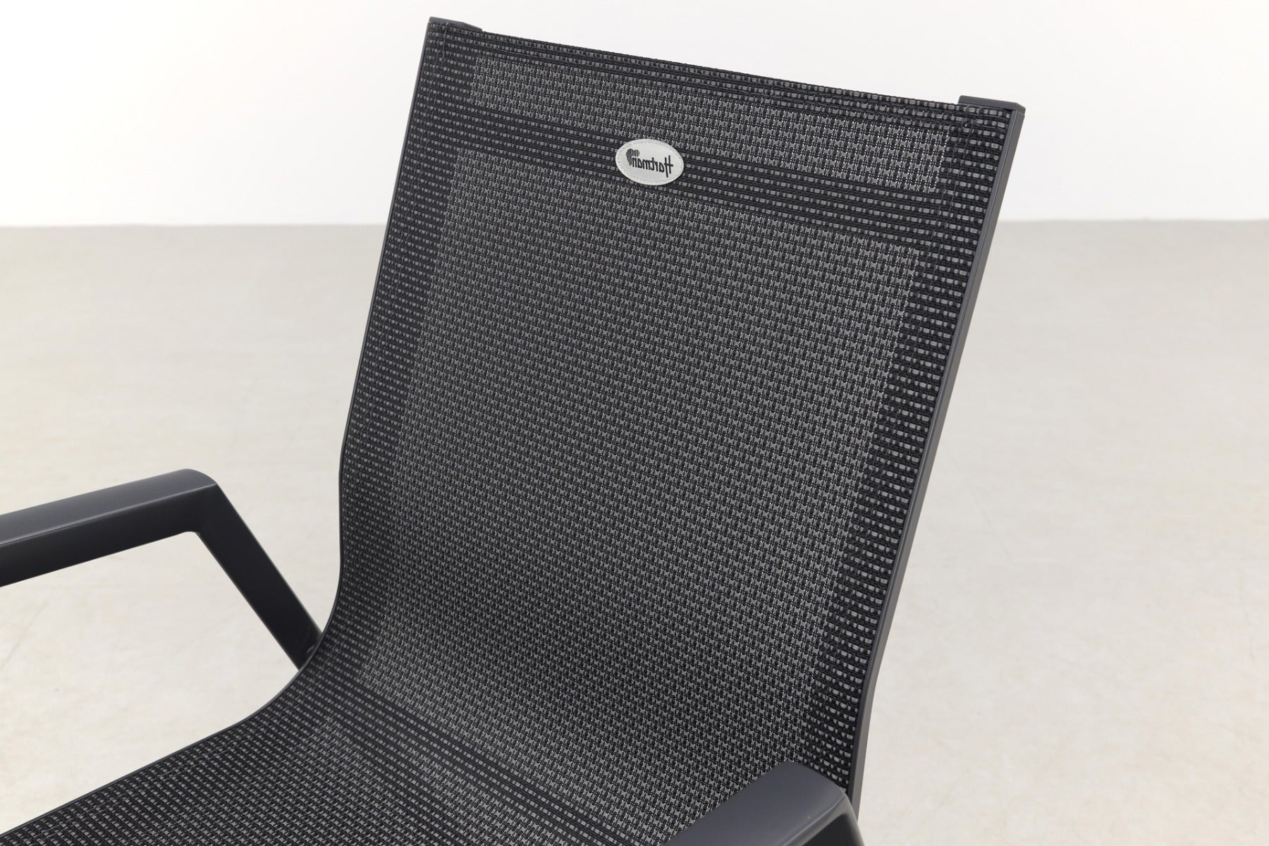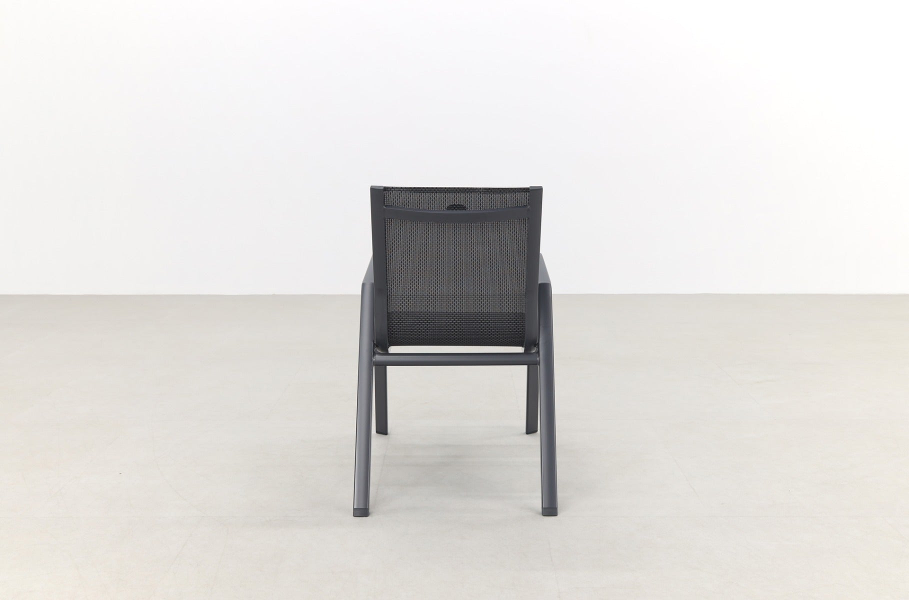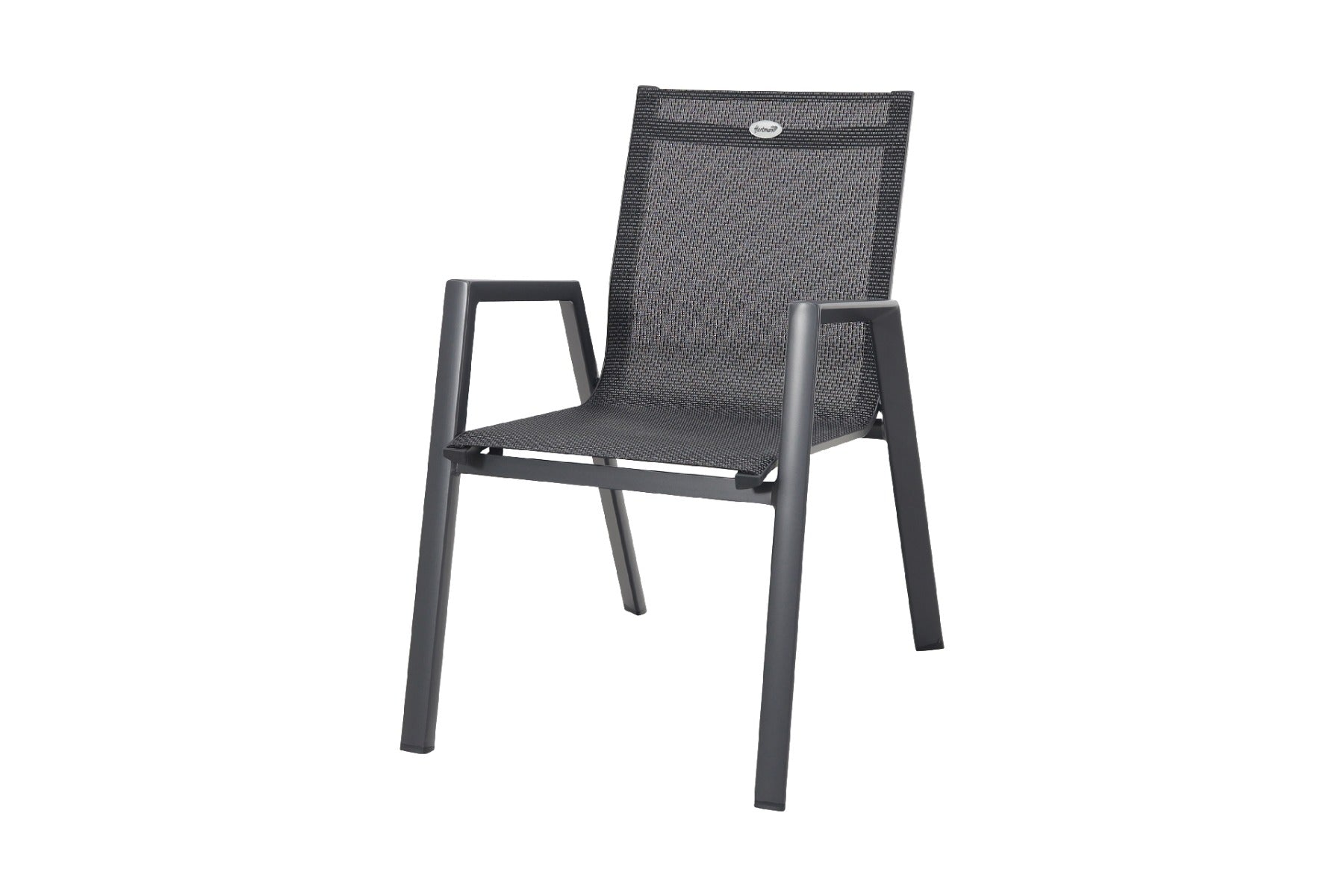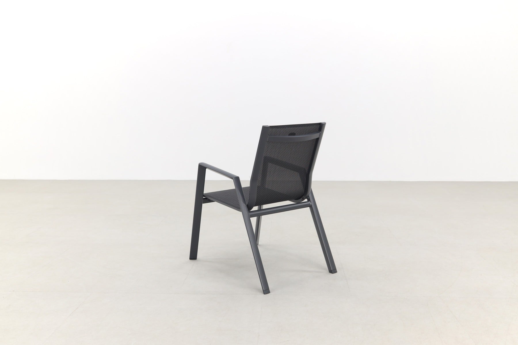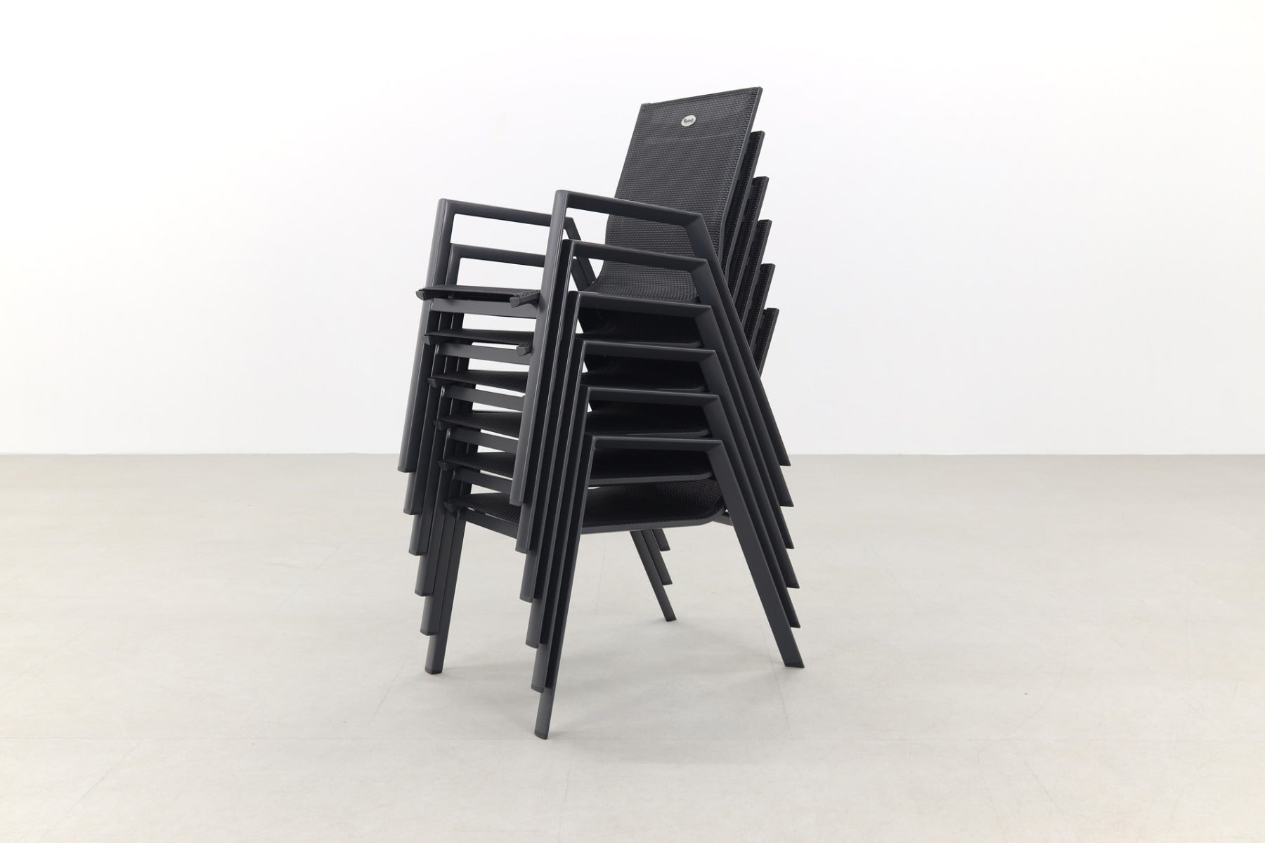 De Napoli diningstoel wordt gekenmerkt door zijn unieke design met strakke vormen. Hierdoor heeft de stoel een mooie moderne uitstraling die in elke tuin past! Het frame van deze stoel is gemaakt van aluminium. Dit is lekker licht van gewicht en onderhoudsvrij. Het aluminium heeft een coating in de kleur Xerix. Door deze coating krijgt het zijn kleuring, maar wordt het frame ook kras- en stootvast. Aluminium heeft als voordeel dat het een lange levensduur heeft, zo kan jij lang genieten van je tuinstoelen! Tussen het aluminium frame in is een doek van textileen gespannen. Door dit textileen heb je geen kussens nodig om comfortabel te zitten!