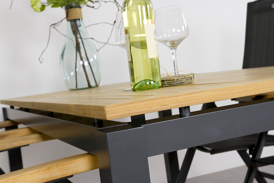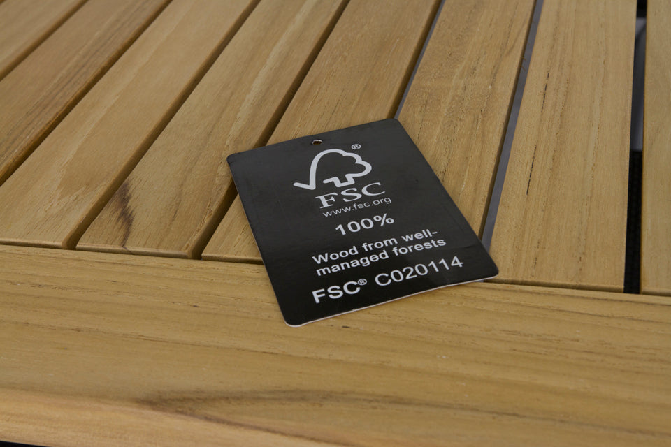 Het tafelblad is gemaakt van 100% FSC-gecertificeerd gerecycled teak. Dit hout leeft: het kan vergrijzen, haarscheurtjes krijgen of iets werken door weersinvloeden, dat hoort erbij. Wil je de warme houtkleur behouden? Dan raden we een teak protector aan. Het aluminium frame is licht, sterk en onderhoudsarm dankzij de duurzame Xerix-coating. Let op: deze tafel mag niet worden afgedekt met een hoes, zodat het hout kan blijven ademen.
