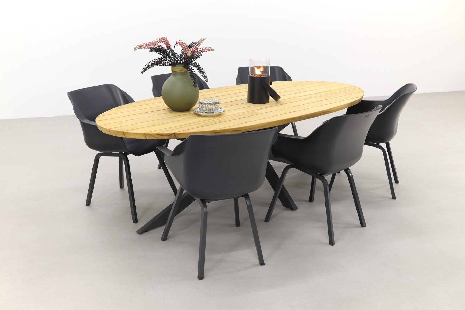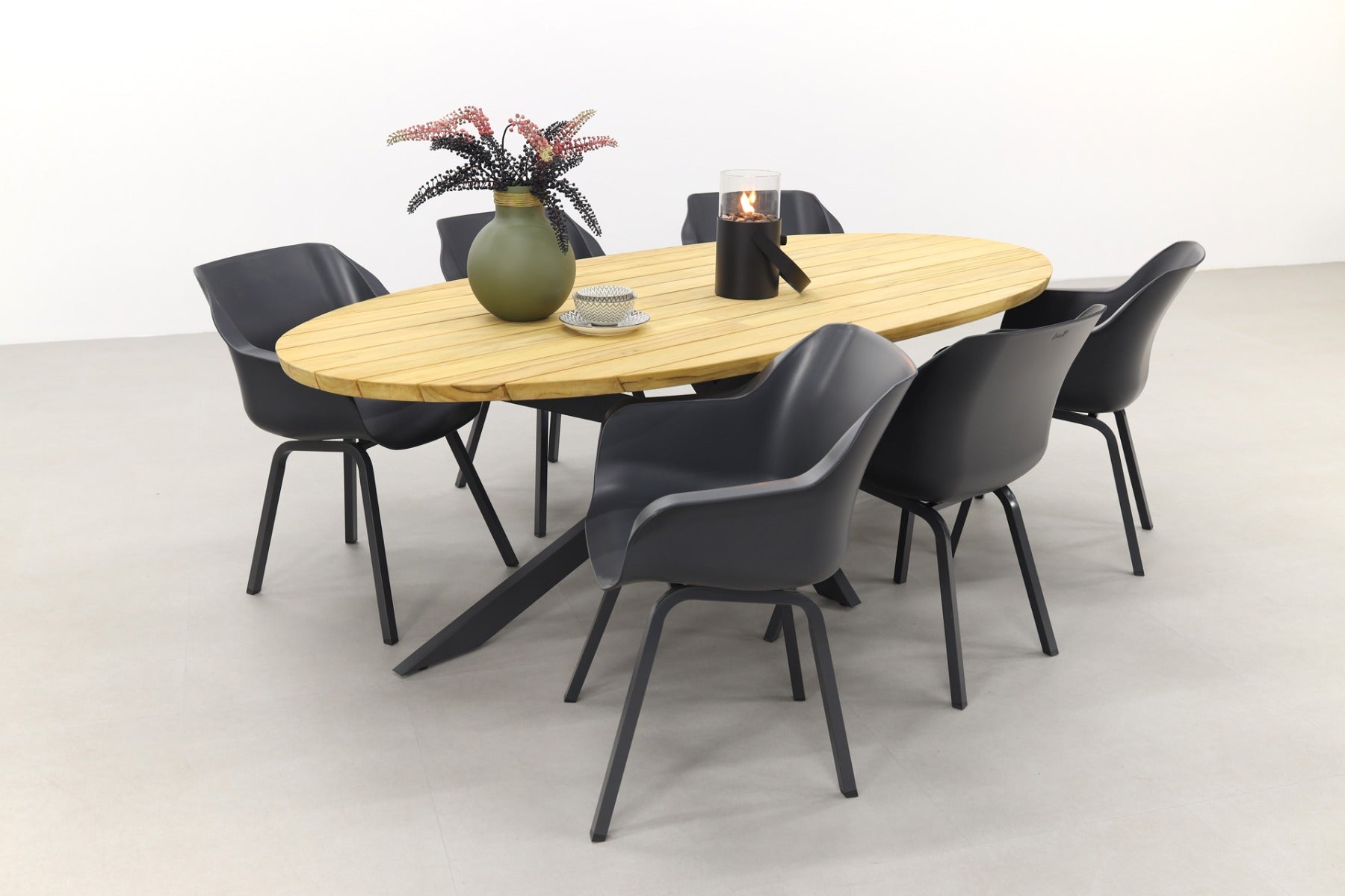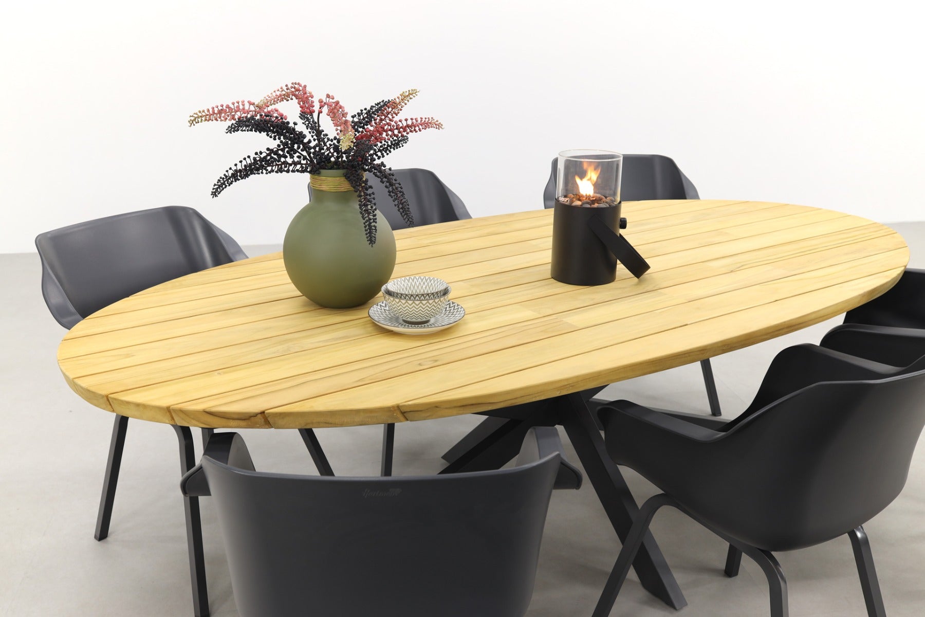 De Prado Ellips tuintafel heeft een uniek onderstel van antraciet aluminium, met daar bovenop een teakhouten tafelblad in ovale vorm. De Sophie Element tuinstoelen van Hartman in de kleur Xerix passen hier perfect bij.