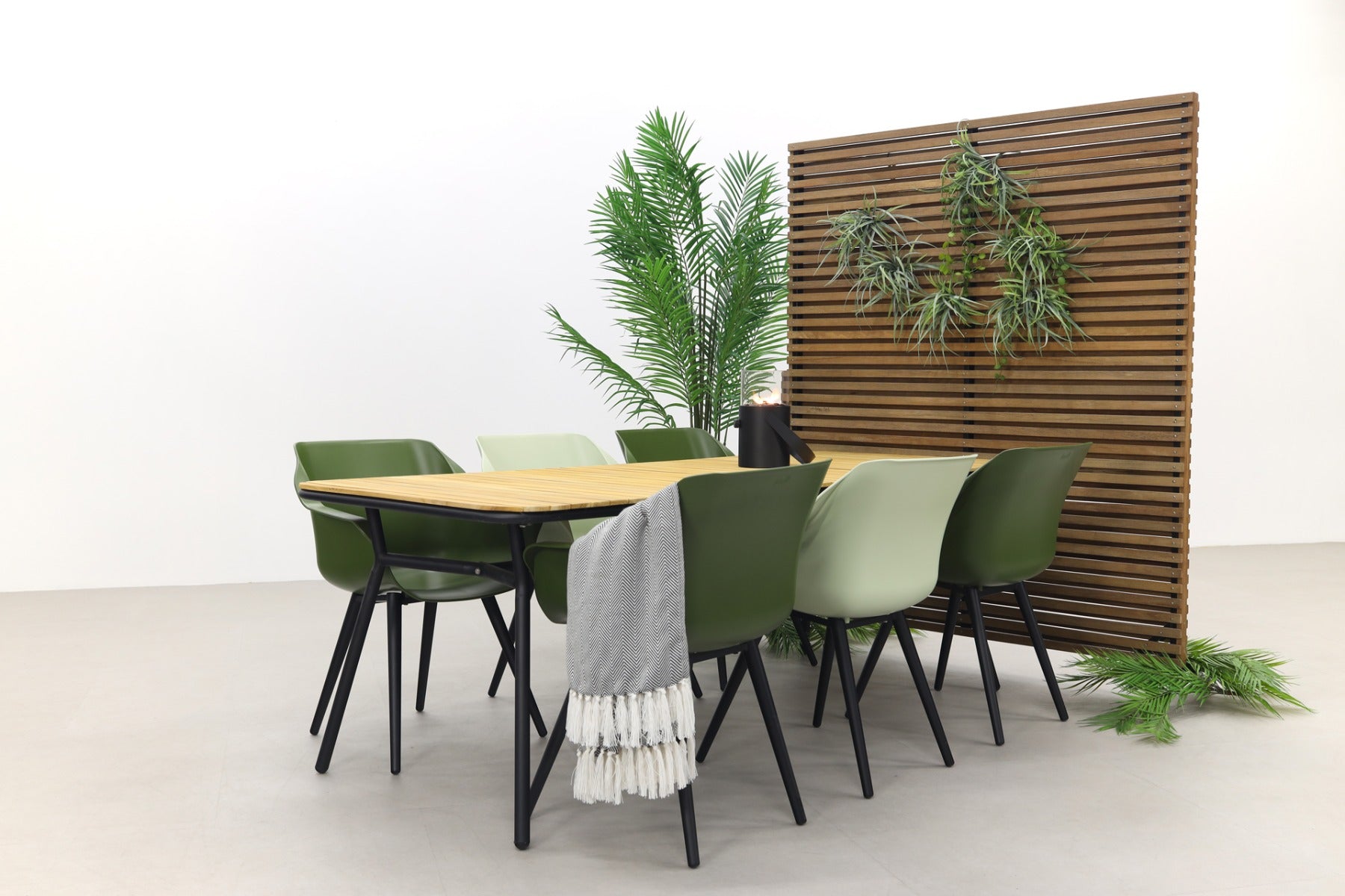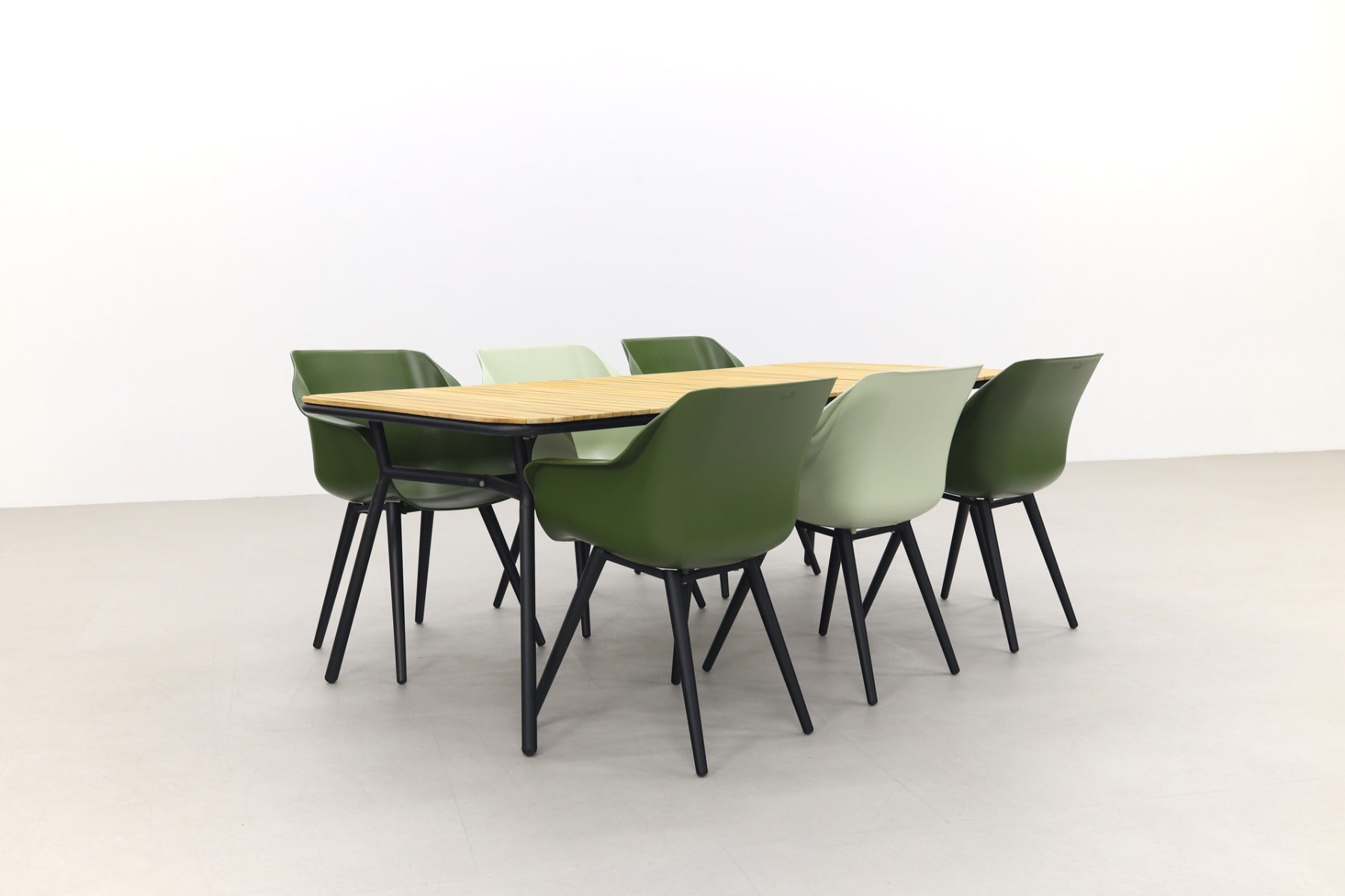 Zoek jij een hippe tuinset met een frisse uitstraling? Dan zit je met deze Sophie/Bella tuinset helemaal goed! Dit komt niet alleen door het hoge zitcomfort van de Sophie Studio stoelen, ook door de prachtige vormgeving van deze tuinset. Zo is de Bella tuintafel een plaatje om naar te kijken door het slanke onderstel met het tafelblad van verschillende latjes teakhout. Voeg daar de Sophie Studio tuinstoelen van Hartman aan toe en je plaatje is compleet. De stoelen worden toegevoegd in de kleuren Moss Green en French Green. Een prachtige combinatie van donker groen en mint groen, hierdoor heb jij een echte blikvanger in je tuin staan! Deze tuinset heeft ruimte genoeg voor 6 personen. Ideaal voor een groot gezin of heel veel vrienden of familie! Steek die barbecue maar vast aan, want bestellen kan direct online!