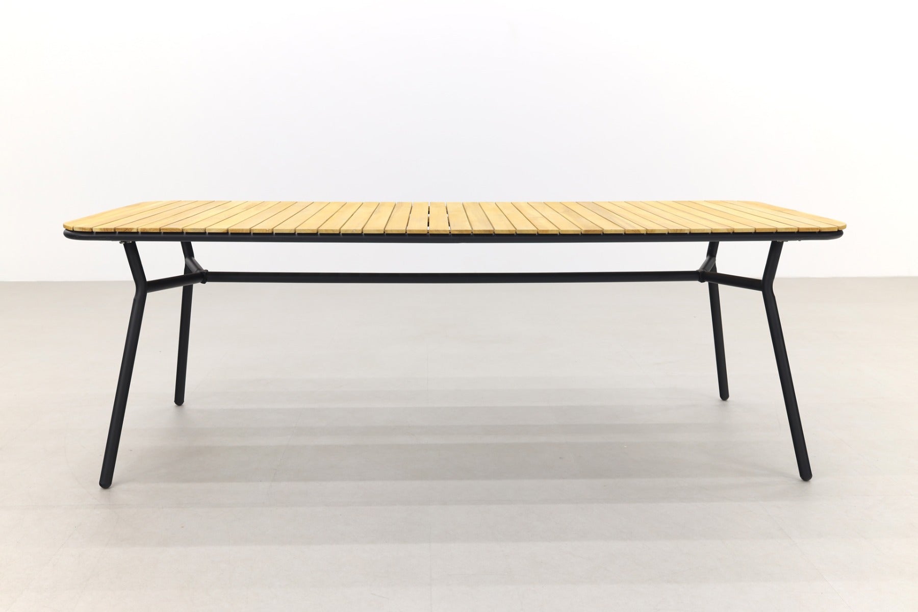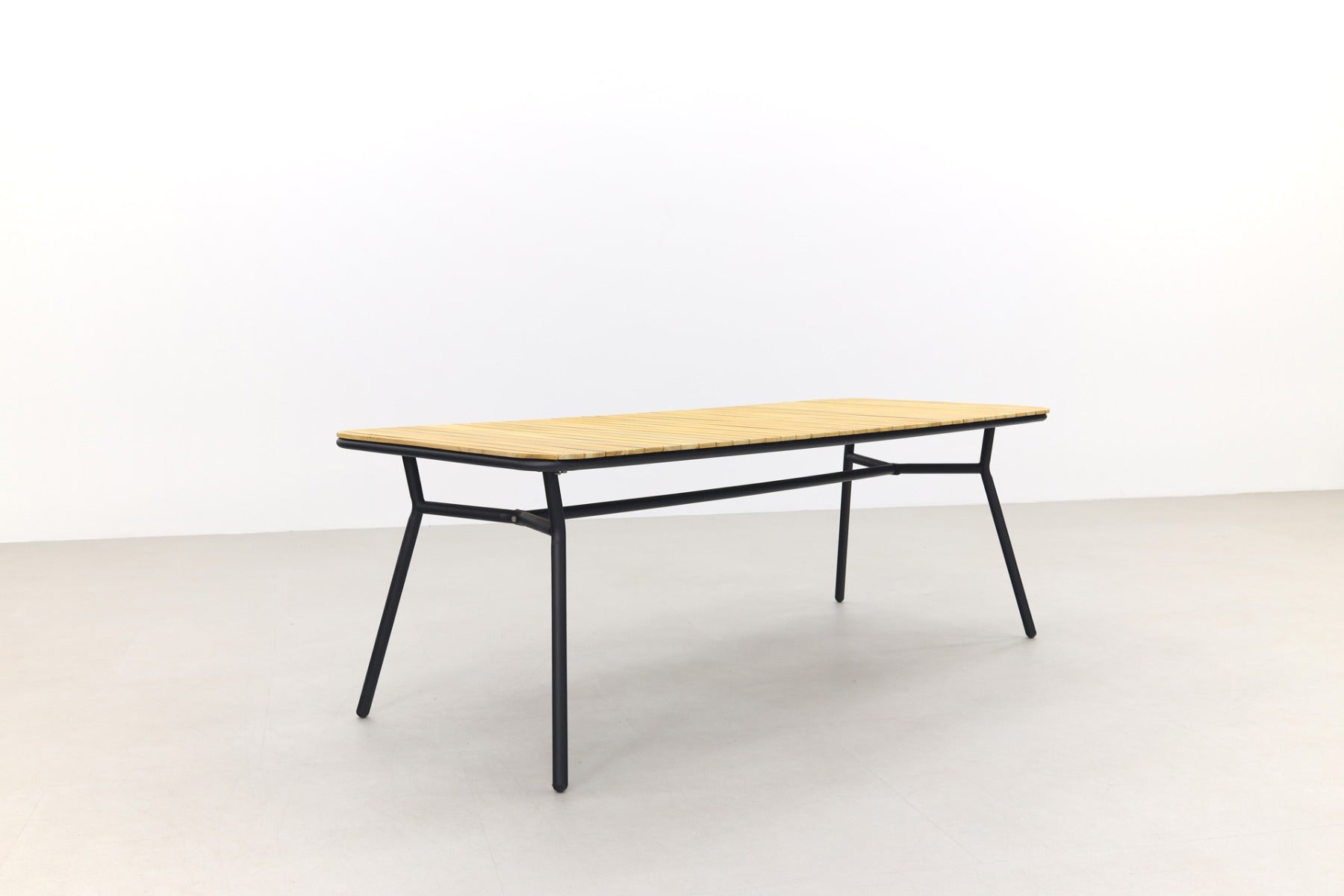 De Bella tuintafel wordt gekenmerkt door het minimalistische design van de mooie zwarte poten. Het onderstel is gemaakt van staal en afgewerkt met een zwarte coating. Het frame heeft een bijzonder design, waardoor de tafel direct opvalt! Het tafelblad is gemaakt van kleine teakhouten latten. Deze dunne latten zorgen ervoor dat het minimalistische helemaal wordt doorgetrokken. Teakhout heeft van nature de eigenschap om nog door te werken. Het houten tafelblad zal hierdoor nog gaan vergrijzen. Mocht je liever de originele kleur willen behouden raden wij aan om het tafelblad te behandelen met een teak protector. Om ervoor te zorgen dat je tafel vuil- en waterafstotend wordt kan je een teak shield gebruiken. Teakhout heeft de mogelijkheid nodig om te ademen. Wij raden hierdoor af om de tafel af te dekken met een afdekhoes.