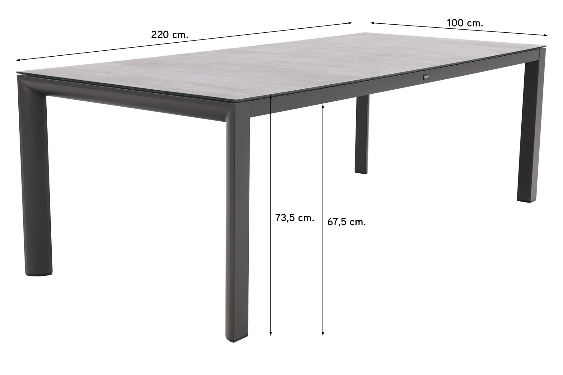 De Baltimor tuintafel biedt met zijn lengte van 220 cm. plaats aan 6 personen. Je kan eventueel met 8 personen dineren door gebruik te maken van de kopse kanten van de tafel. Het frame van de Baltimor tuintafel is vervaardigd uit gepoedercoat aluminium. Aluminium heeft als voordeel dat het licht in gewicht is, weinig onderhoud nodig heeft en jarenlang meegaat. Het tafelblad van de Baltimor tuintafel is gemaakt van "ceramic on glass". Dit is een keramiek laagje dat op een geharde glasplaat wordt aangebracht. Beide materialen zijn bestand tegen diverse weersinvloeden en perfect geschikt voor gebruik buitenshuis. Wanneer het tafelblad vies is geworden kun je deze het beste schoonmaken met water en een zachte doek. Voor een grote schoonmaakbeurt kun je een neutraal reinigingsmiddel toevoegen. Gebruik voor het schoonmaken nooit schuurmiddelen zoals een schuursponsje. Dit kan namelijk vegen en vlekken veroorzaken die er niet meer uit gaan. Gebruik nooit een hogedrukreiniger. Door de hoge waterdruk kan het materiaal aangetast worden.