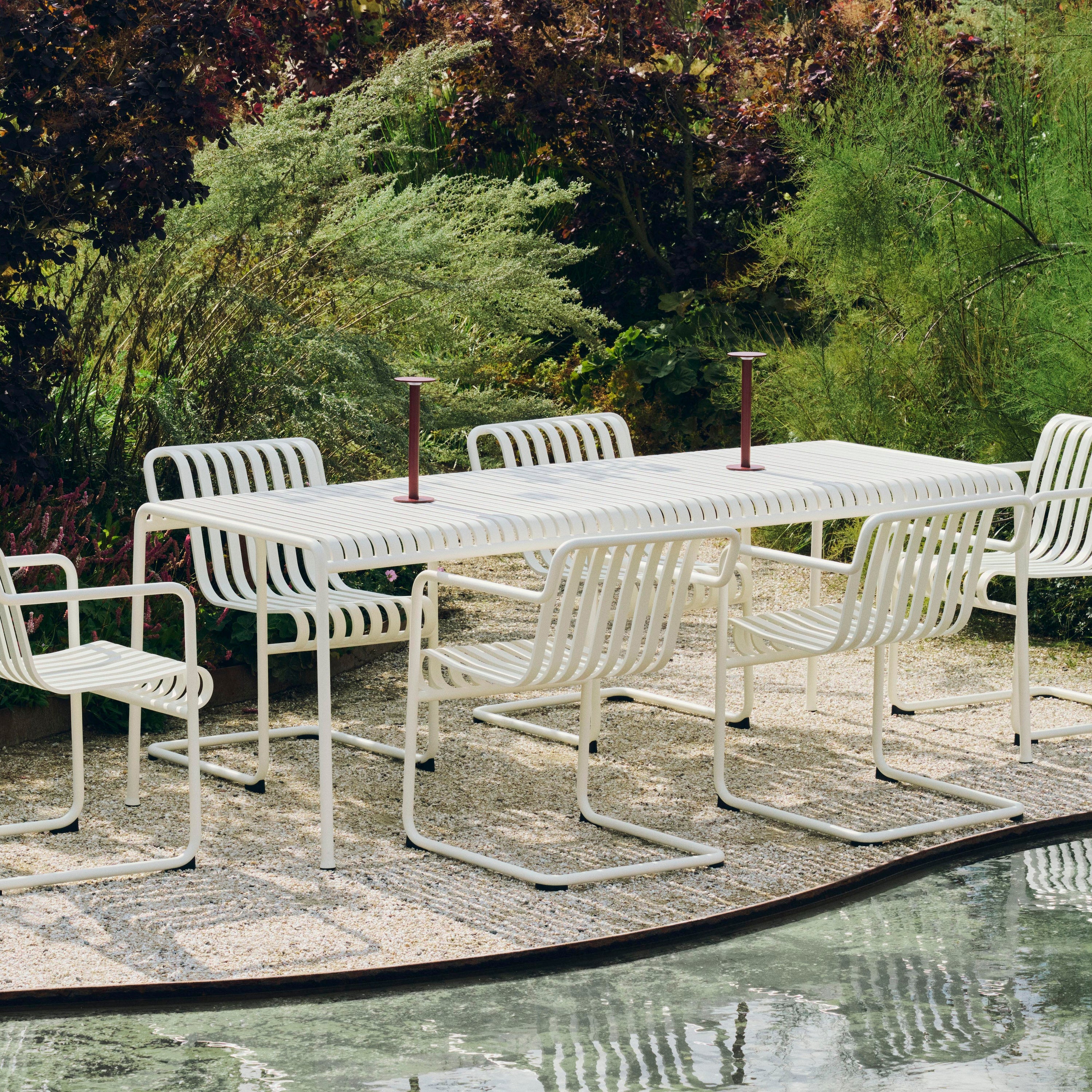 Palissade, maar dan met lef De Cantilever-serie van HAY is een gedurfde doorontwikkeling van het iconische Palissade ontwerp van Ronan & Erwan Bouroullec. Waar andere stoelen staan, lijkt deze te zweven. De buizen volgen geen vaste lijn, maar dansen als het ware door het ontwerp — strak en licht tegelijk. De kracht van deze serie zit in de balans: robuust staal met een verfijnde curve, comfort zonder kussens, elegantie zonder opsmuk. Dankzij het zwevende frame veren de stoelen subtiel mee en voelt elke zitbeweging verrassend licht. Het resultaat? Buitenmeubilair dat net zo goed aanvoelt als het eruitziet.