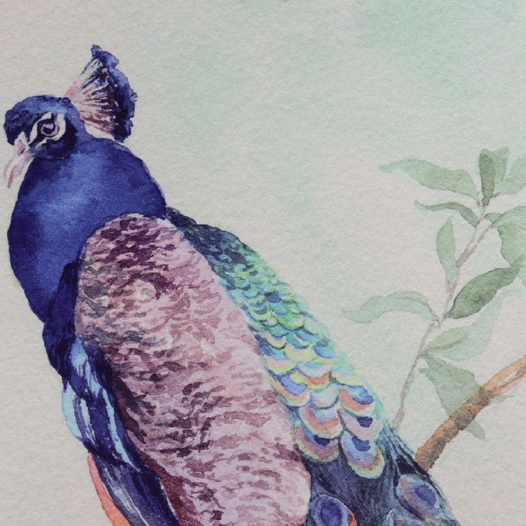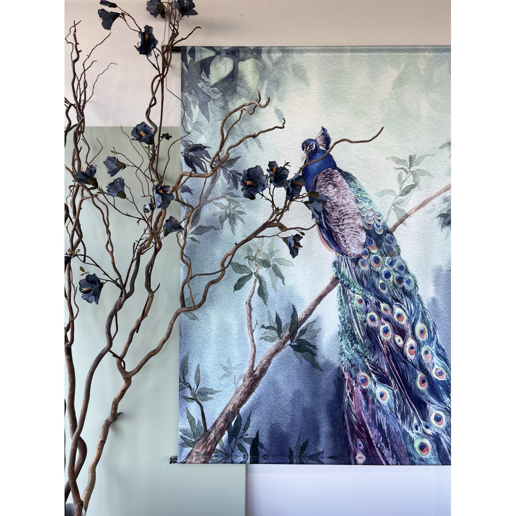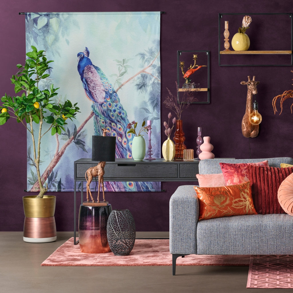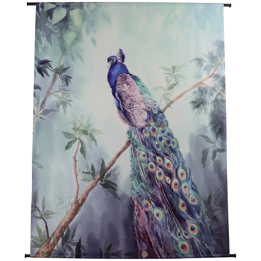 Dit wandkleed van luxe velvet toont een trotse pauw in elegante pastelkleuren. • 170 cm hoog en 140 cm breed • Inclusief roede en wandhaken