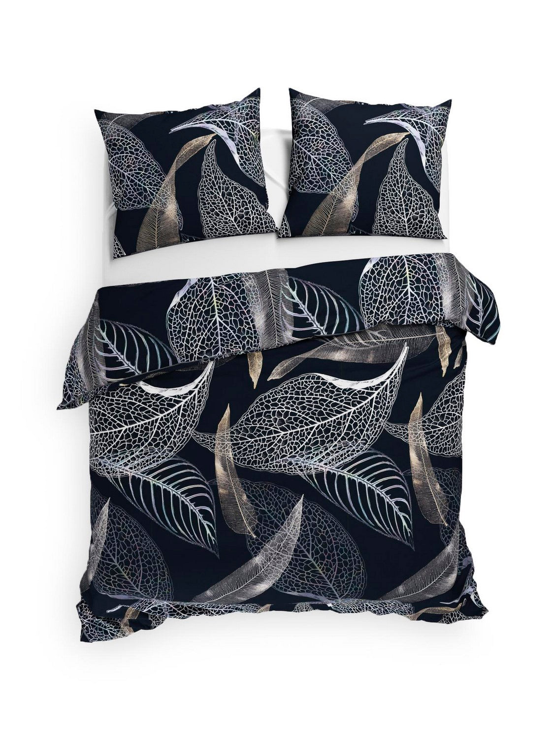 Dekbedovertrek Liba is zwart en heeft een print met verschillende bladeren in donkere kleuren. Op het overtrek is alleen het skelet van bladeren zichtbaar in witte omlijning. Dit geeft een chique uitstraling. Vervaardigd uit 100% hoogwaardig katoen-flanel. Flanel is een fijne stof, omdat het zich snel aan jouw lichaamstemperatuur aanpast. Het materiaal is sterk en vochtabsorberend. Voorzien van een dubbel doorlopende instopstrook. Hierdoor ook geschikt voor extra hoge matrassen.
