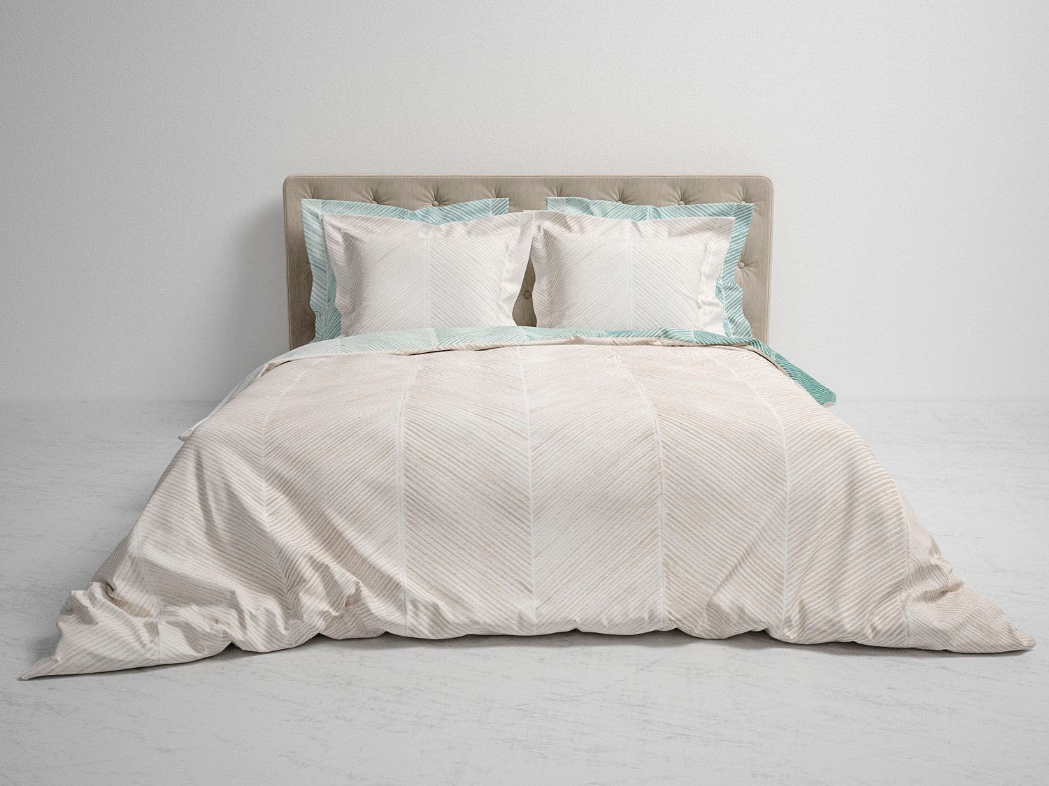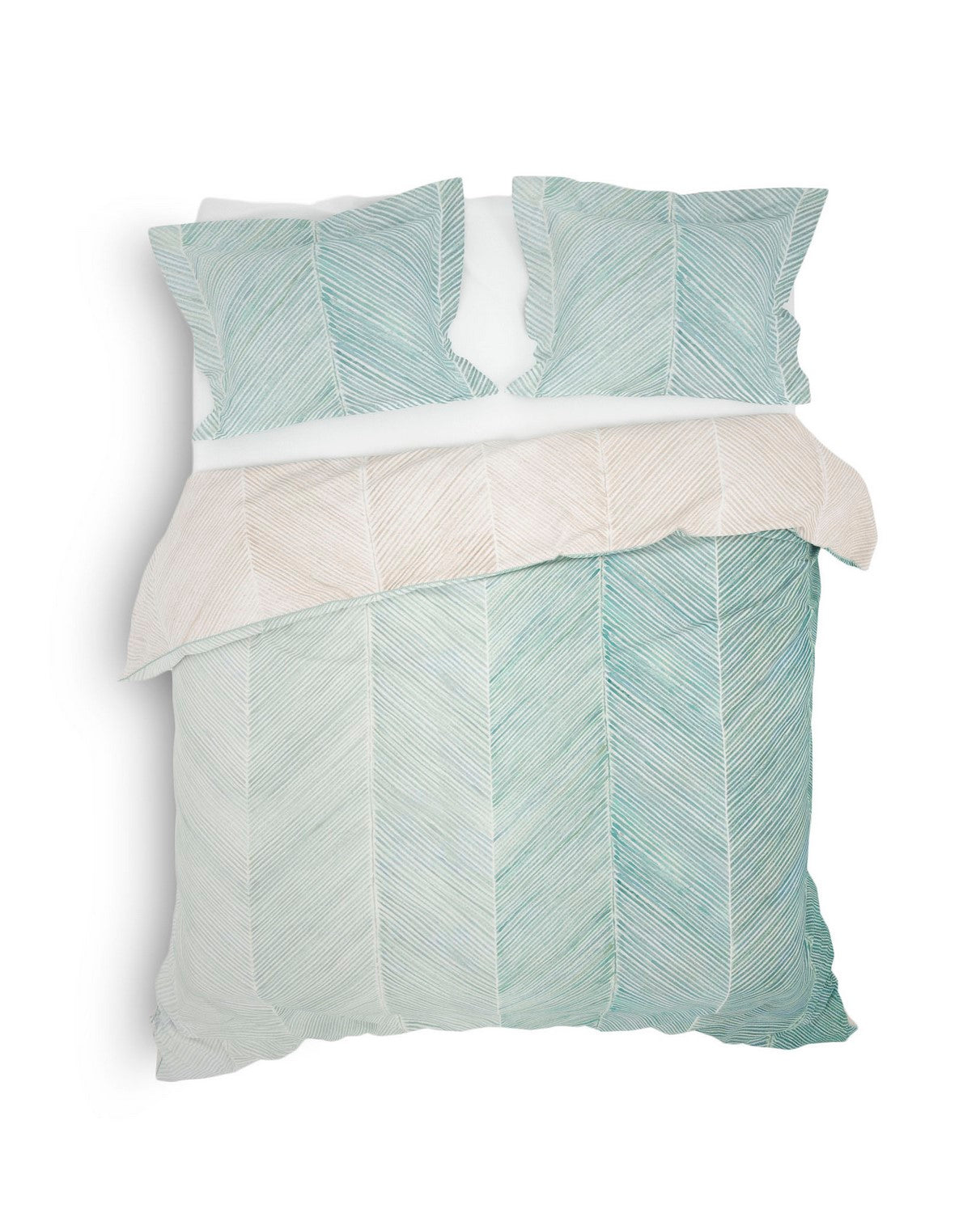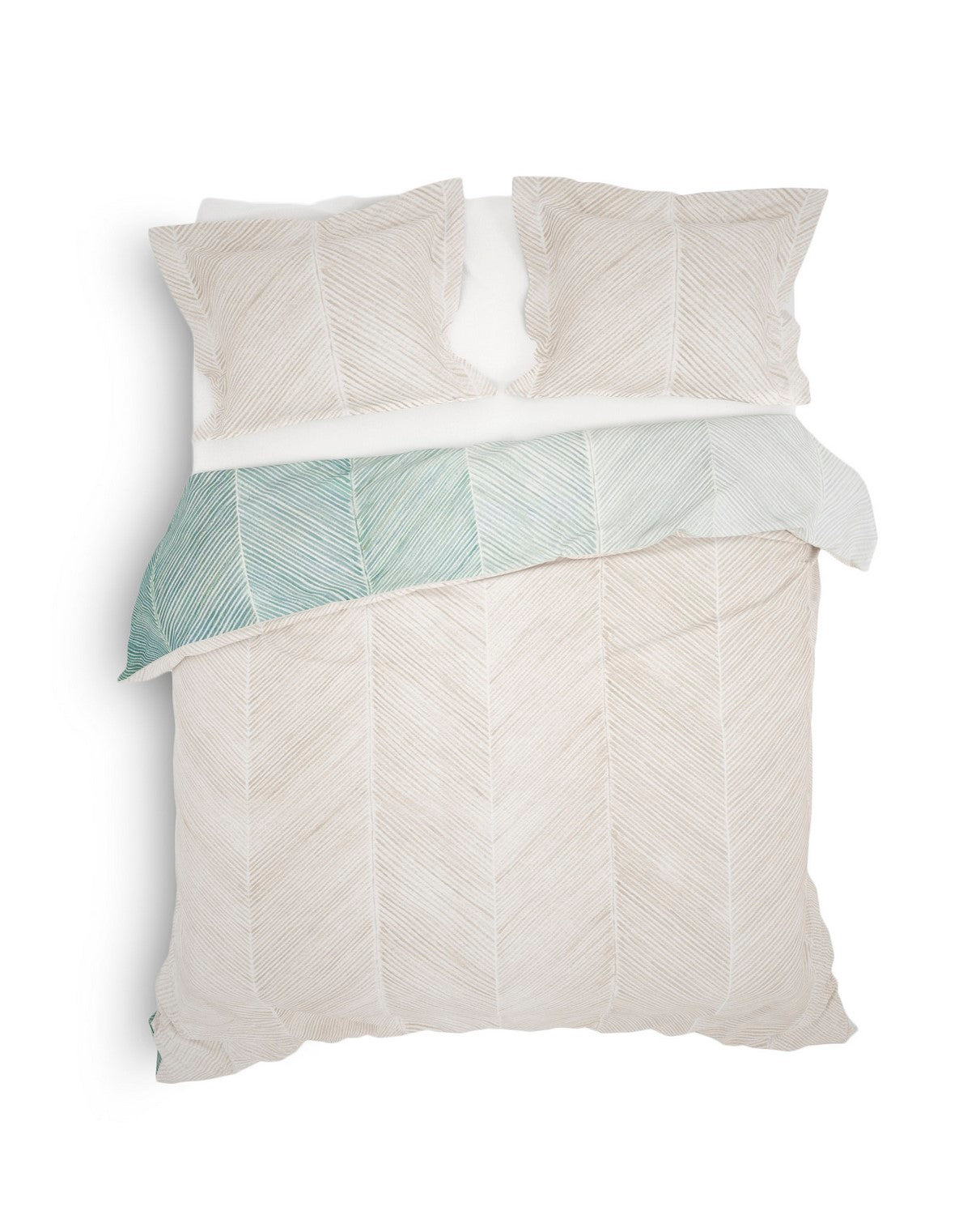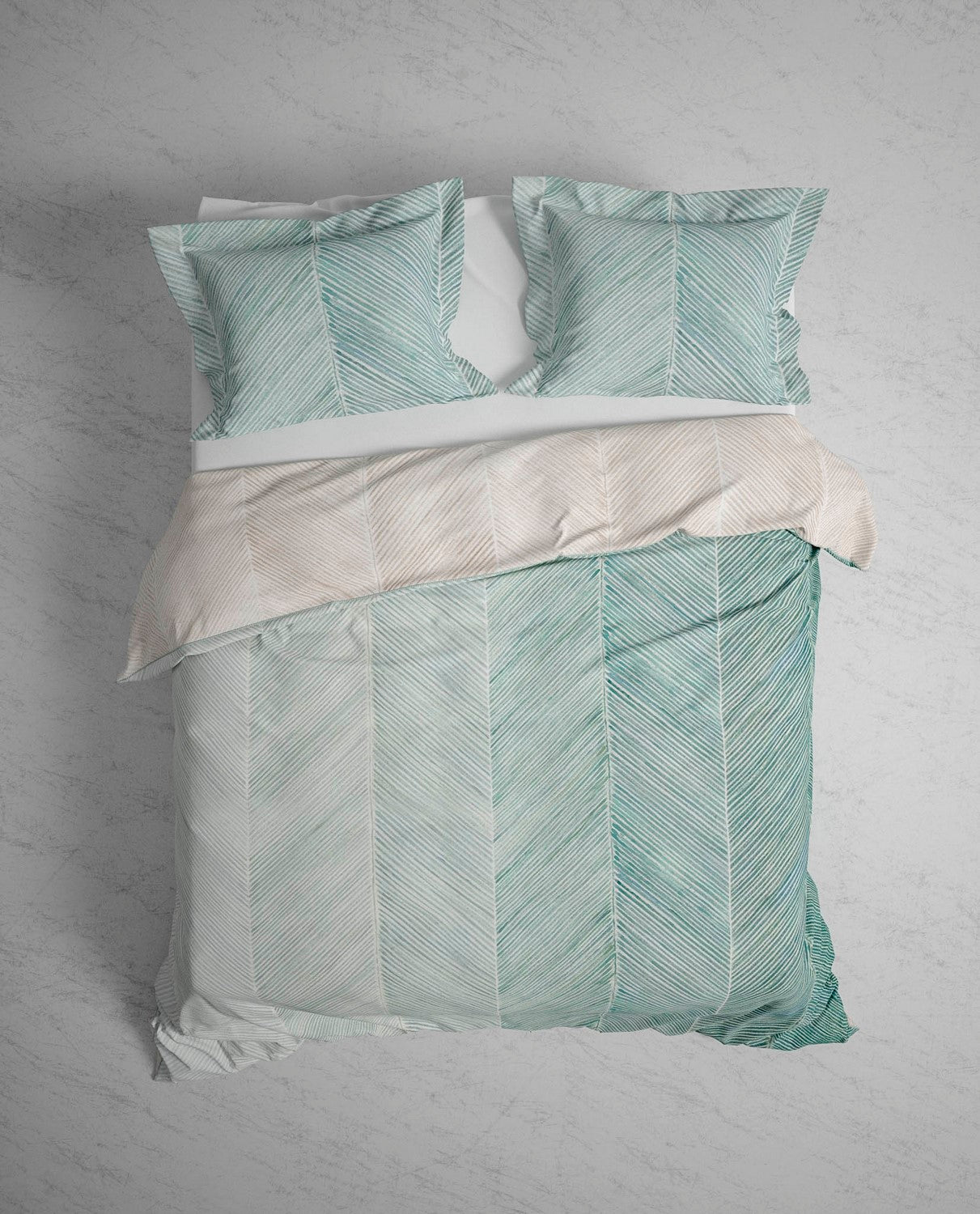 Dit prachtige dubbelzijdige dekbedovertrek luistert naar de naam Ramon en is van het merk Heckett & Lane. Aan de voorzijde loopt het verfijnde visgraatpatroon van een licht groene kleur over naar een donkere groen/blauwe kleur. Op de achterzijde is dezelfde grafische print te zien, maar dan in wit en beige. Beide zijden zijn zo mooi, dat het bijna zonde is om maar een kant te laten zien. De bijpassende kussenslopen zijn voorzien van dezelfde print en zijn afgewerkt met een Oxford-rand. Daarnaast is het overtrek voorzijn van een dubbele instopstrook, waardoor het ook geschikt is voor extra lange dekbedden. Dit dekbedovertrek ziet er niet alleen mooi uit, maar is ook nog eens gemaakt van 100% katoen-satijn. Dit materiaal voelt heerlijk zacht aan en is ademend en vocht absorberend. Door de satijn binding krijgt het overtrek zijn subtiele glans en komt de print nog beter uit. Daarnaast heeft dit dekbedovertrek ook nog het GOTS (Global Organic Textile Standard) keurmerk.