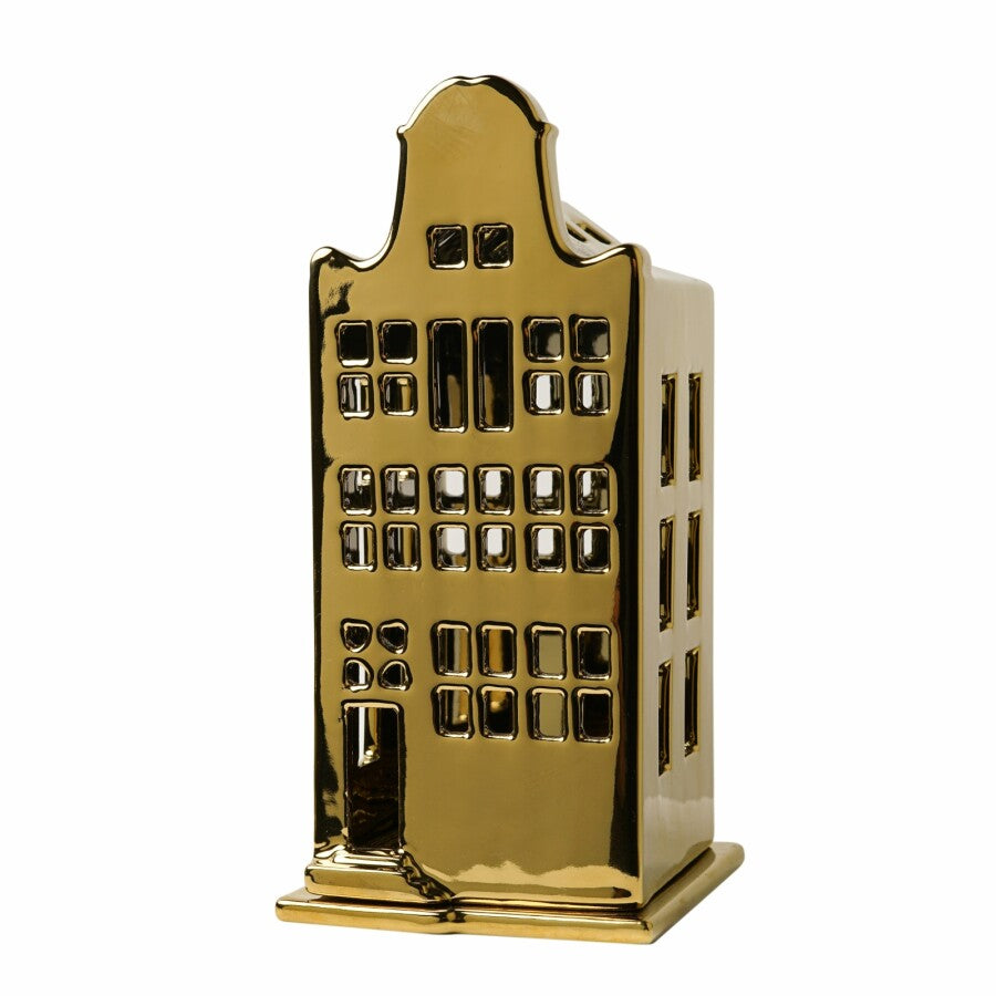 Heinen Delfts Blauw | Waxinelichthouder Huis Klokgevel Goud