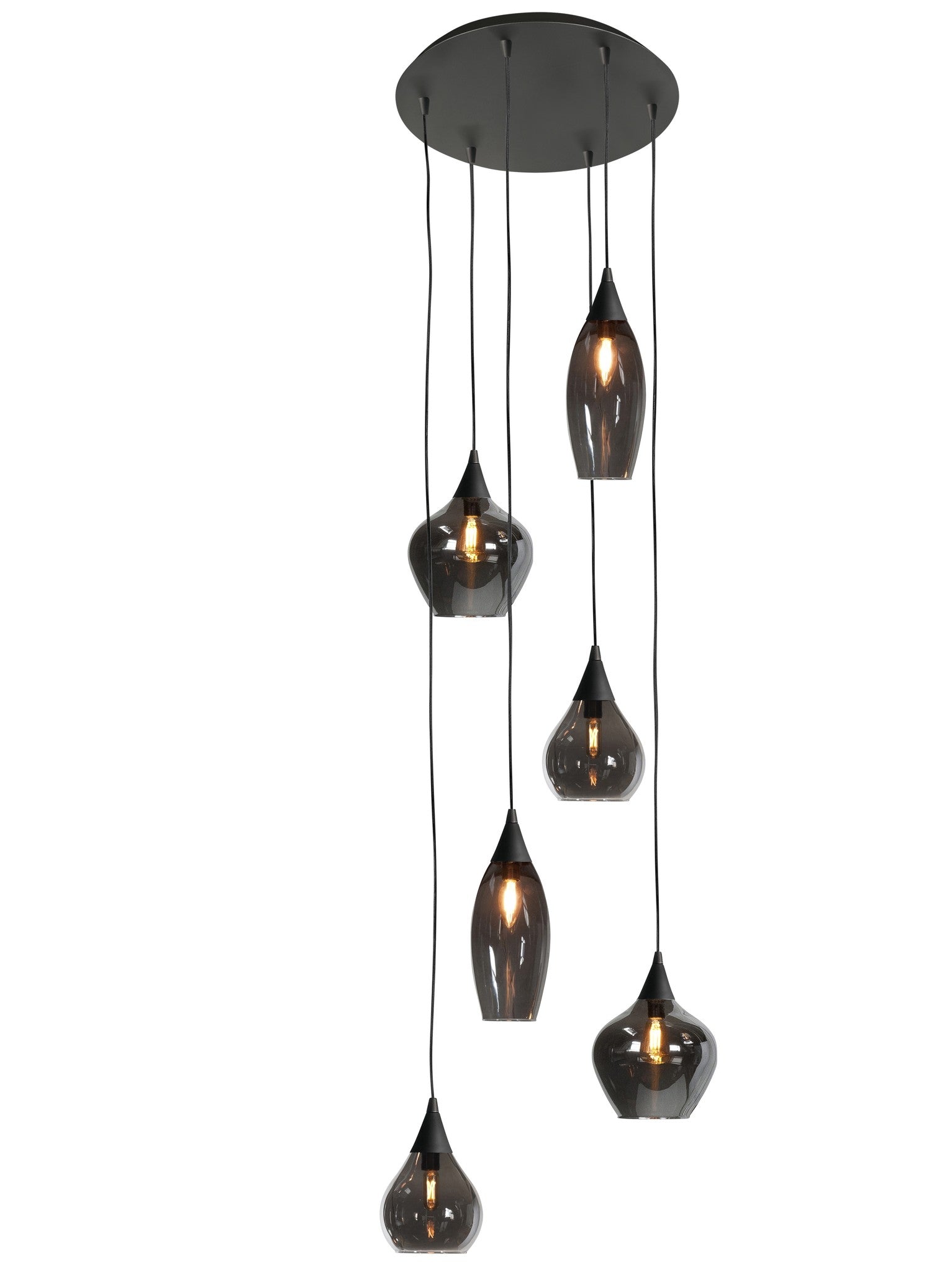 De smoke glazen zijn helemaal hip en echt de nieuwe trend van dit moment! De lampjes zijn bevestigd aan een zwarte plafondplaat van 46cm Ø en zijn makkelijk in hoogte te stellen zodat deze lamp perfect op verschillende plekken toepasbaar is.