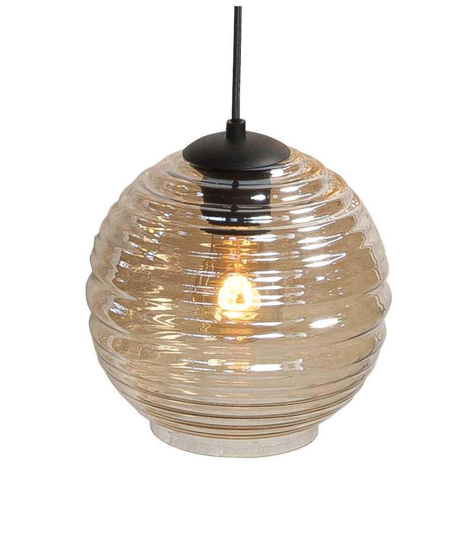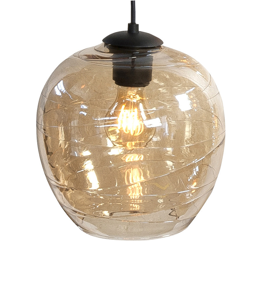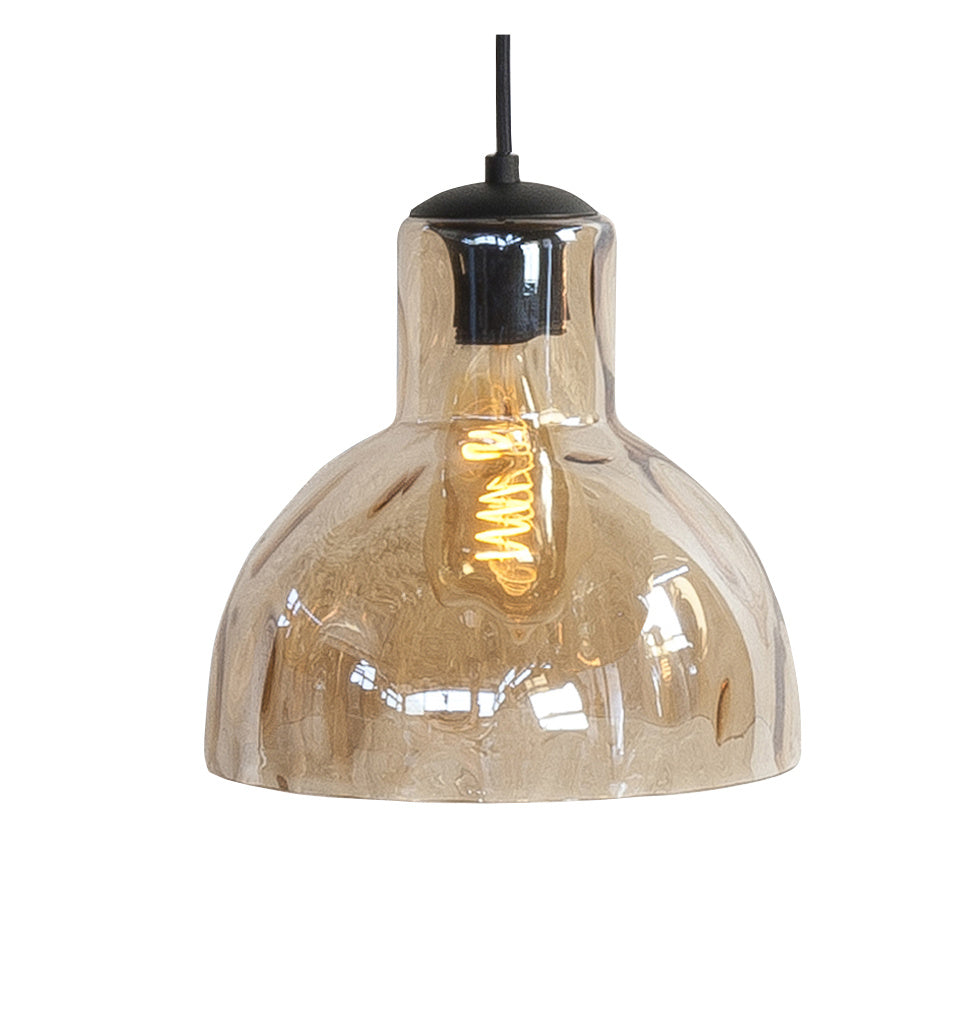 Een unieke hanglamp met acht verschillende amber kleurige glazen is een echte eyecatcher. De lamp wordt geleverd met een mat zwarte plafondplaat van 130 centimeter breed.