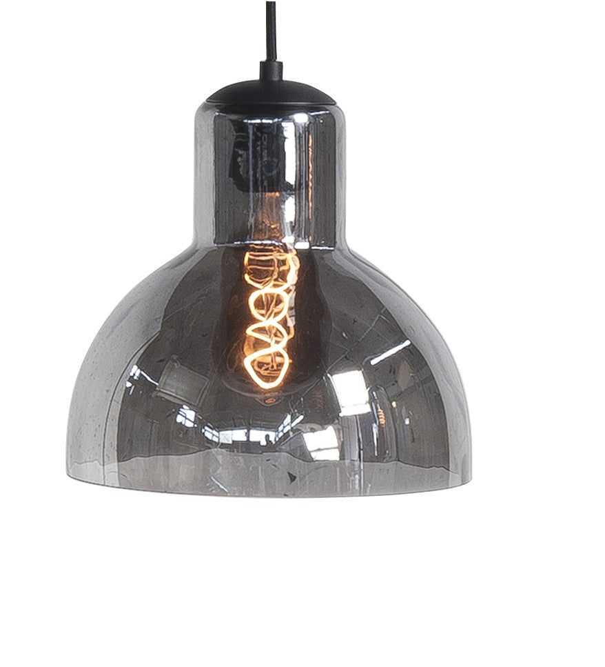 Een unieke hanglamp met zes verschillende smoke glazen is een echte eyecatcher. De lamp wordt geleverd met een mat zwarte plafondplaat van 100 centimeter breed.
