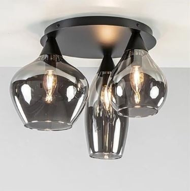 Opzoek naar een trendy plafonniere? Deze speelse plafondlamp is uitgevoerd met 3 verschillende glazen op een subtiele mat zwarte plafondplaat van 32cm doorsnee en de totale hoogte is 37cm.