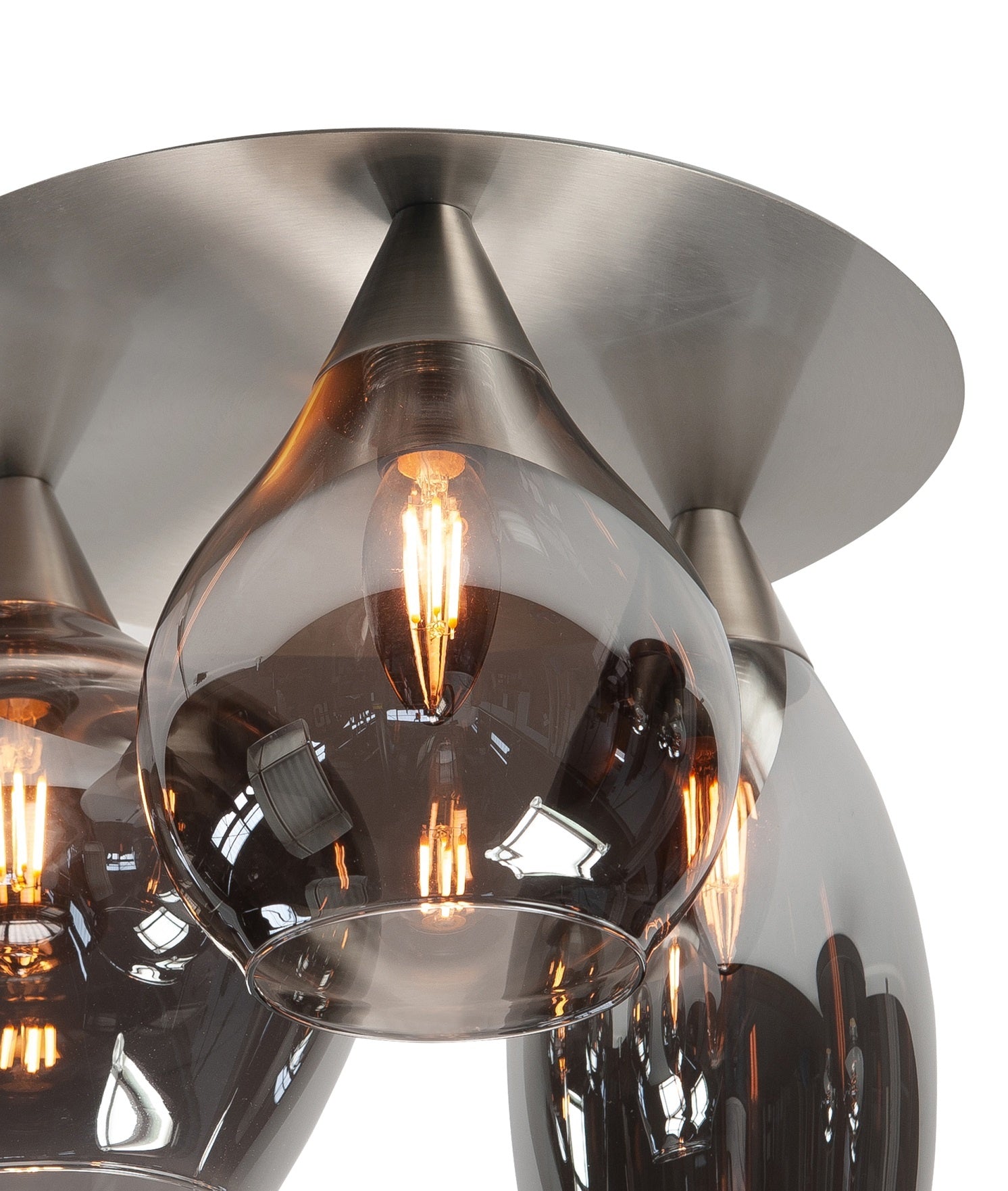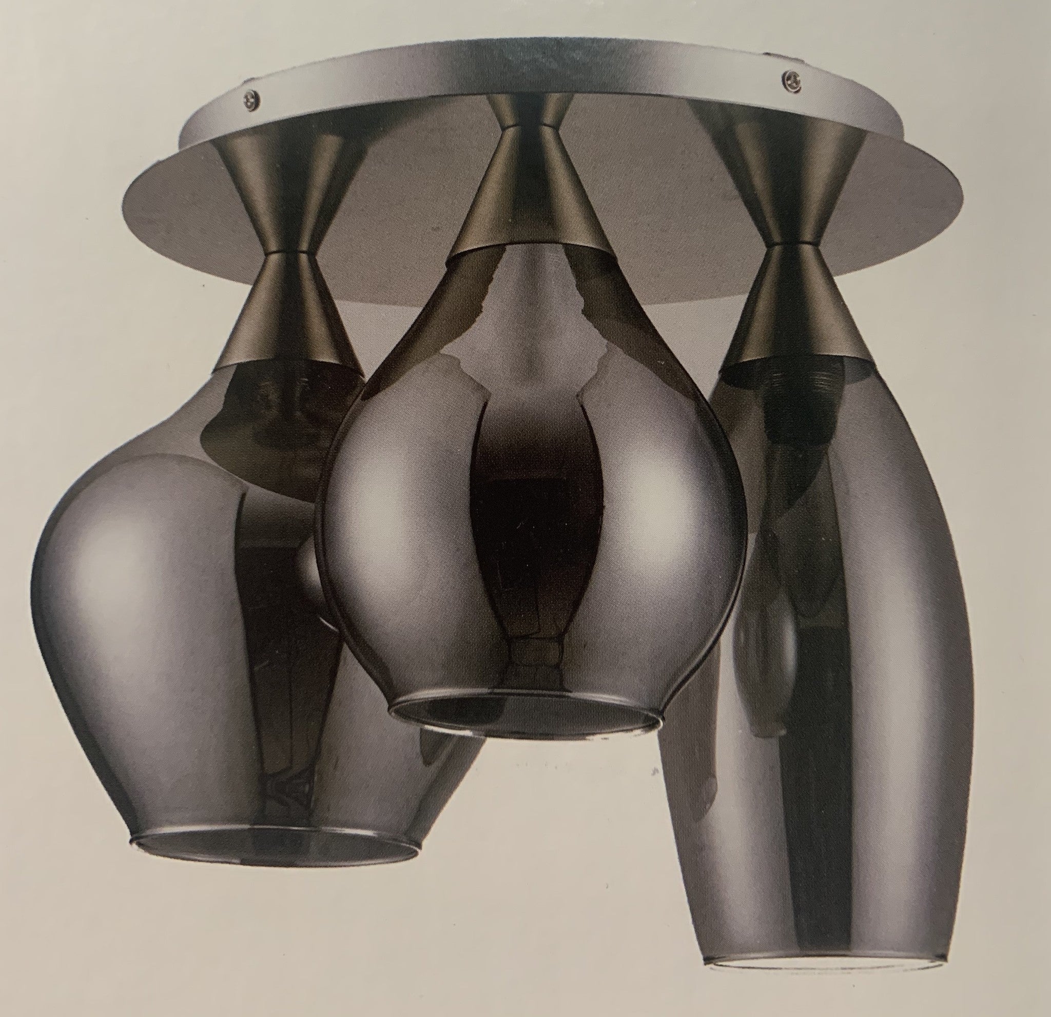 Opzoek naar een trendy plafonniere? Deze speelse plafondlamp is uitgevoerd met 3 verschillende glazen op een subtiele plafondplaat van 32cm doorsnee en de totale hoogte is 37cm.