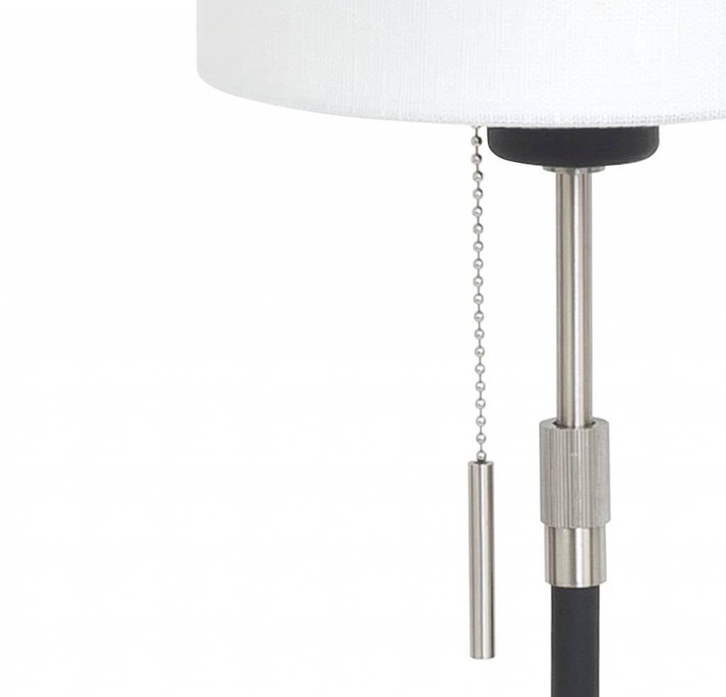 Strakke moderne vloerlamp die is voorzien van een off- white kleurige stoffen kap die in hoogte te stellen is. Ook bevindt zich een trek schakelaar aan de fitting om de lamp aan en uit te zetten.